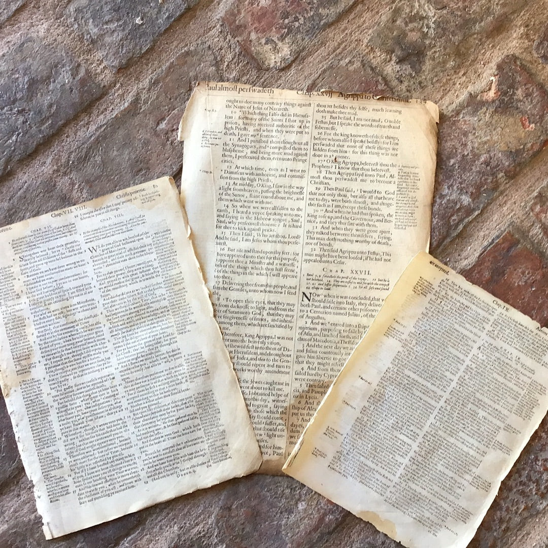 Here at Moon’s we believe in sharing the stories of the items in our store. Our "rescue" bibles are over 400 years old; yet when they came into our possession they were damaged or missing pages. Because there is no better way to preserve their history than by sharing it, we allow customers to purchase individual pages and bring the history of these bibles into their home. Whether you are purchasing for yourself or as a gift for a loved one, these pages make a beautiful and historic addition to any home.