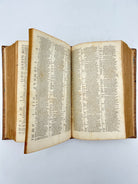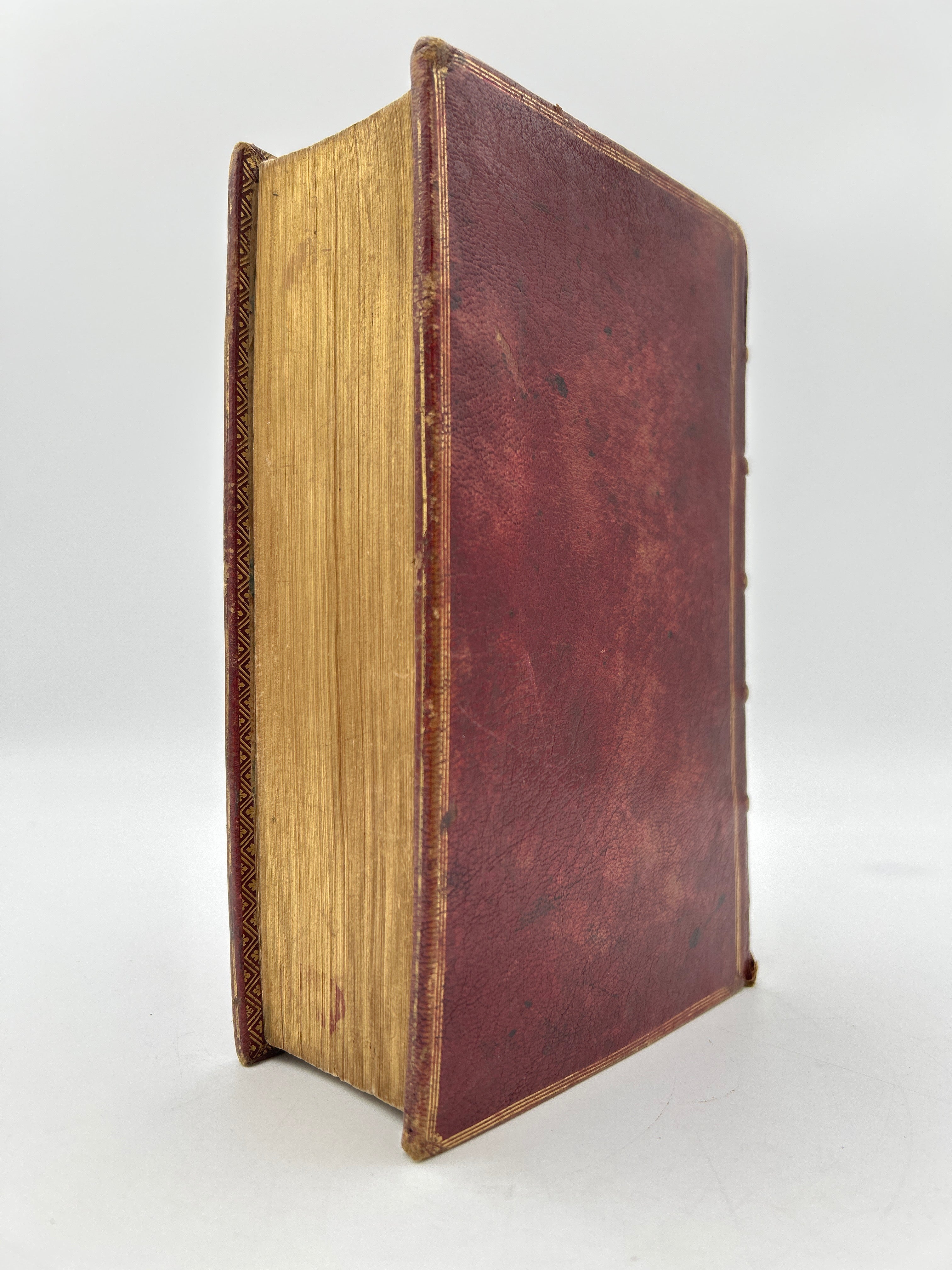 Red Morocco leather, raised bands, gold tooling and titling on spine as well as around edges of covers, marbled paste downs/endpapers, gold edged pages, blue and white sewn endbands, woodcut of Dominican friars. Leather reasonably worn and stained, a few shallow gouges on front cover, wearing on edges minimal with one corner exposed, endbands intact with a few minor torn threads, textblock in great condition with minimal foxing & stains.