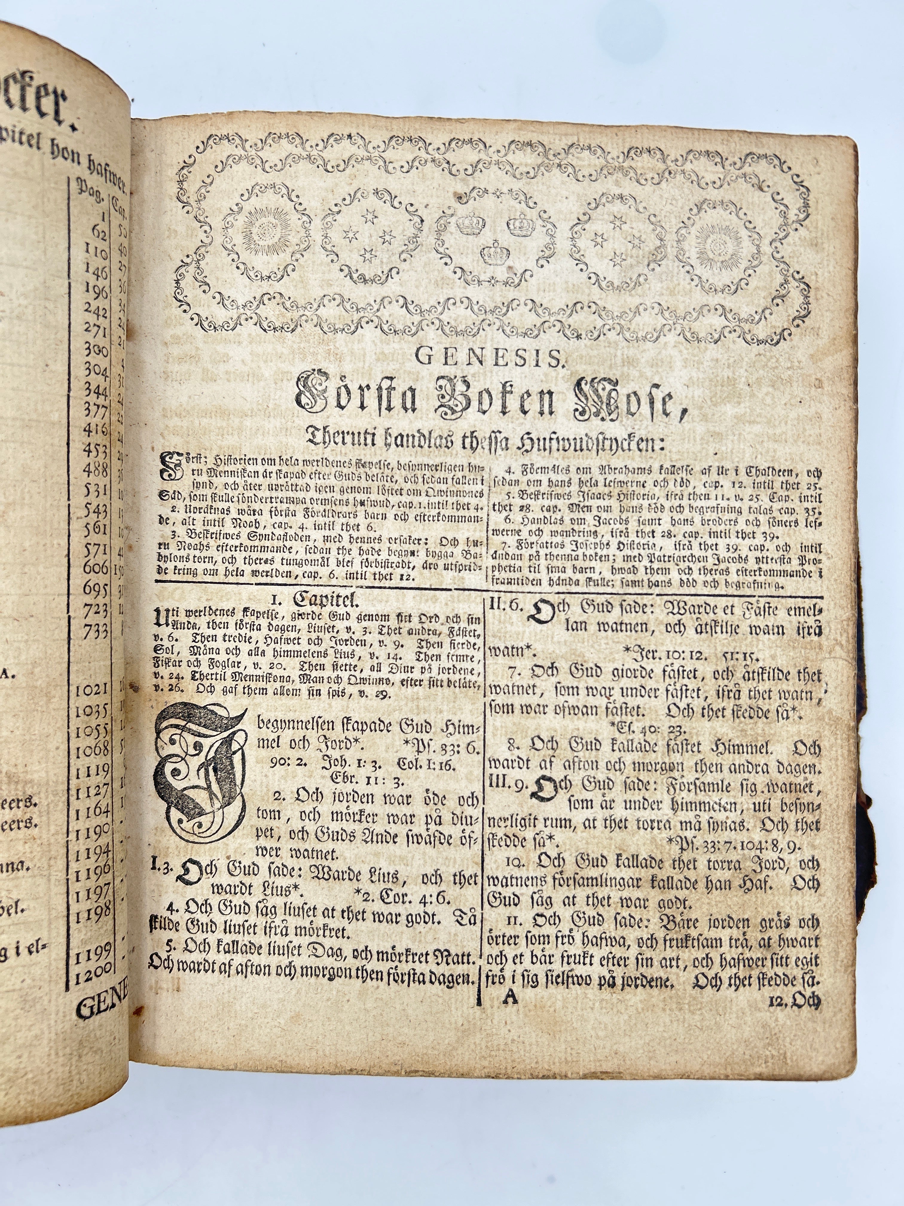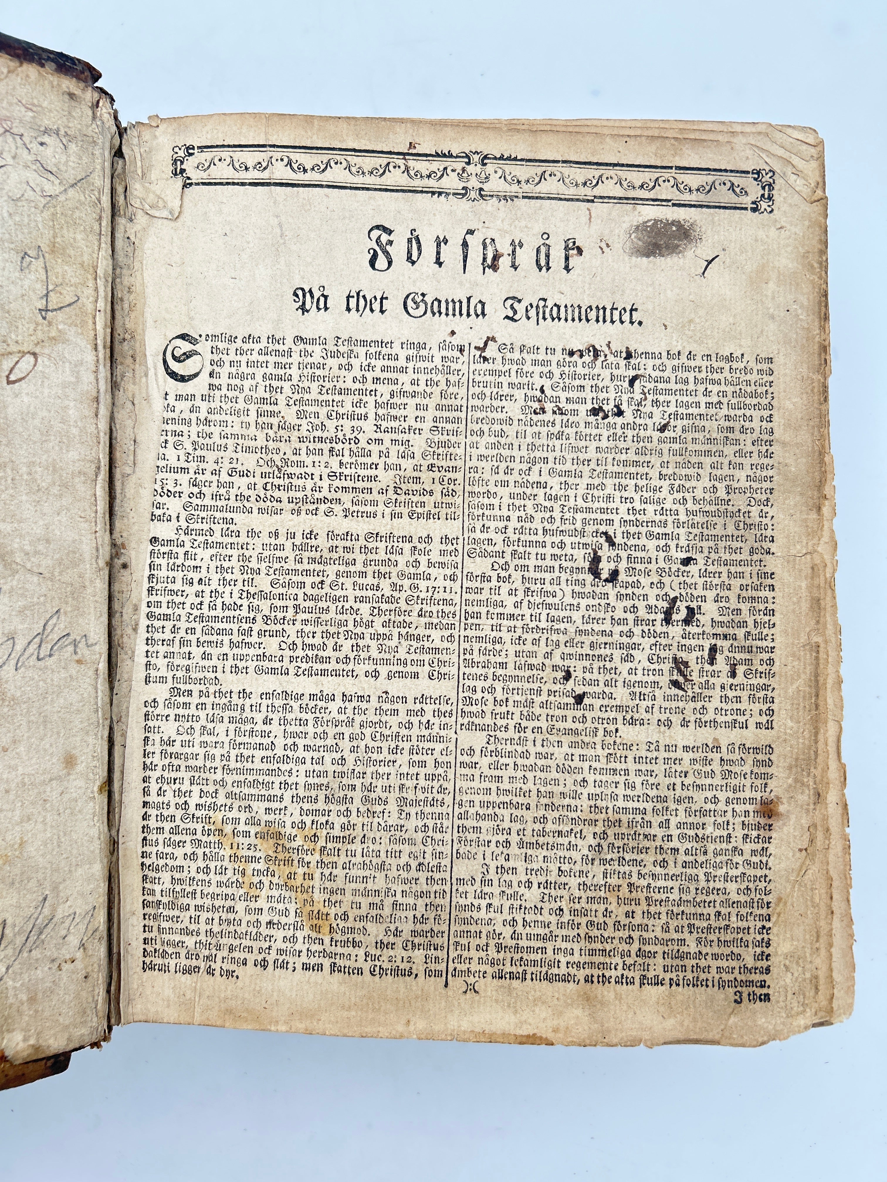 This Bible was printed in Sweden during the 18th century, typically known as the Gustav Vasa Bible or "Gustav Vasas Bibel." The translation was heavily influenced by Martin Luther's German Bible and was originally commissioned by King Gustav I of Sweden in the 16th century. This 1778 edition reflects the language and orthographic standards of its time, and would have been used both for personal devotion and public worship.