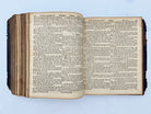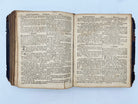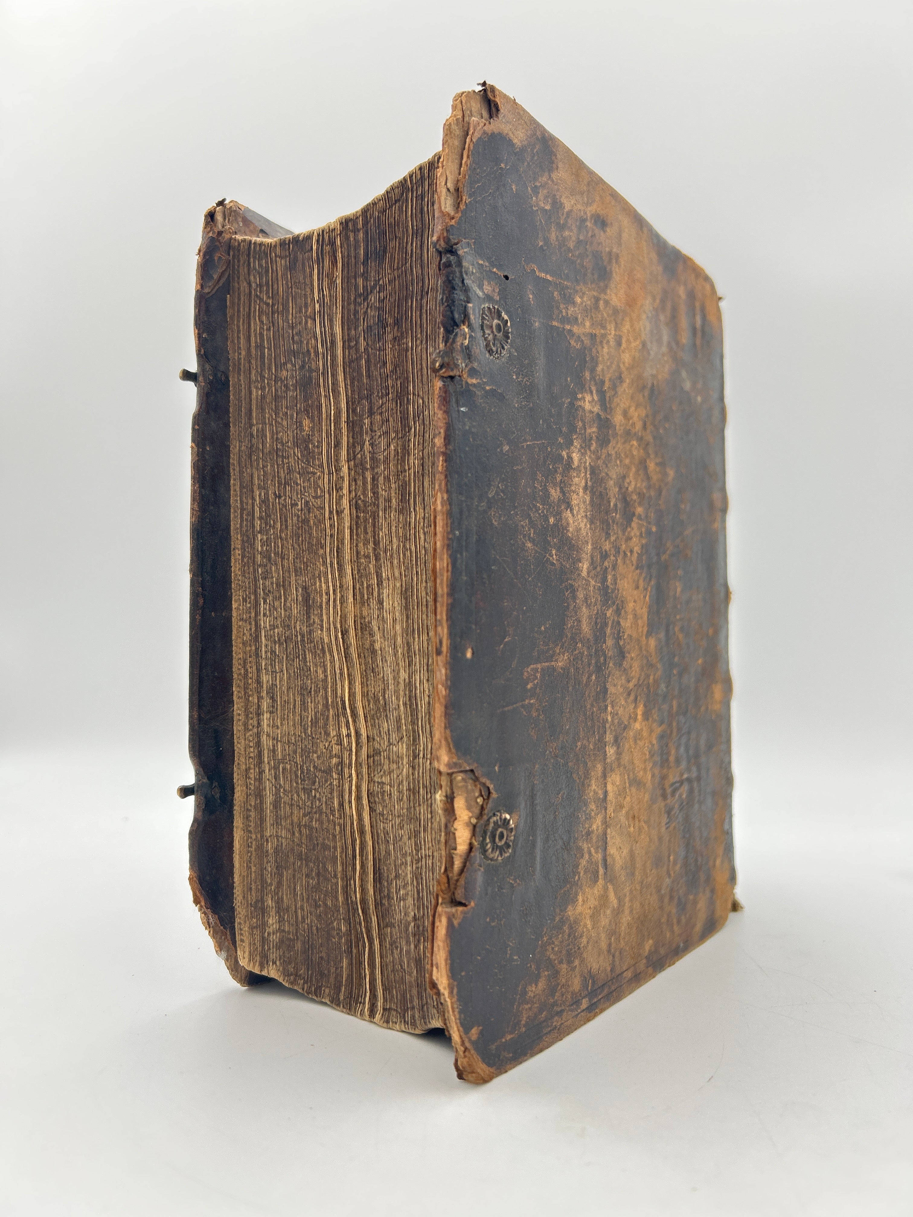 Worn leather covering over wooden cover and spine, cracking where leather is breaking away from the wood along spine, bottom front cover, lower right hand corner of front cover, and left hand side of back cover. Binding comes away up to a half inch from the bottom. Three edge imprint fading on top but in fine condition on the side and wonderful condition on the bottom. Missing brass clasp to secure the covers with cracking damage on the back cover around brass buttons which still remain. Browning pages within with minor abrasions on few edges. A dozen or so small ink stains on the right hand side of first page. Hand written calligraphy signatures on front and back inside cover as well as final page.