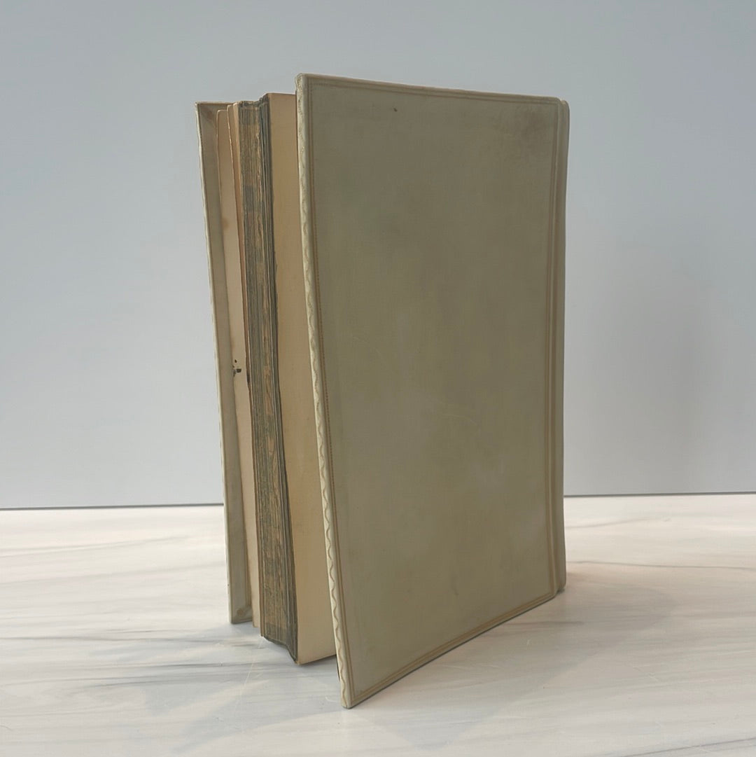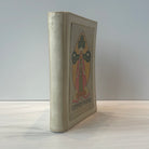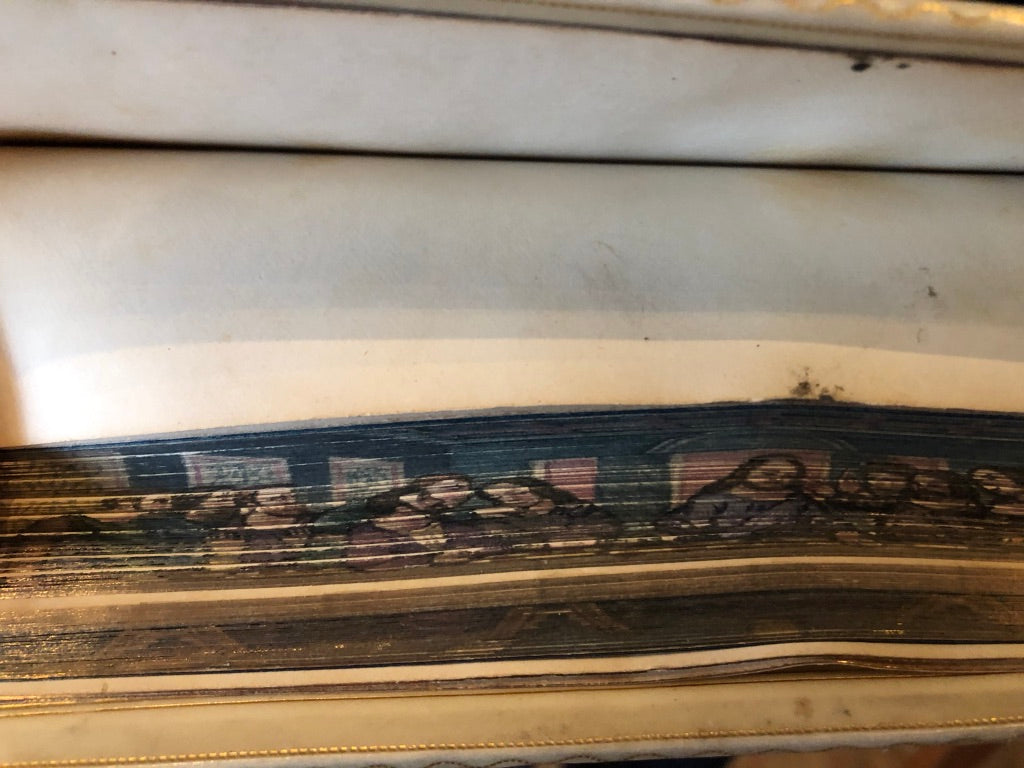 White vellum binding with picture on front and fore-edge painting (last supper), bowing to the cover, beautiful colored illustration on front cover, intact, fine condition.