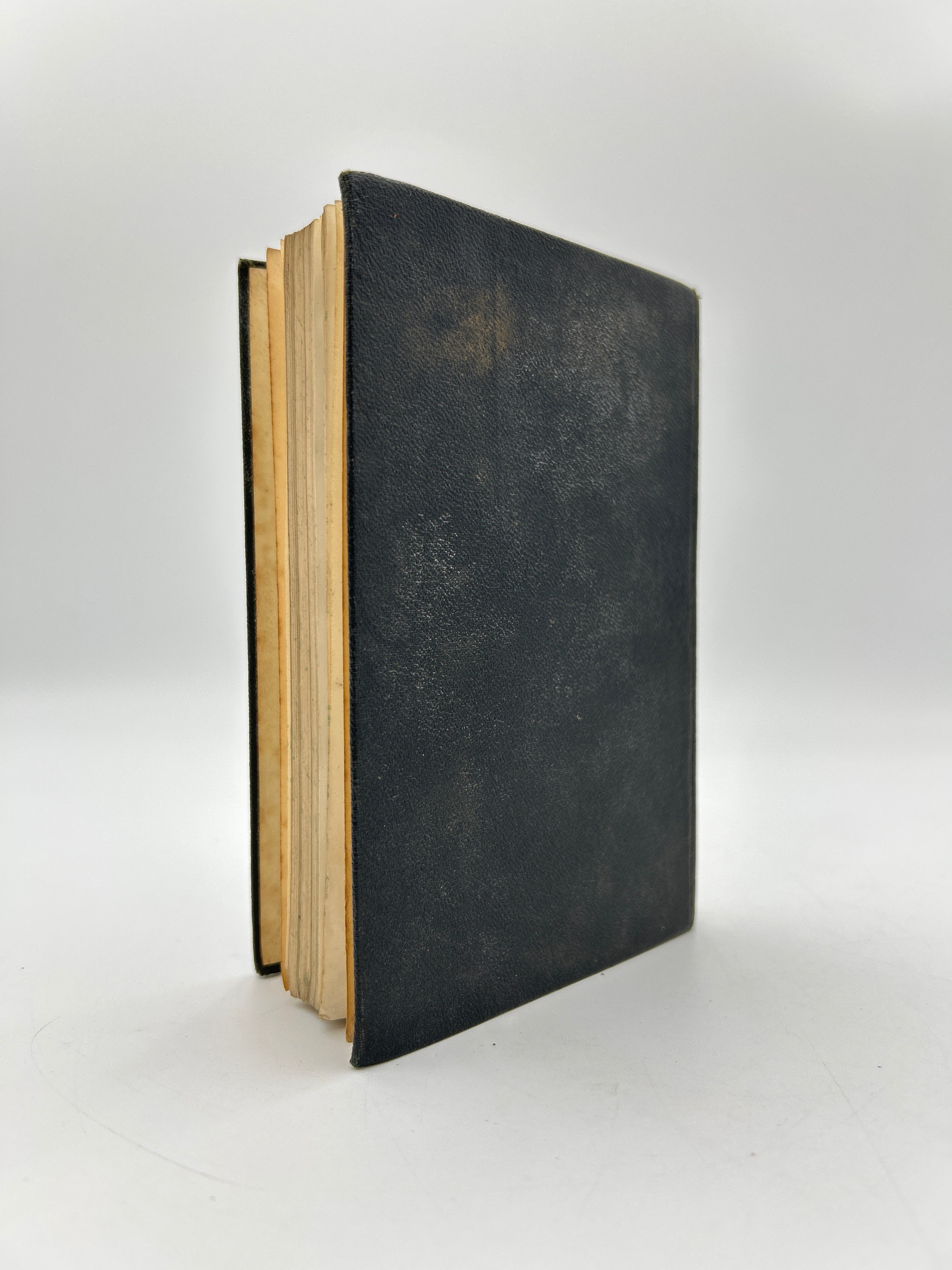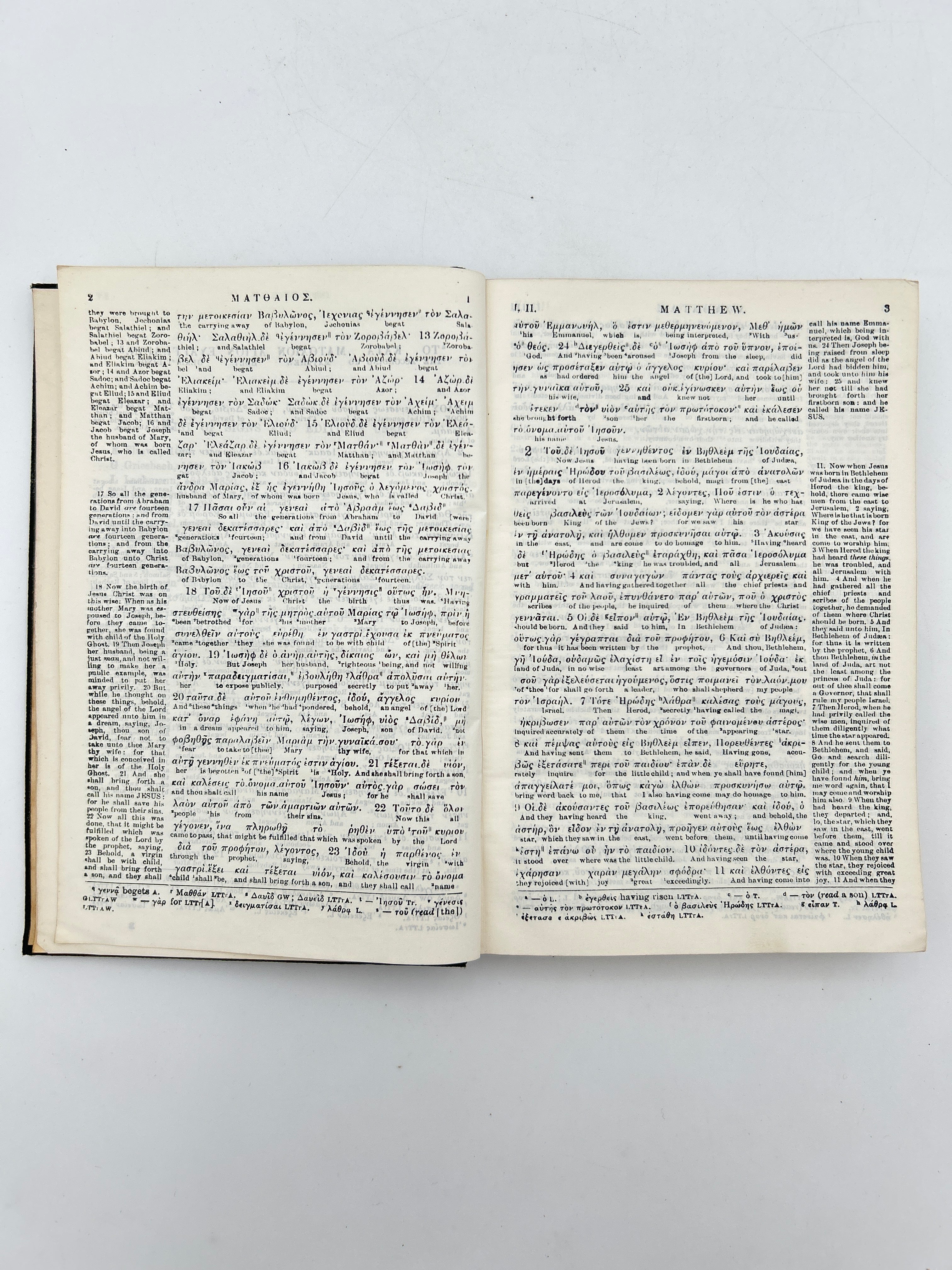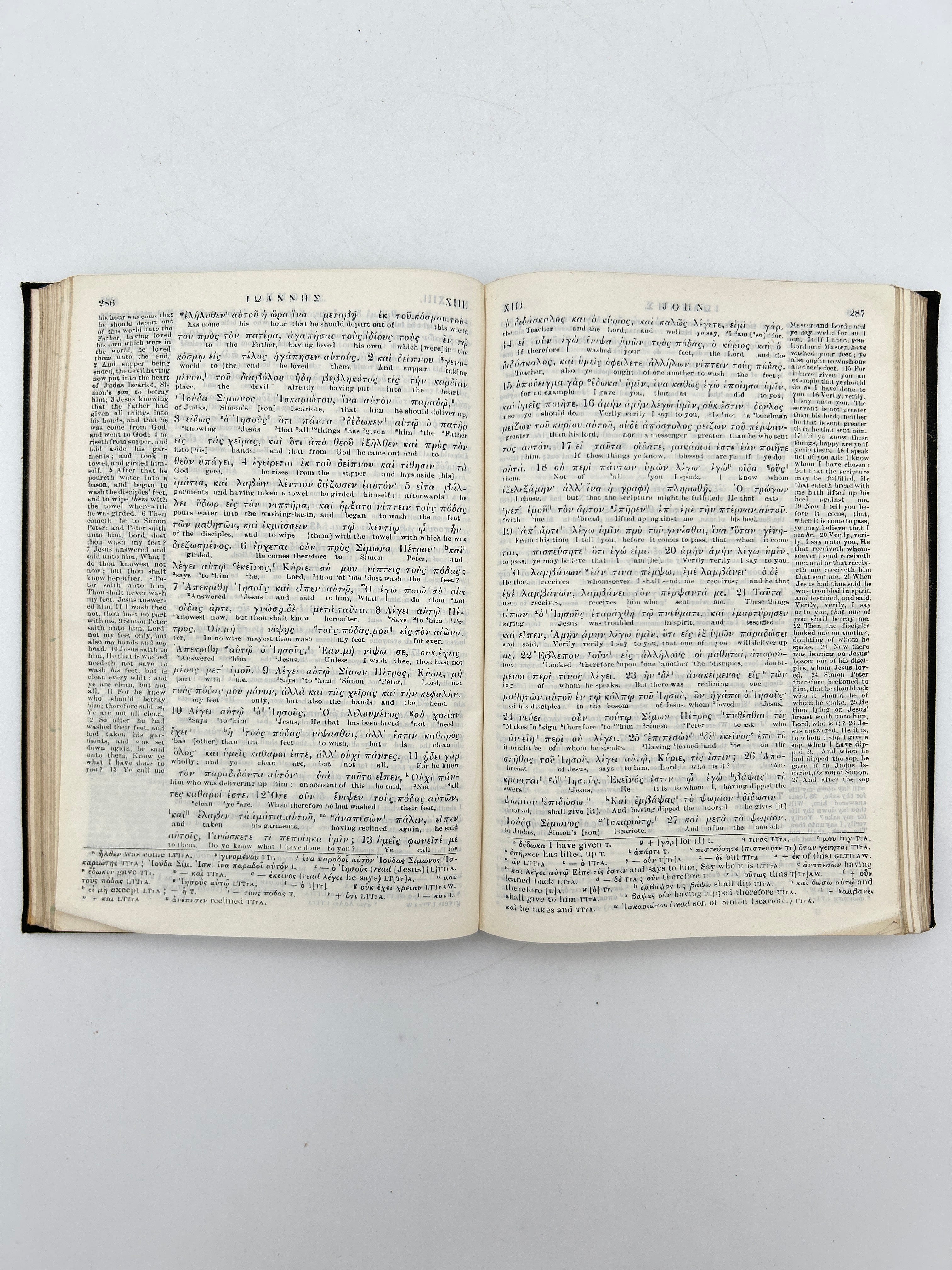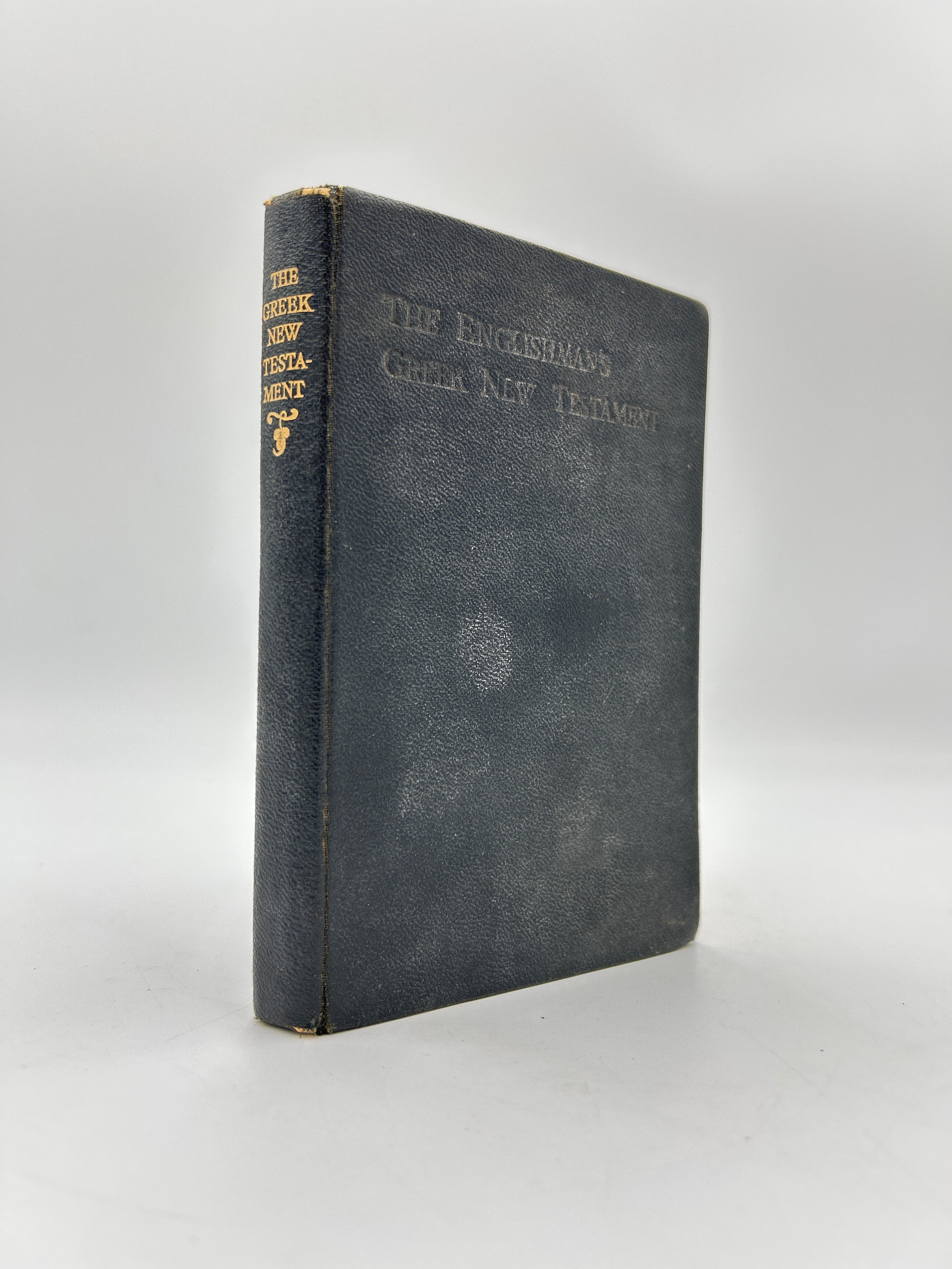 Black pebbled leather binding with embossed title on upper board. Gilt lettering to spine. Printed on India paper. Greek with English translation below and marginal notes in English.