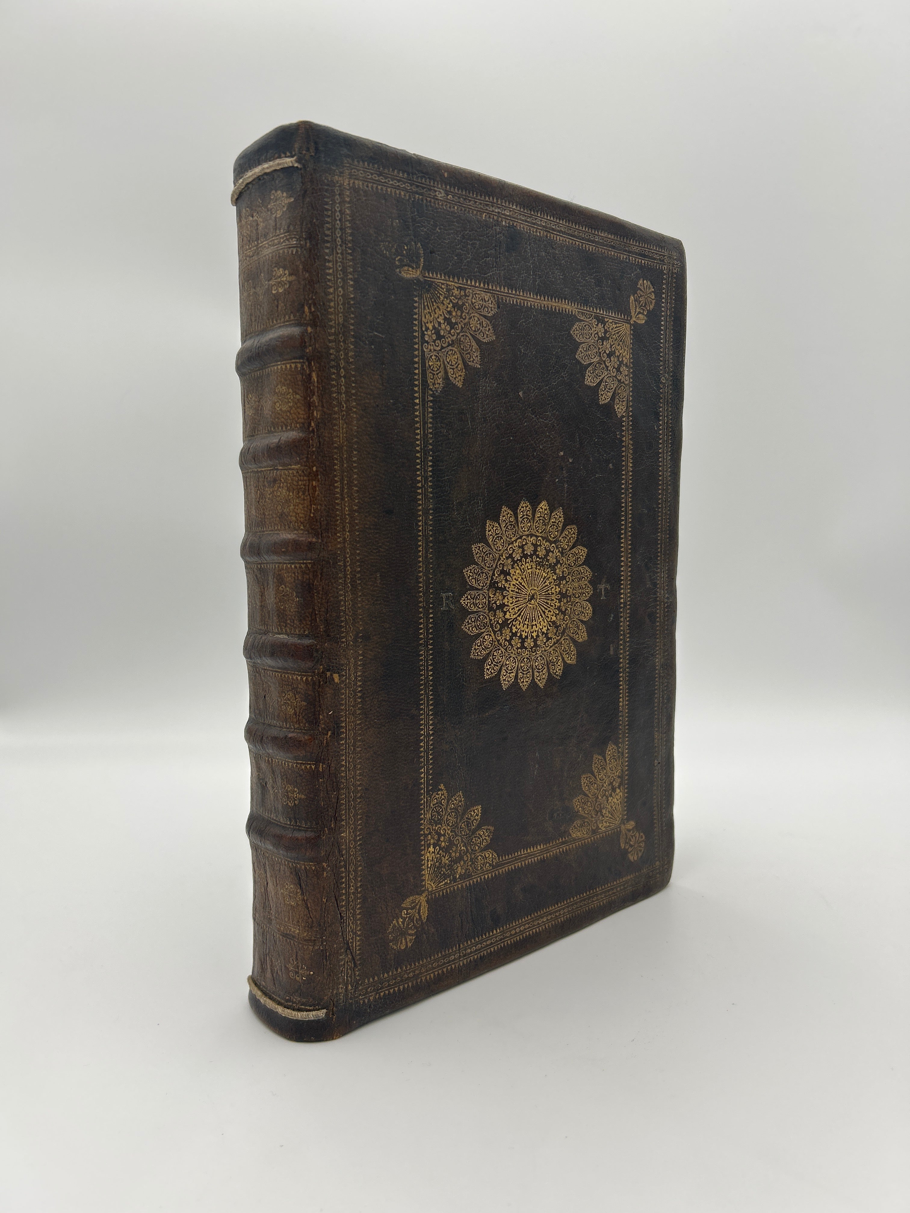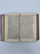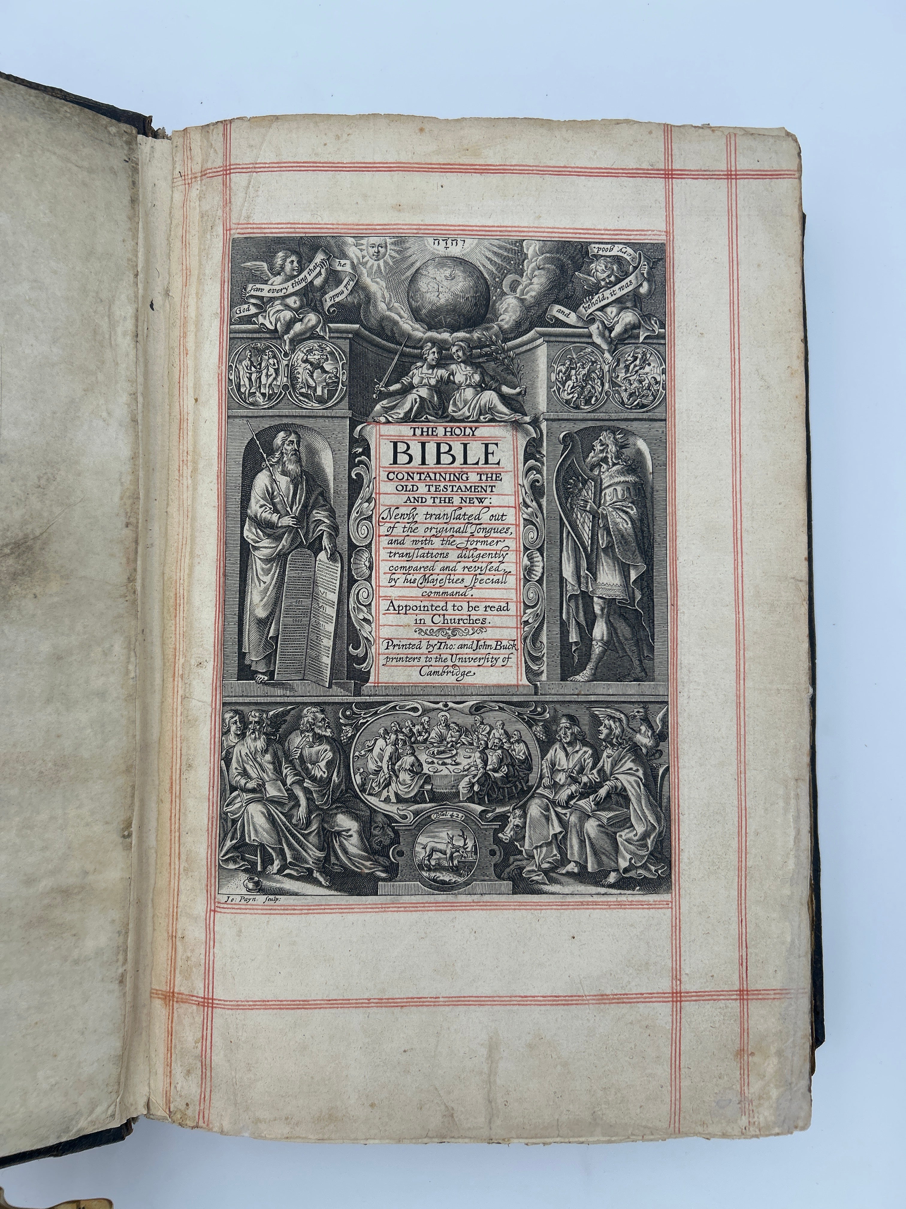 Bible with the Book of Common Prayer, the Genealogies, and the Psalms in meter. Ruled in red throughout, engraved title, gilt gold detailing on the covers and spine. Contemporary dark brown Moroccan leather binding with six raised bands. Gold edges. Engraved illustrations throughout.