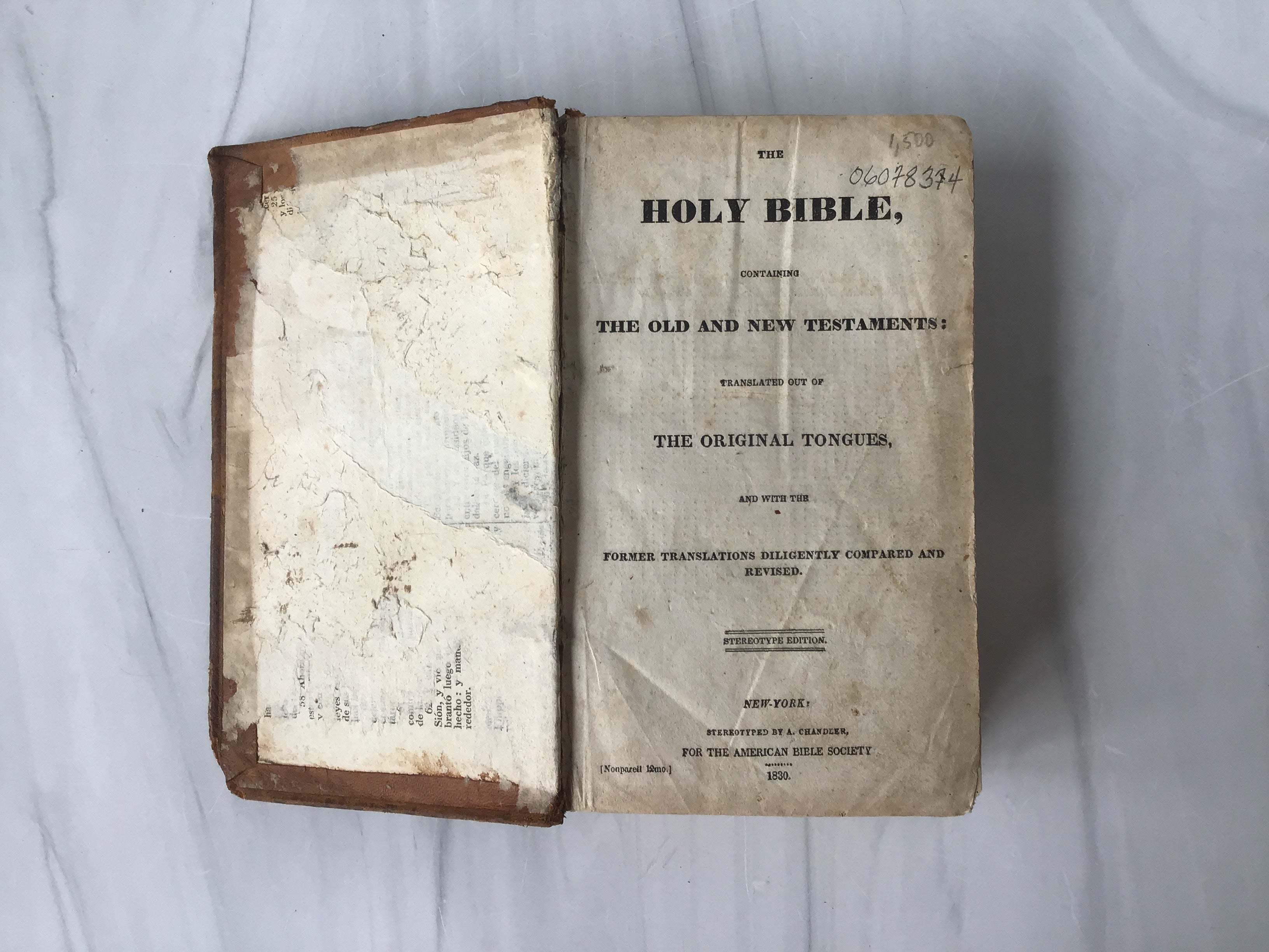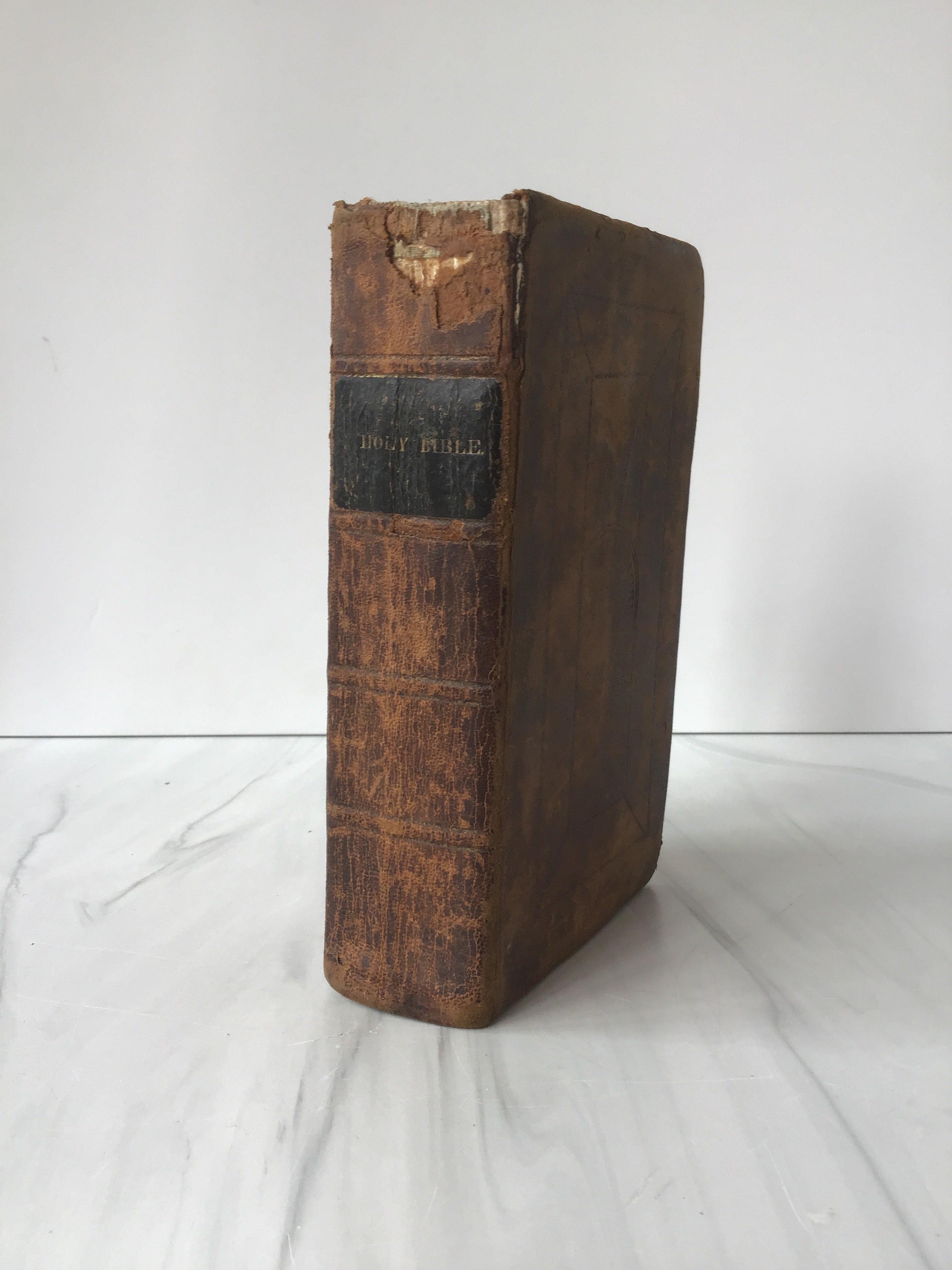 Brown leather edition of the bible, black title plate on spine, four raised bands on spine