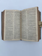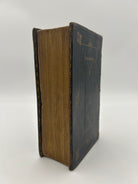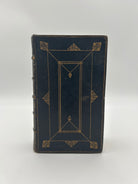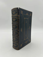 Black leather binding with gold tooling on front, back and spine, five raised bands on spine, three edge gilt, some cracking on front top connecting edge to spine, six design tooling one spine, end boards marbled, intact, very good condition.