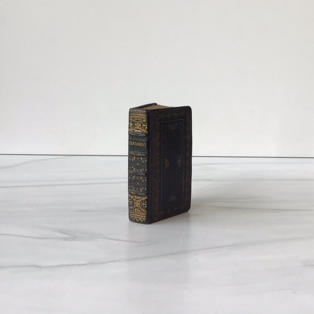 Fine black Moroccoan binding. Beautiful gold tooling on covers and spine. Gilded edges. Is only the New Testament. Pocket sized.