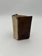 Brown leather bound miniature, marble end papers, leather spine missing, pages intact, fair condition.