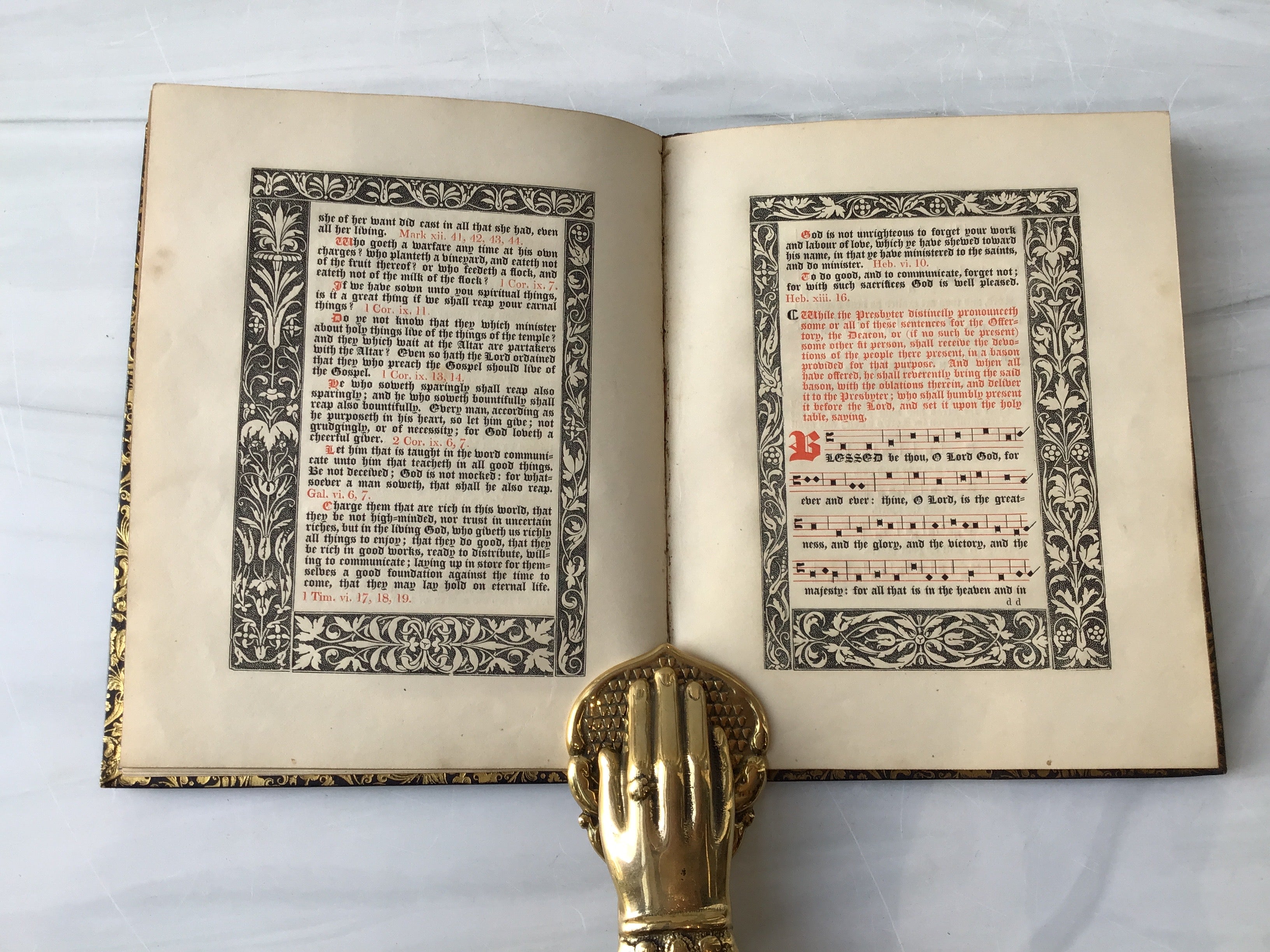 Beautifully printed in red and black gothic type with borders, one of which has been hand colored, decorated end papers, W.Wake Clark, M.D.,J.P. book plate in front of the book