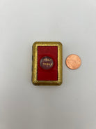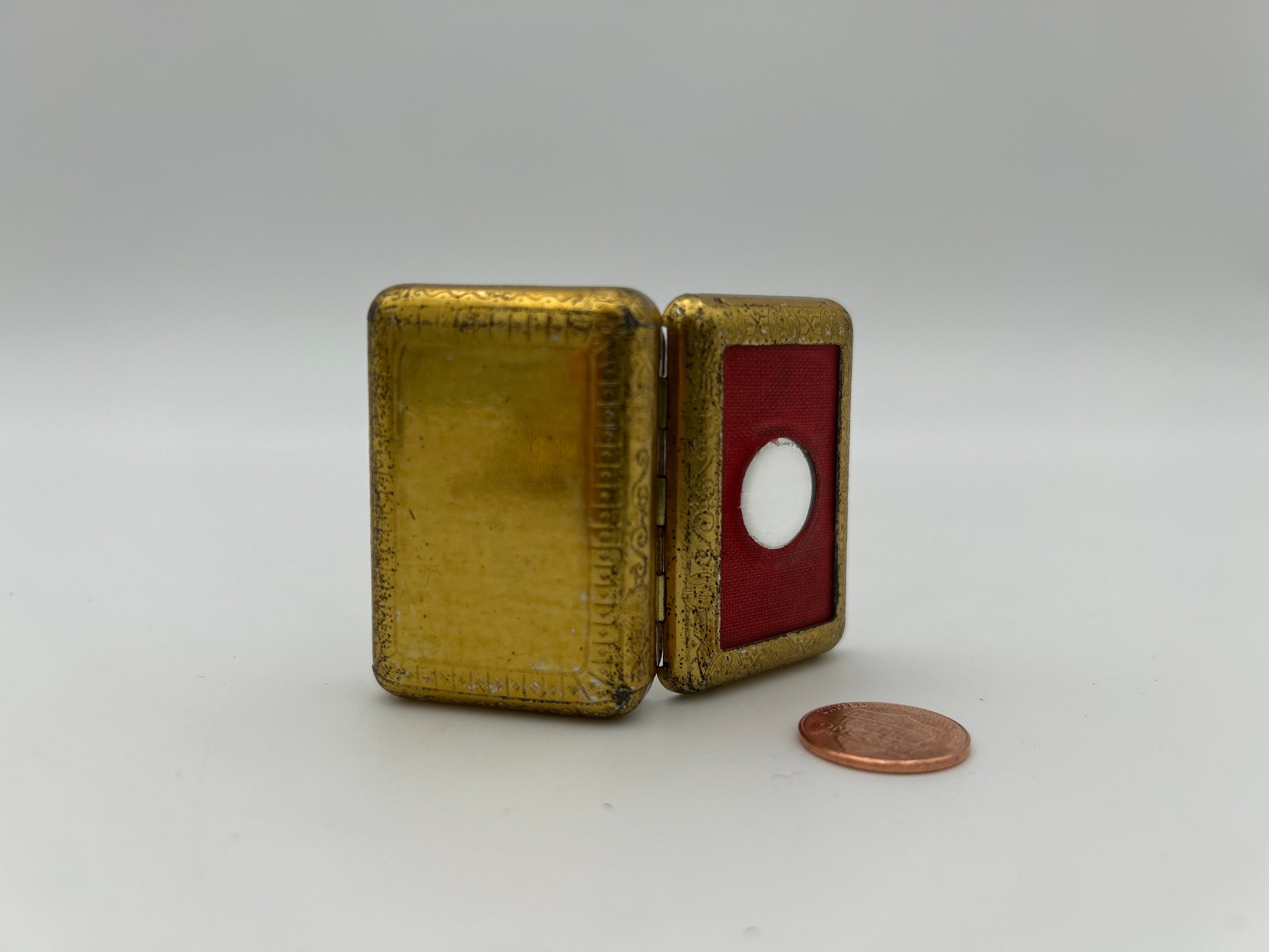 Gold metal case with red canvas on the front and a small magnifying glass set in the center. Red leather binding with gilt lettering on the front board and spine. Several illustrations throughout. Working clasp and hinge on case. Fine condition.
