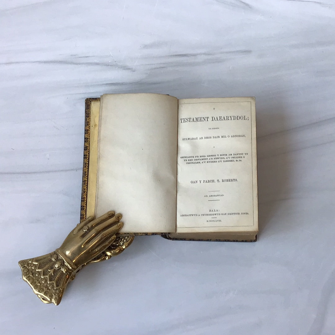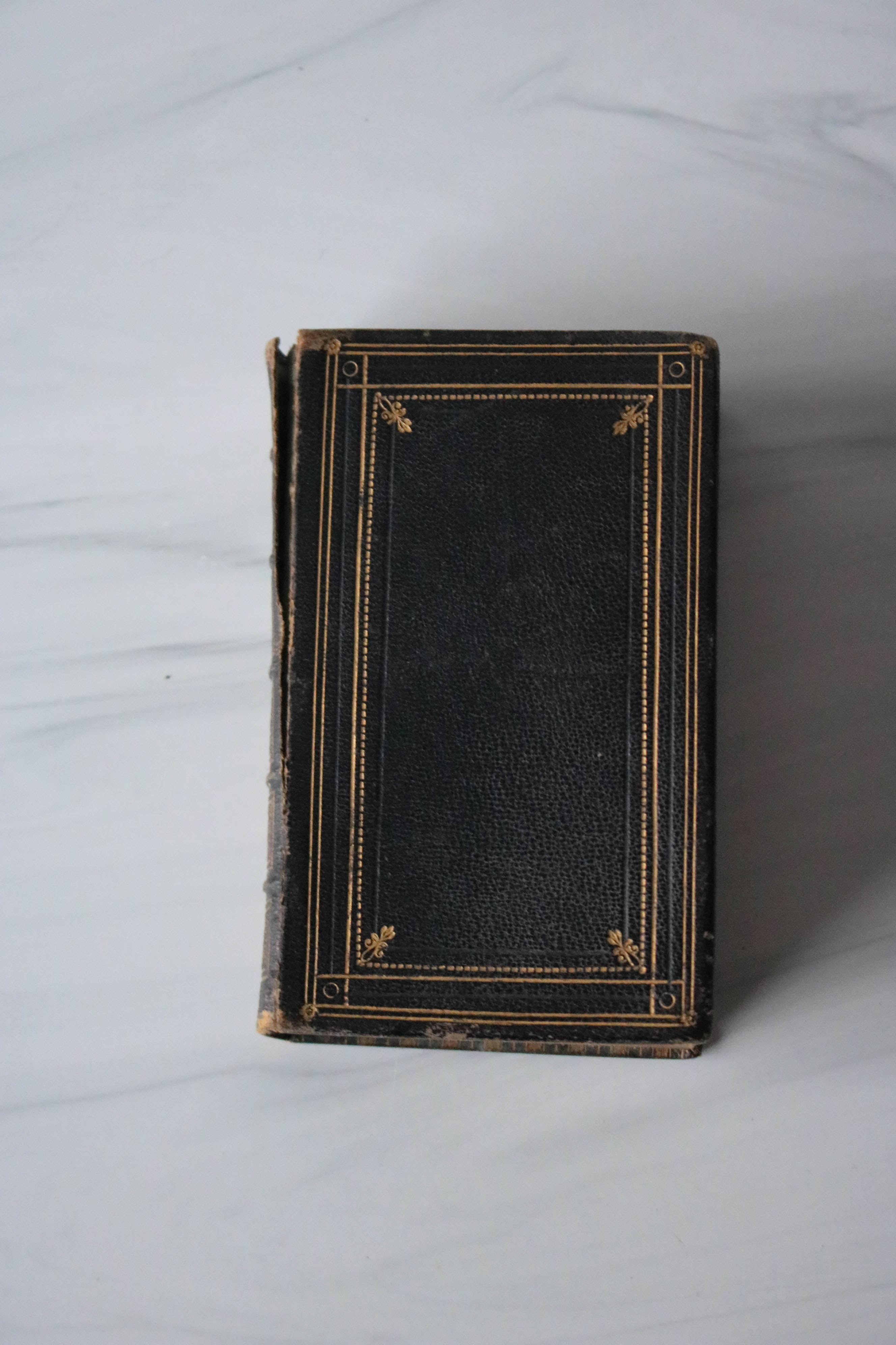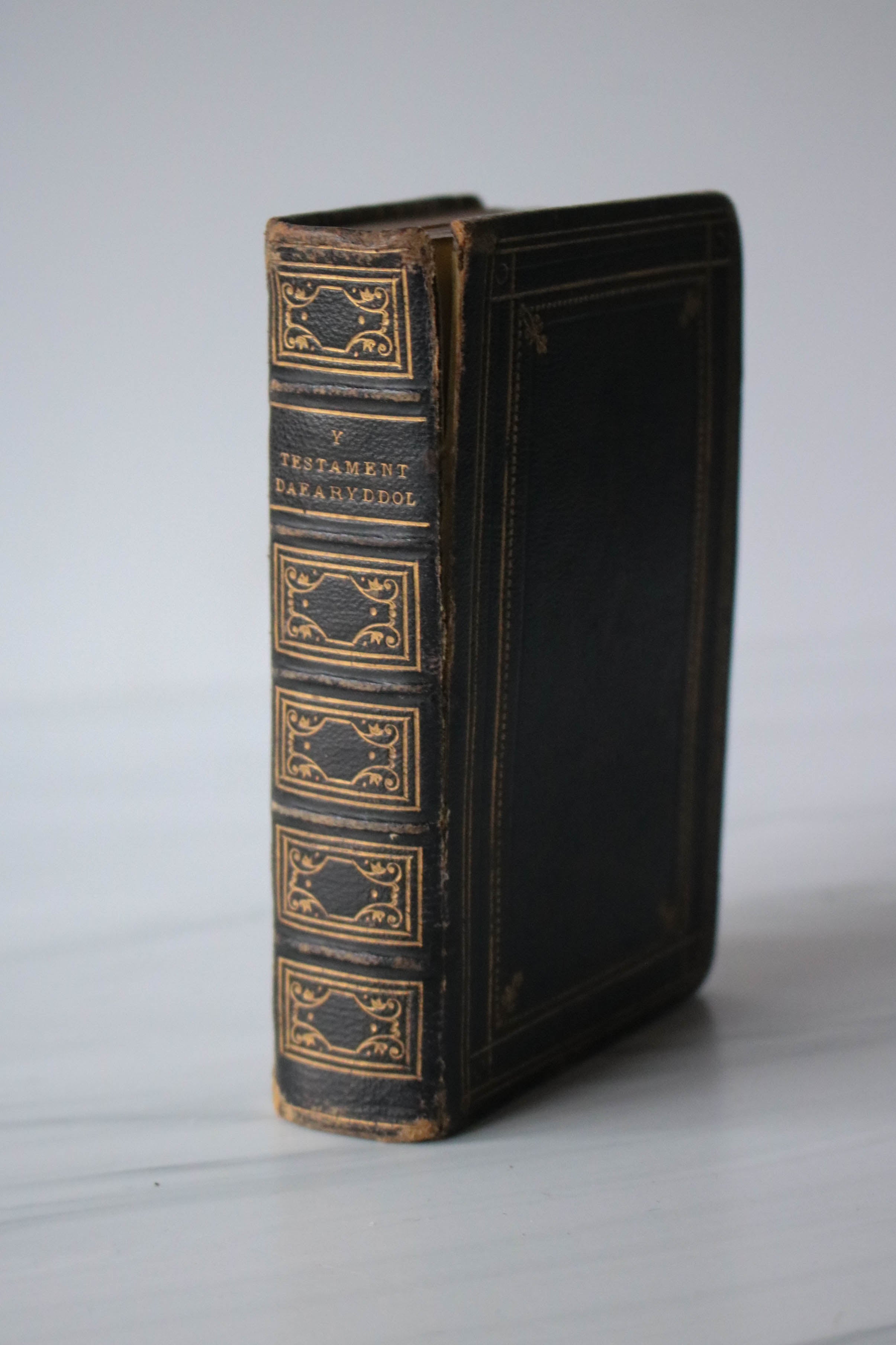 Pocket bible with gold embossing on front and spine, front board detached from spine, five raised bands, gold embossing between bands.