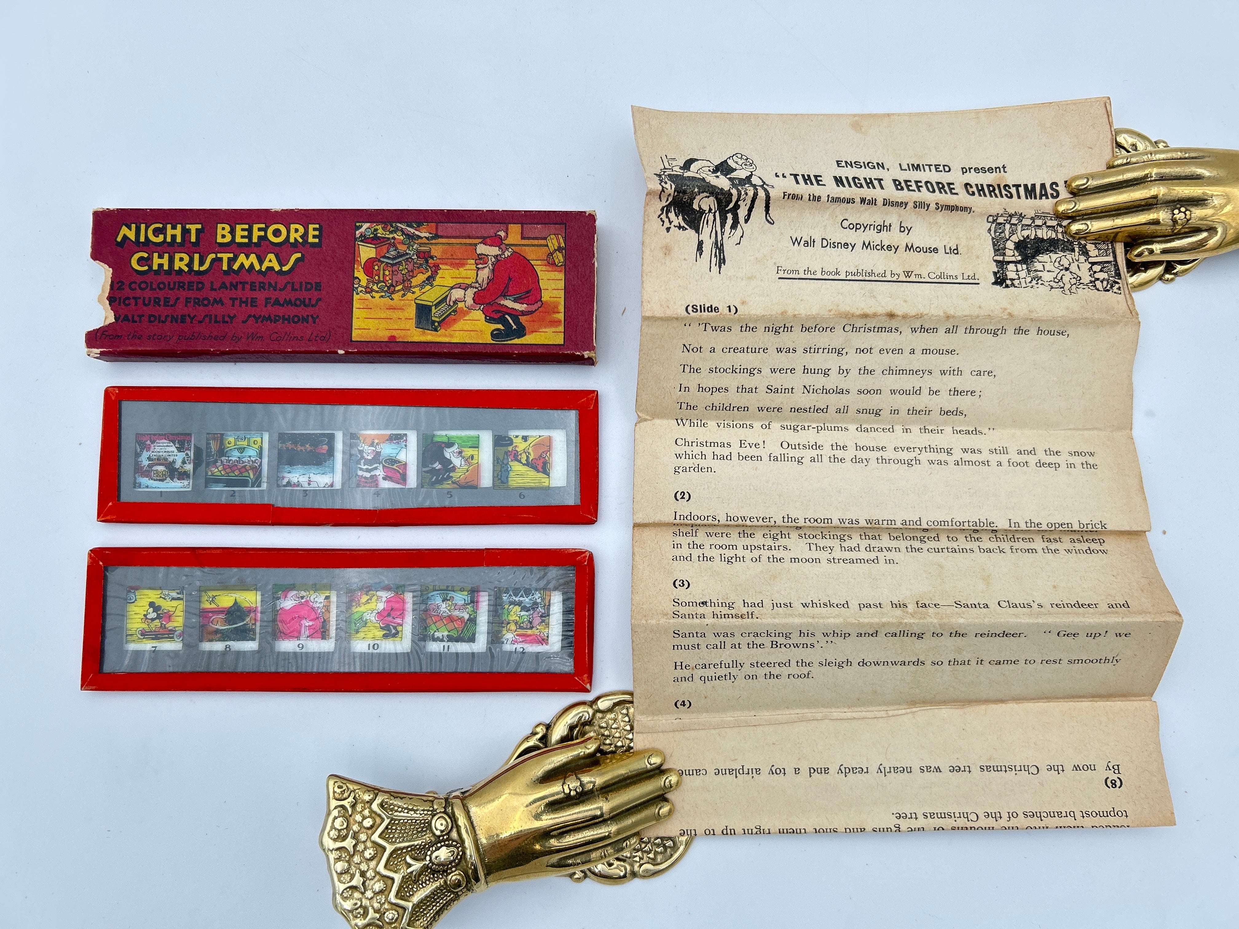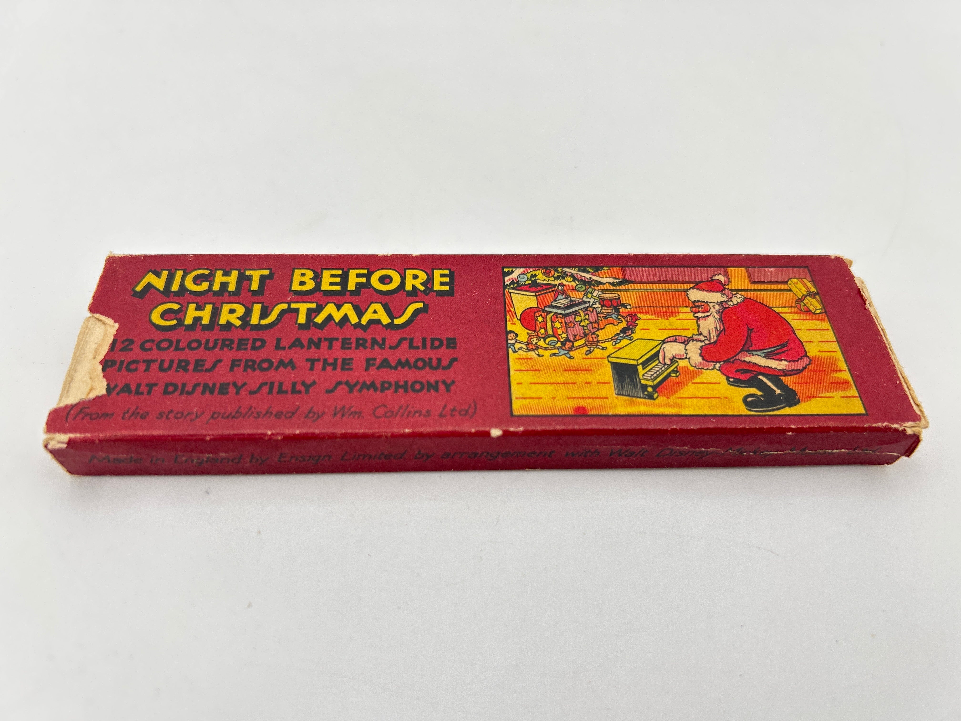 The "Night Before Christmas" from Walt Disney's Silly Symphonies is an animated short that brings the classic Christmas poem to life. The film, released in 1929, features colorful and whimsical animation, with a focus on Santa Claus and his reindeer as they prepare for their Christmas Eve journey. These slides are an at home version of the short that could be viewed with a magic lantern. The story closely follows the original poem by Clement Clarke Moore, highlighting scenes like Santa's arrival on the rooftop, the delivery of presents, and his departure with a joyful sleigh ride into the night. The colored lantern slides used in the production brought a vibrant, magical atmosphere to the festive tale, blending Disney’s signature animation style with the holiday spirit.