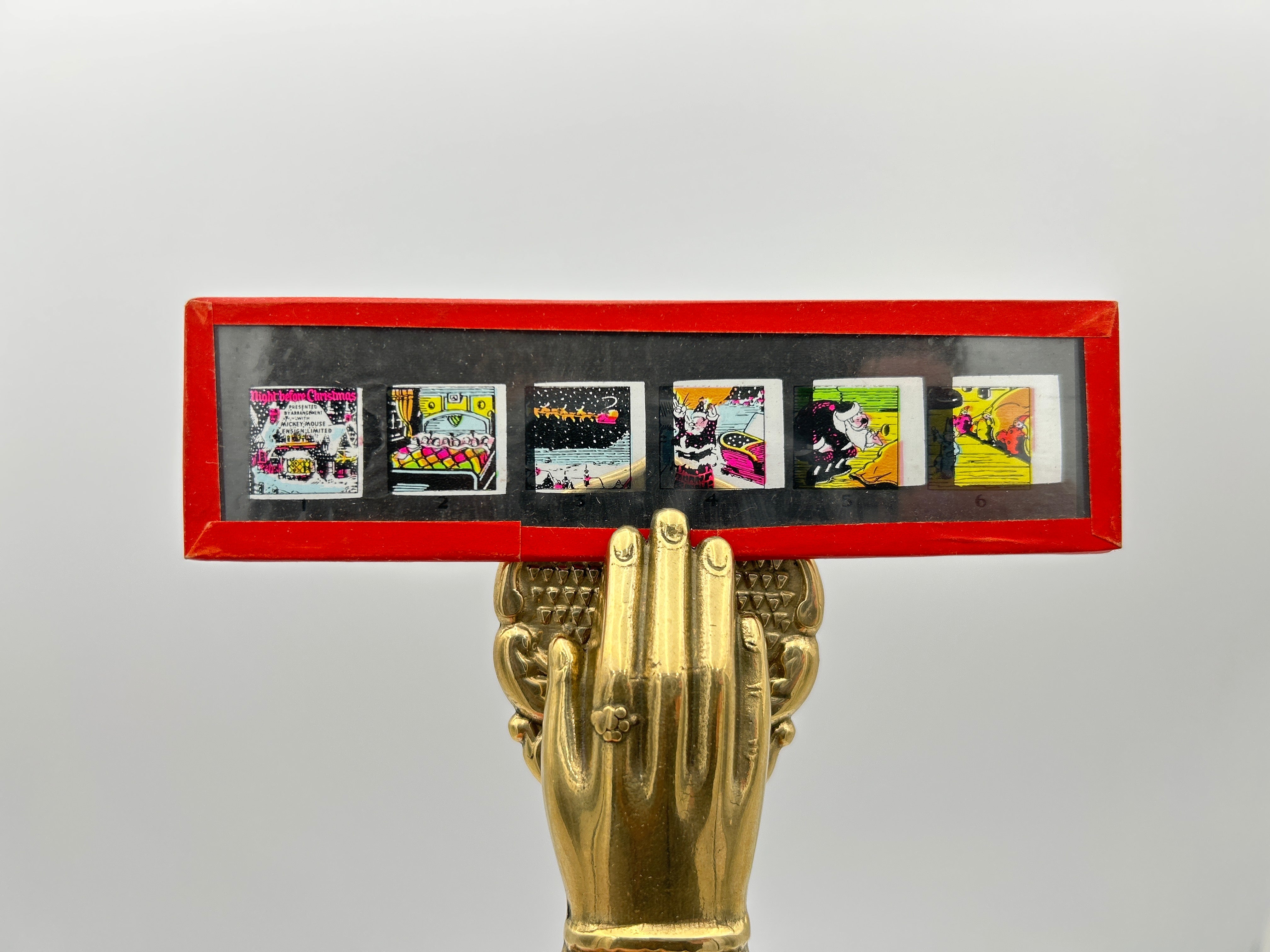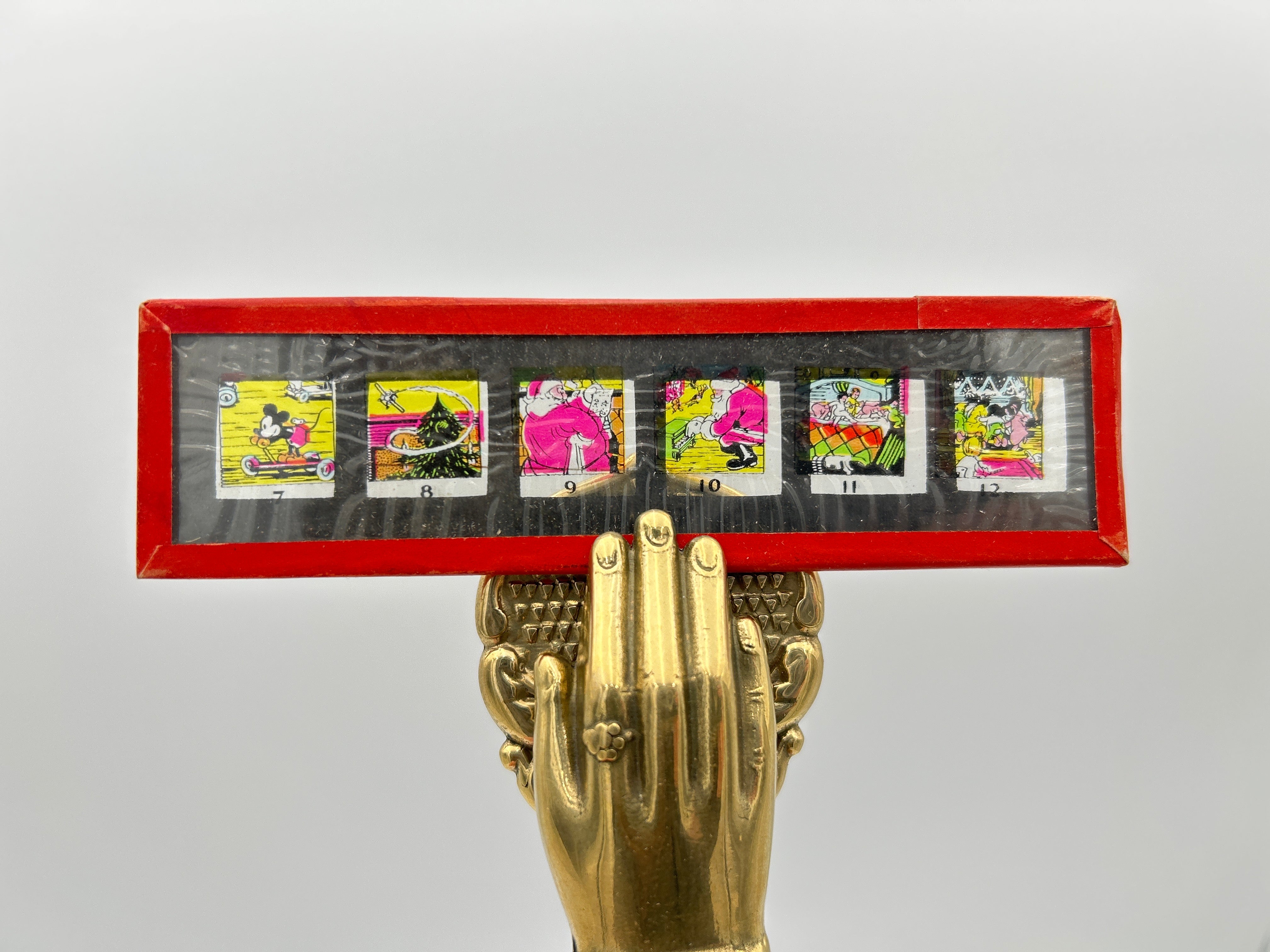Twelve colored slides in two glass slides with red cloth seal around the edges. Each slide is 1 1/2in x 5 1/4in painted in vibrant colors. Comes in original vintage pictorial box with original slide dialogue pages. Fully intact.