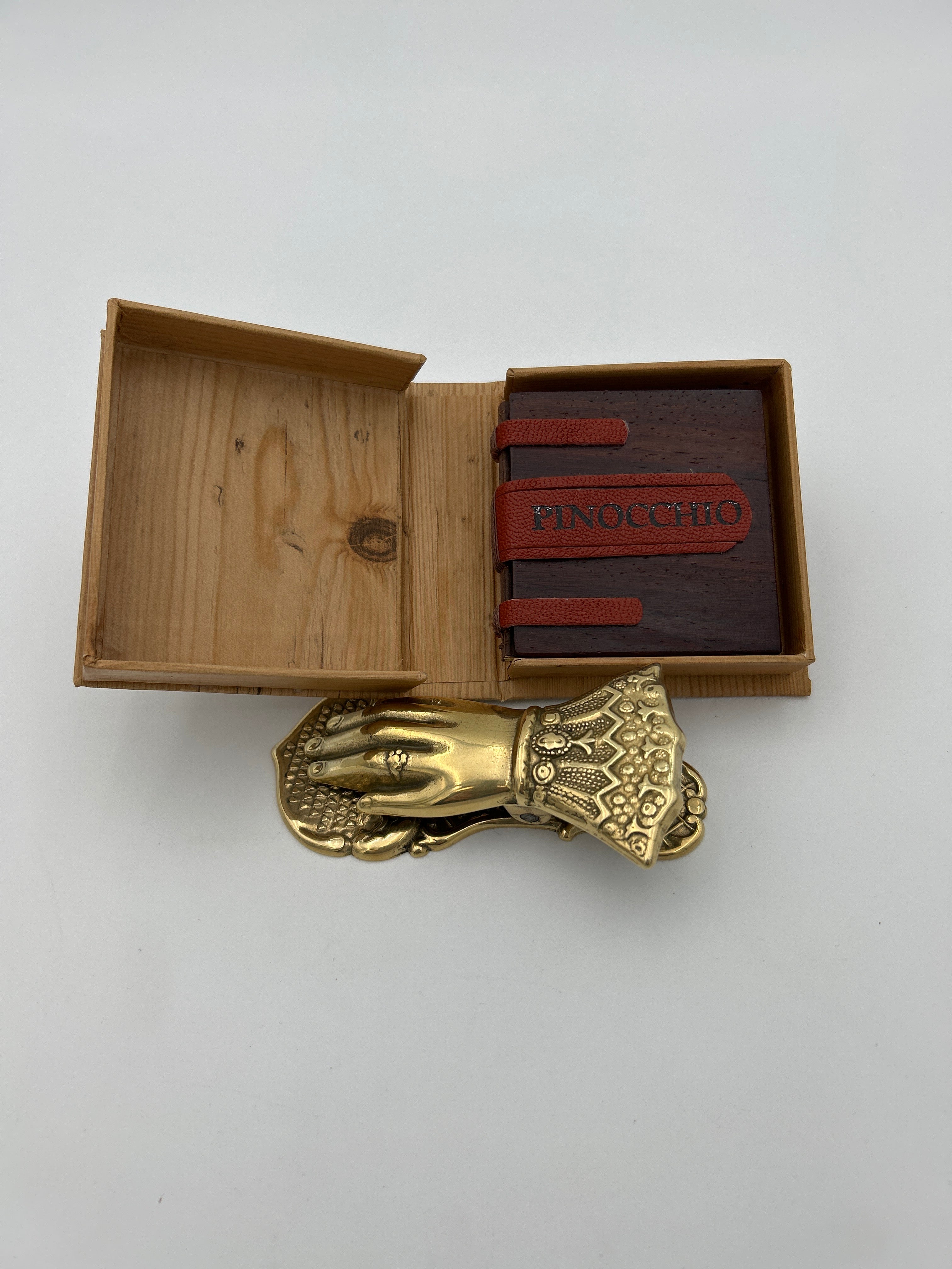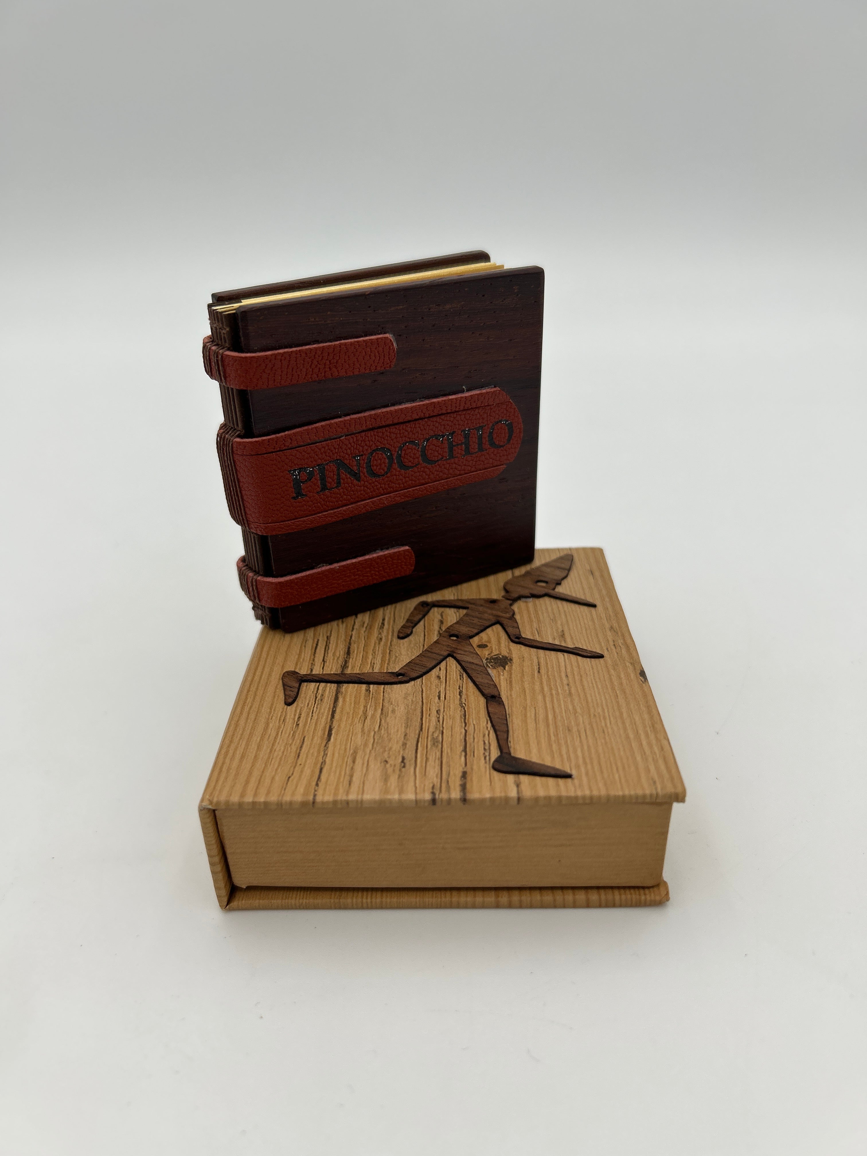 Wooden boards and Leather strip across the front and back boards with black embossed lettering. Handmade clamshell box to house it in with a figure of Pinocchio on the front. Pristine condition.