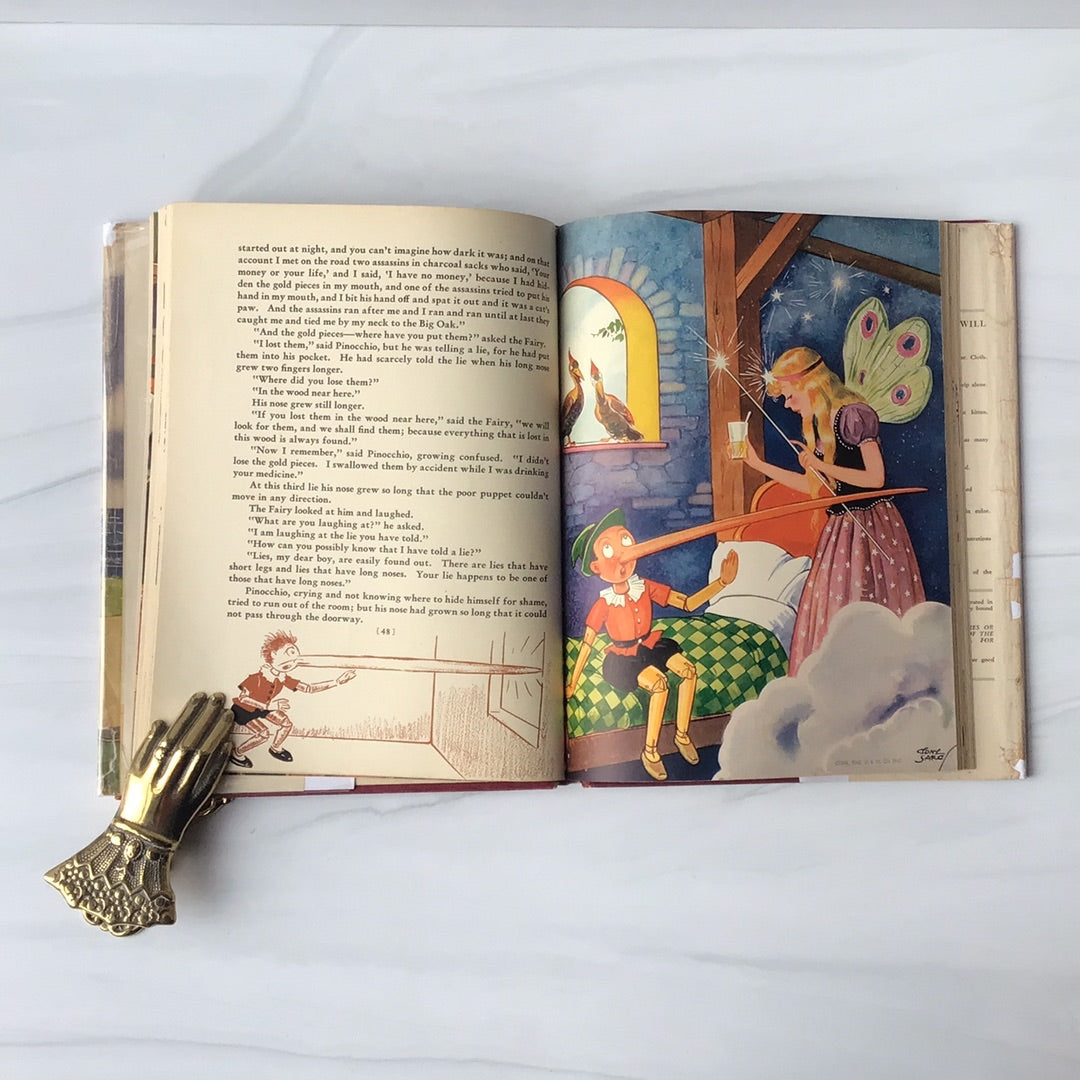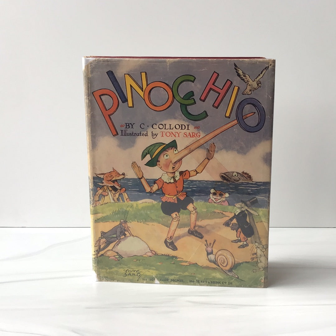 First edition of C. Collodi's Pinocchio. Bound on dark burgundy pictorial board with scarcely found original dust jacket in good condition.