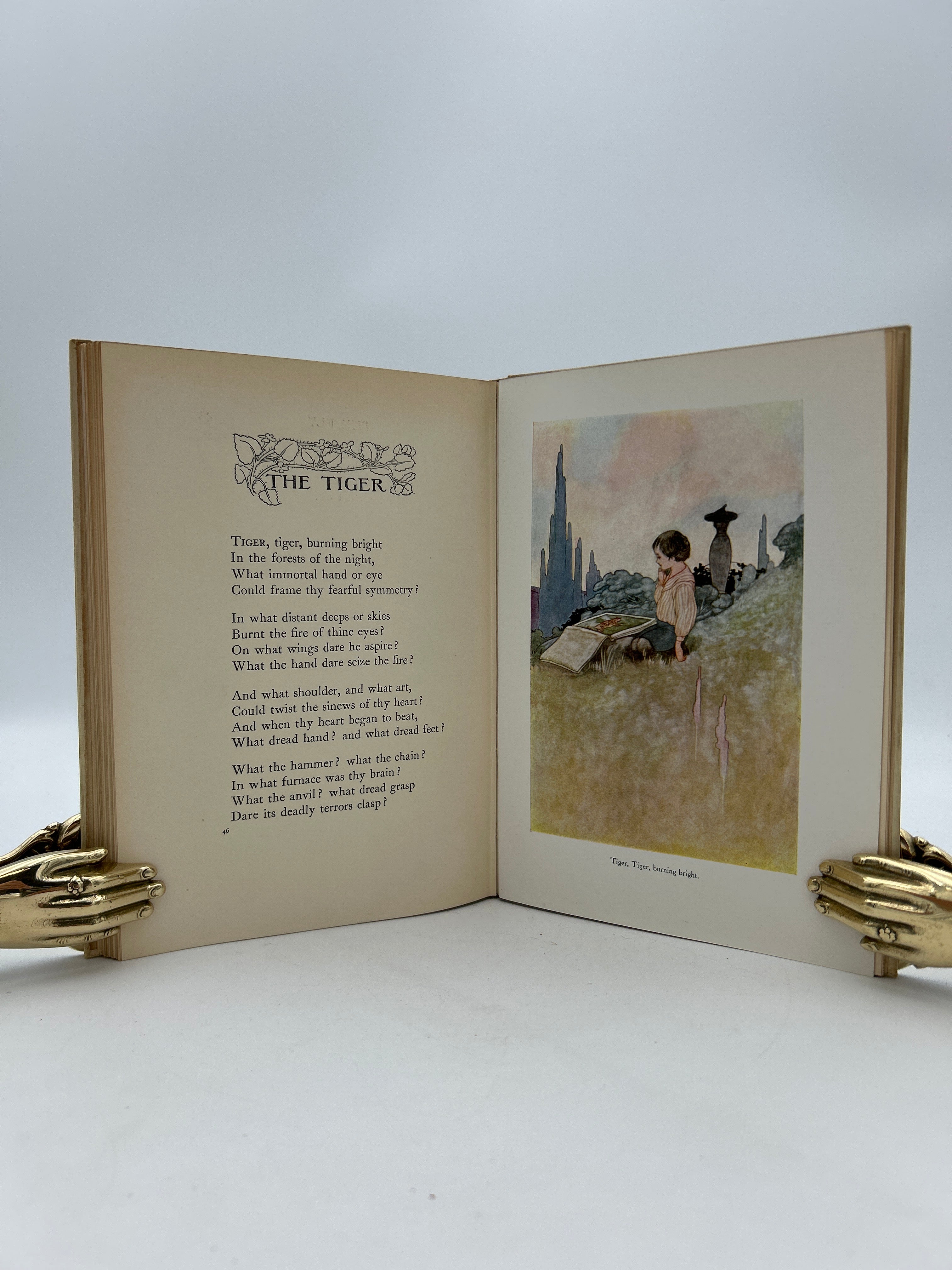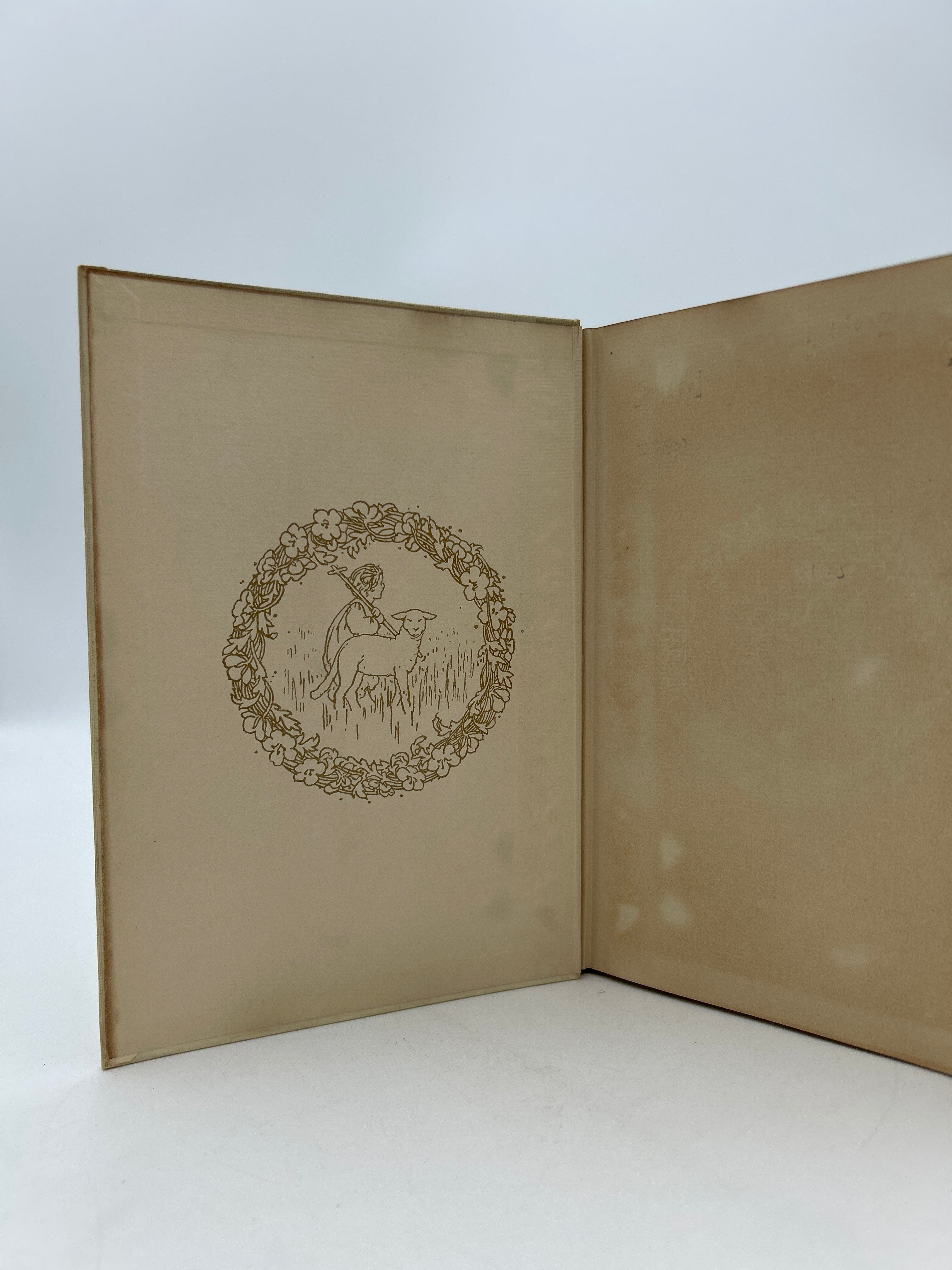 Tan colored cloth hardcover with gold embossed lettering on front and spine, Illustration on front cover.  Some shadowing on front and back endpapers, colored illustrations,  good condition