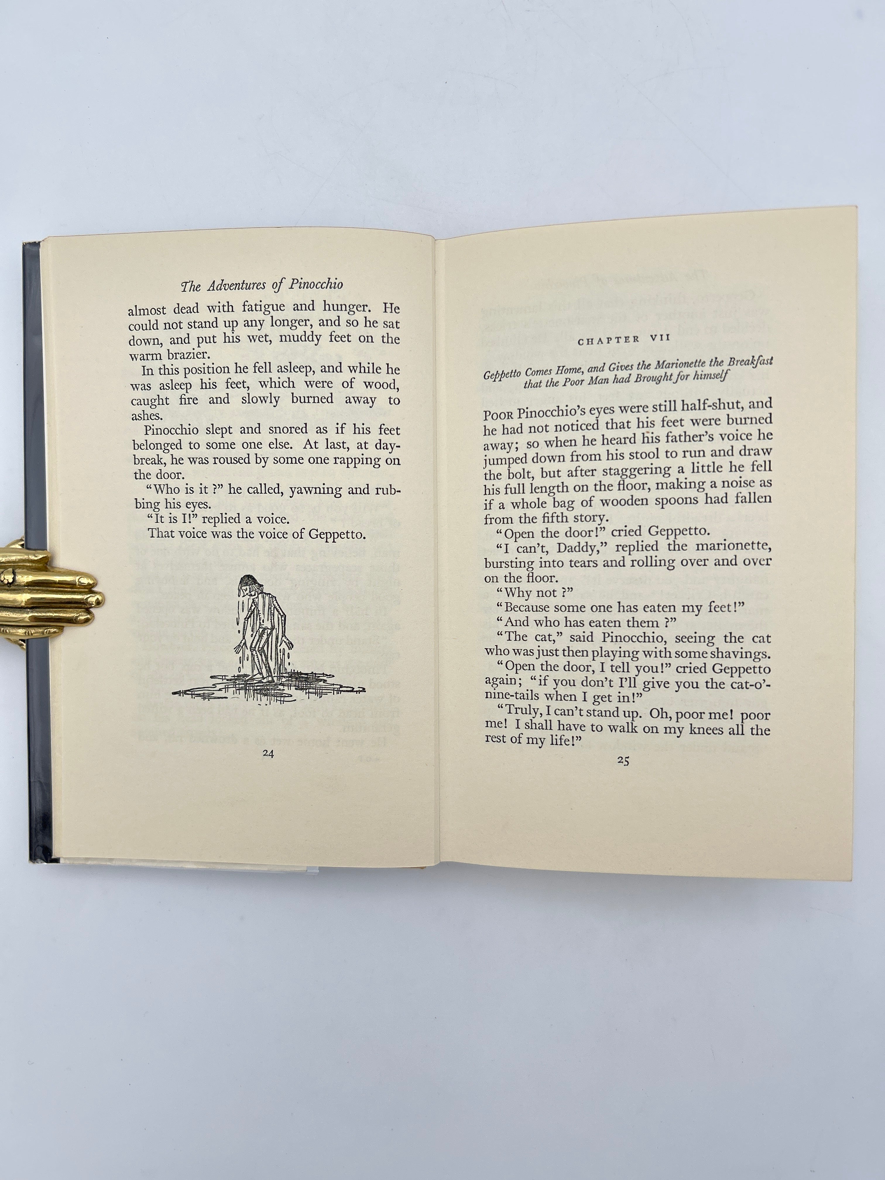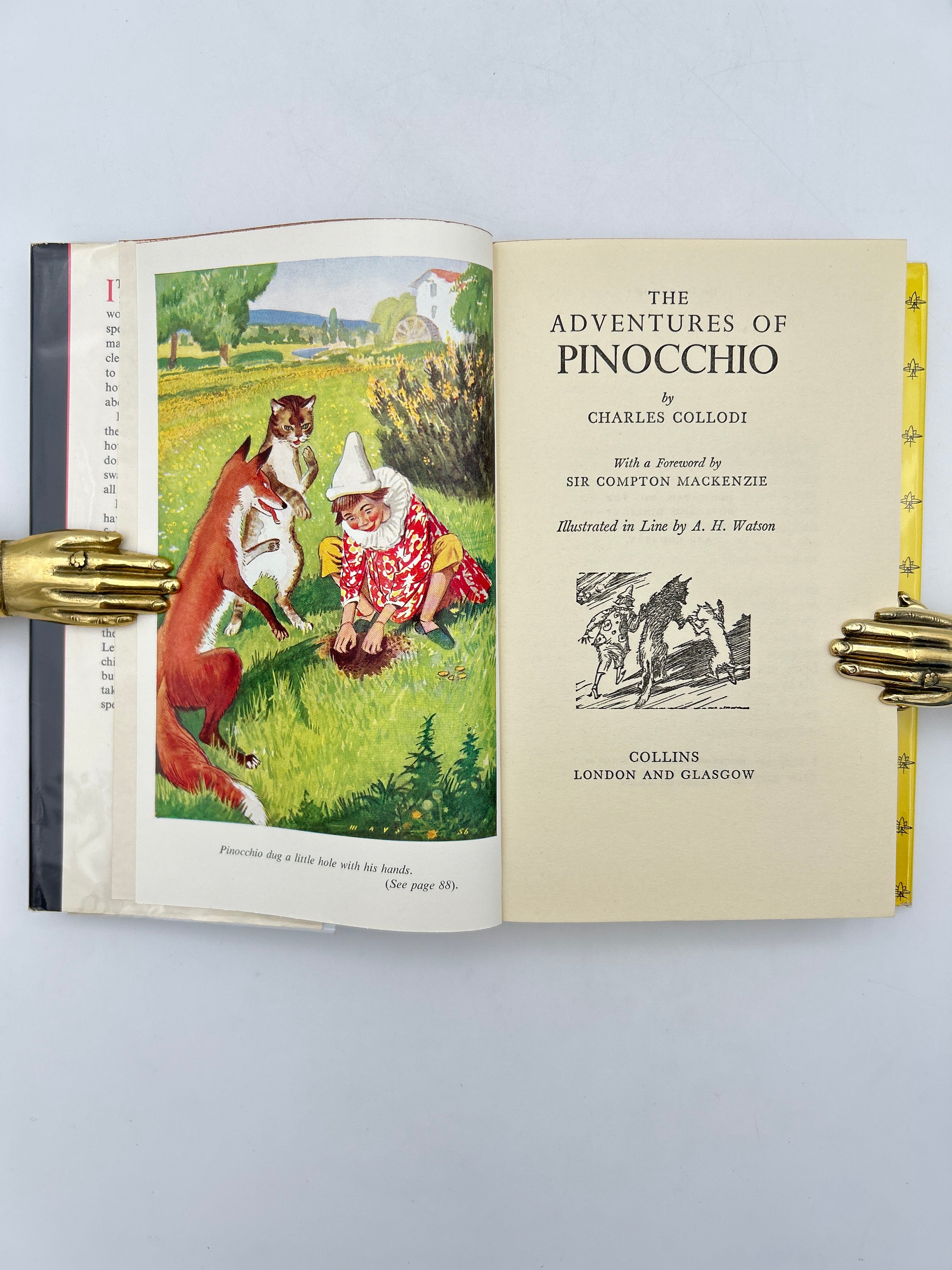 Butter yellow hardback with dust jacket with image of Geppetto and Pinocchio very fine condition.