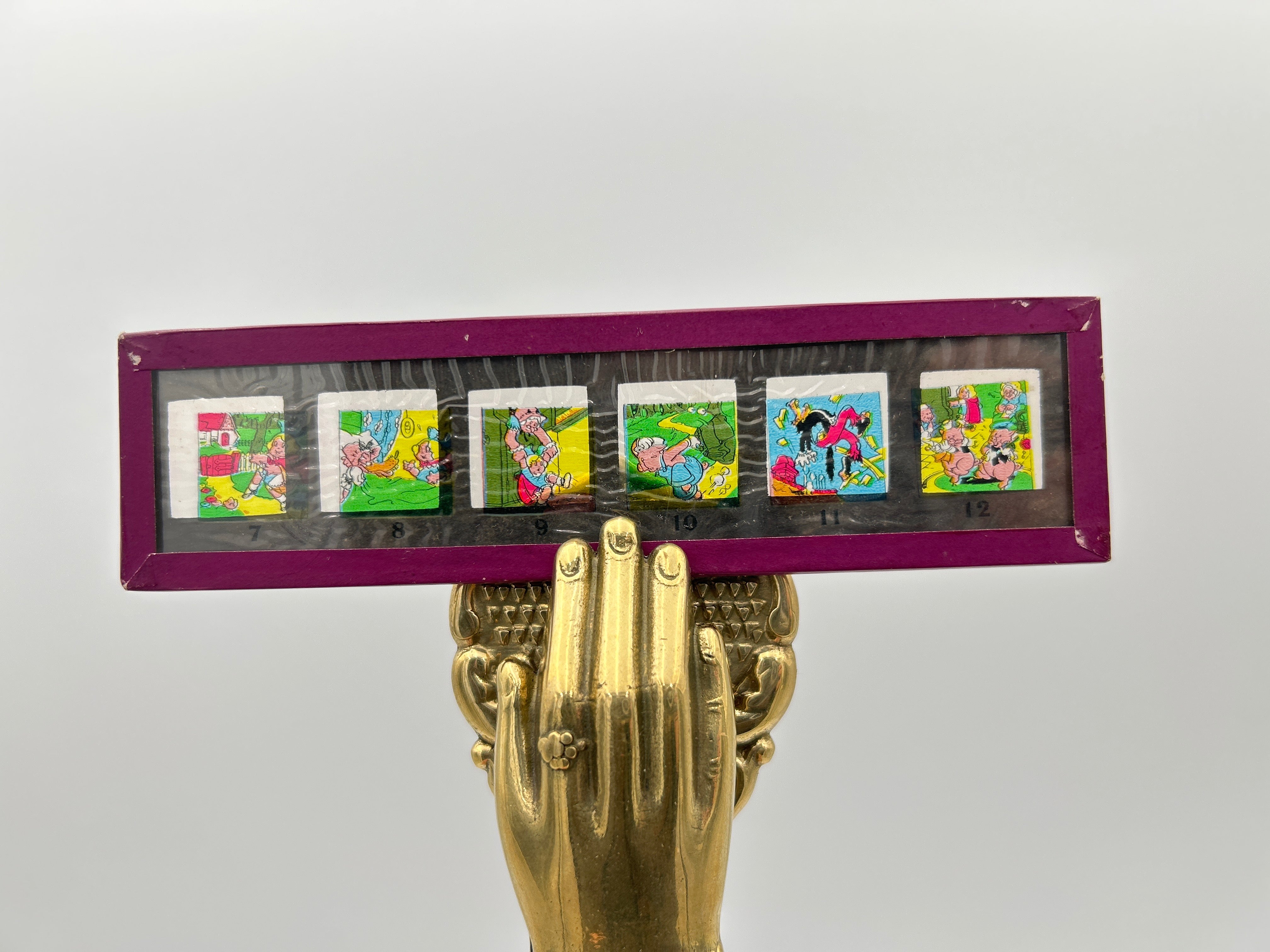 Twelve colored slides in two glass slides with purple seal around the edges. Each slide is 1 1/2in x 5 1/4in painted in vibrant colors. Comes in original vintage pictorial box with original slide dialogue pages.