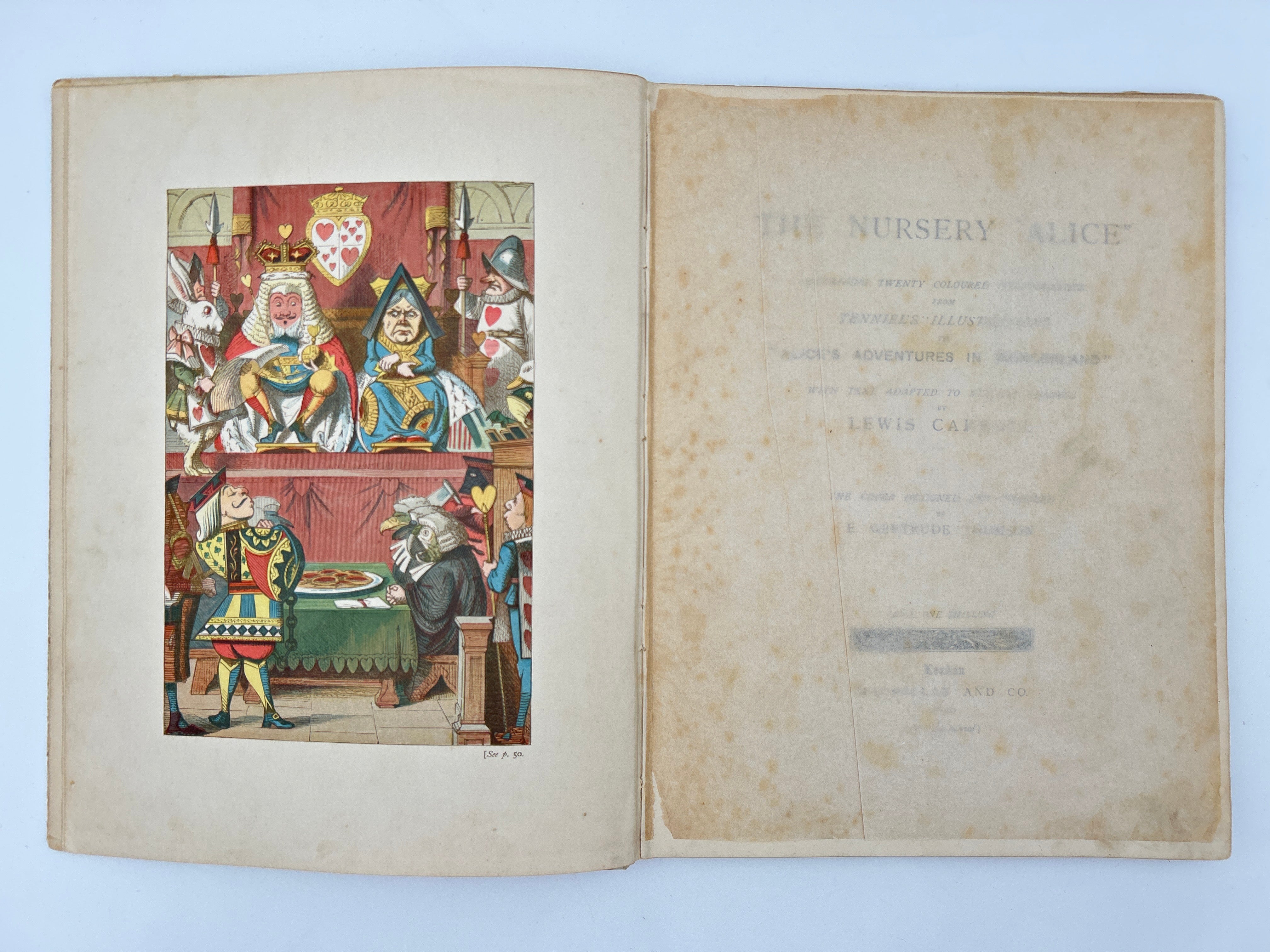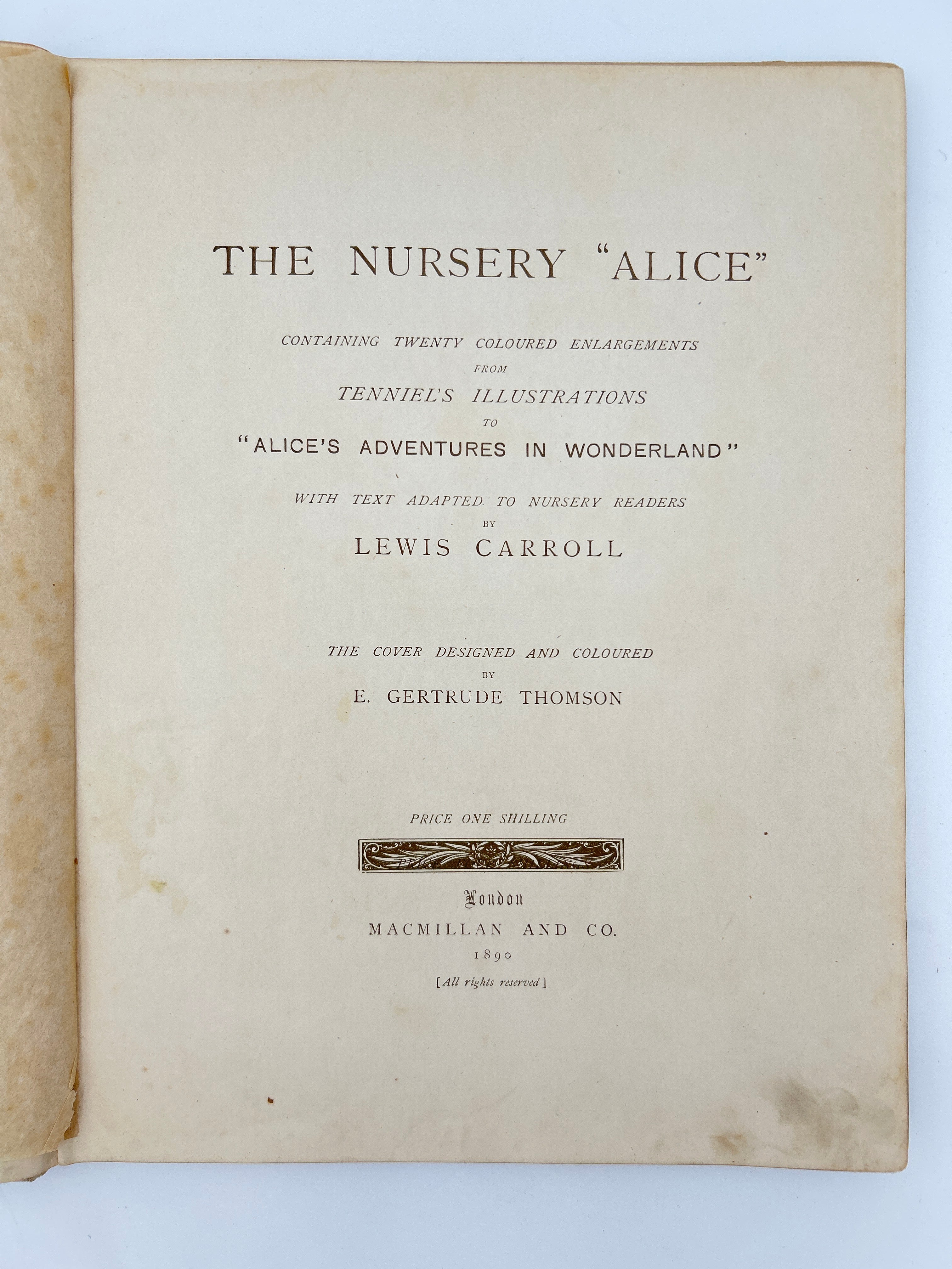 The Nursery "Alice" is a version of Lewis Carroll's famous Alice's Adventures in Wonderland, adapted for younger children and first published in 1890. The book was reimagined by Carroll with simple, rhythmic language and accompanied by delightful illustrations by renowned artist John Tenniel. In this adaptation, the complex narrative and wordplay of the original were modified to suit the needs of a younger audience, focusing more on nursery rhyme structures and playful, accessible language. The stories were condensed and transformed into a format that would appeal to small children, while still retaining the whimsical spirit and imaginative quality of the original.
