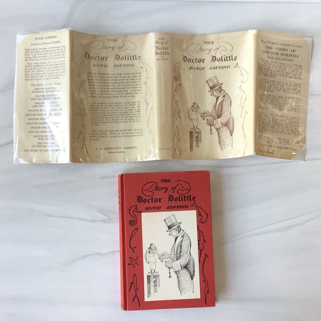 Red binding with black tooling and charming illustration of Dr Dolittle with monkey on front cover, original dust jacket.