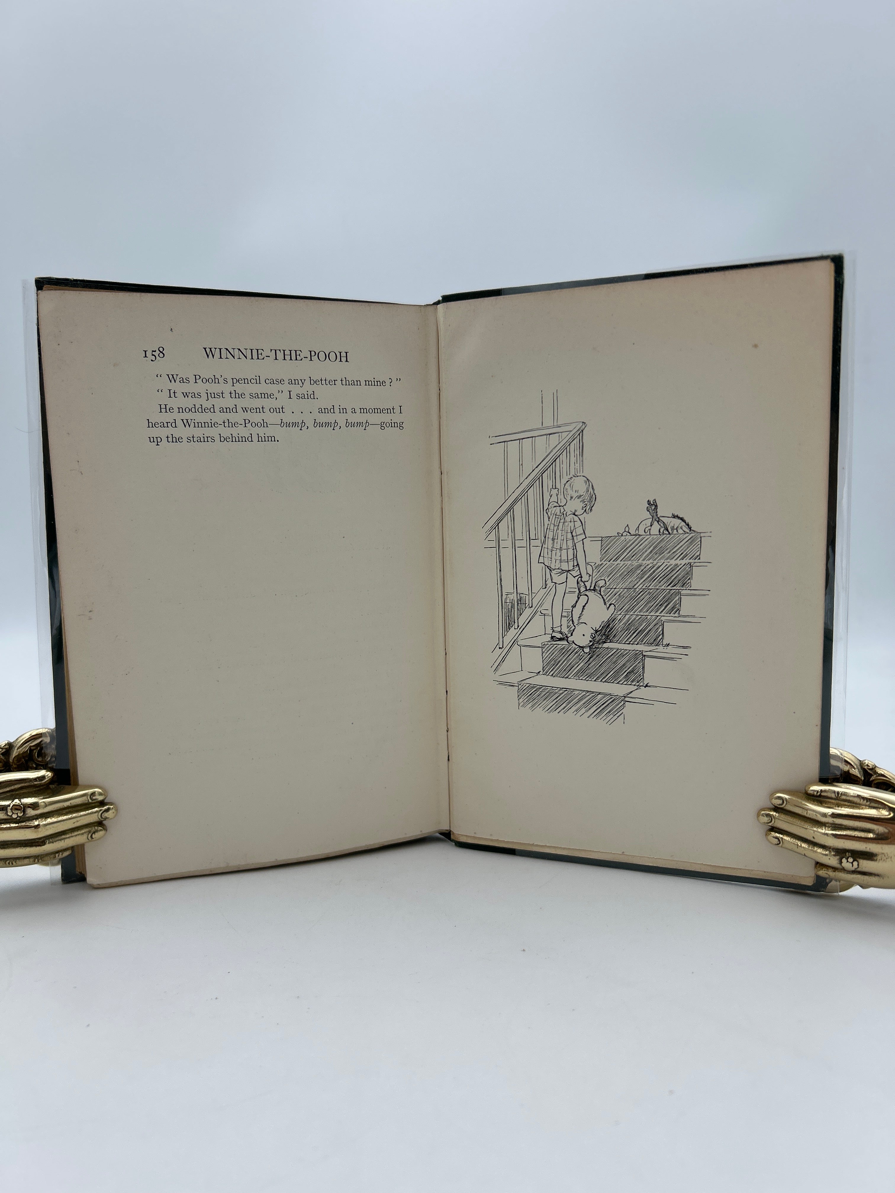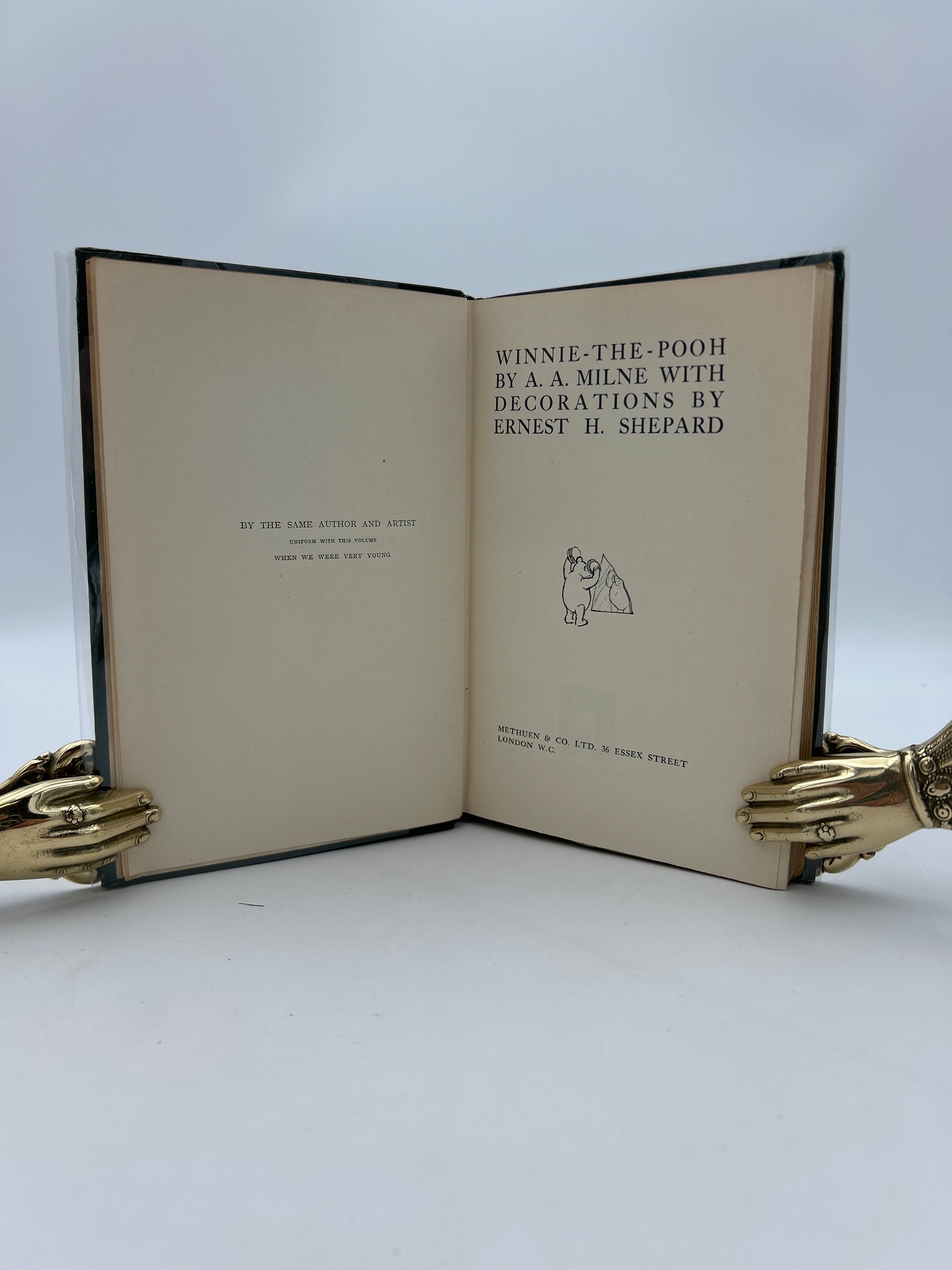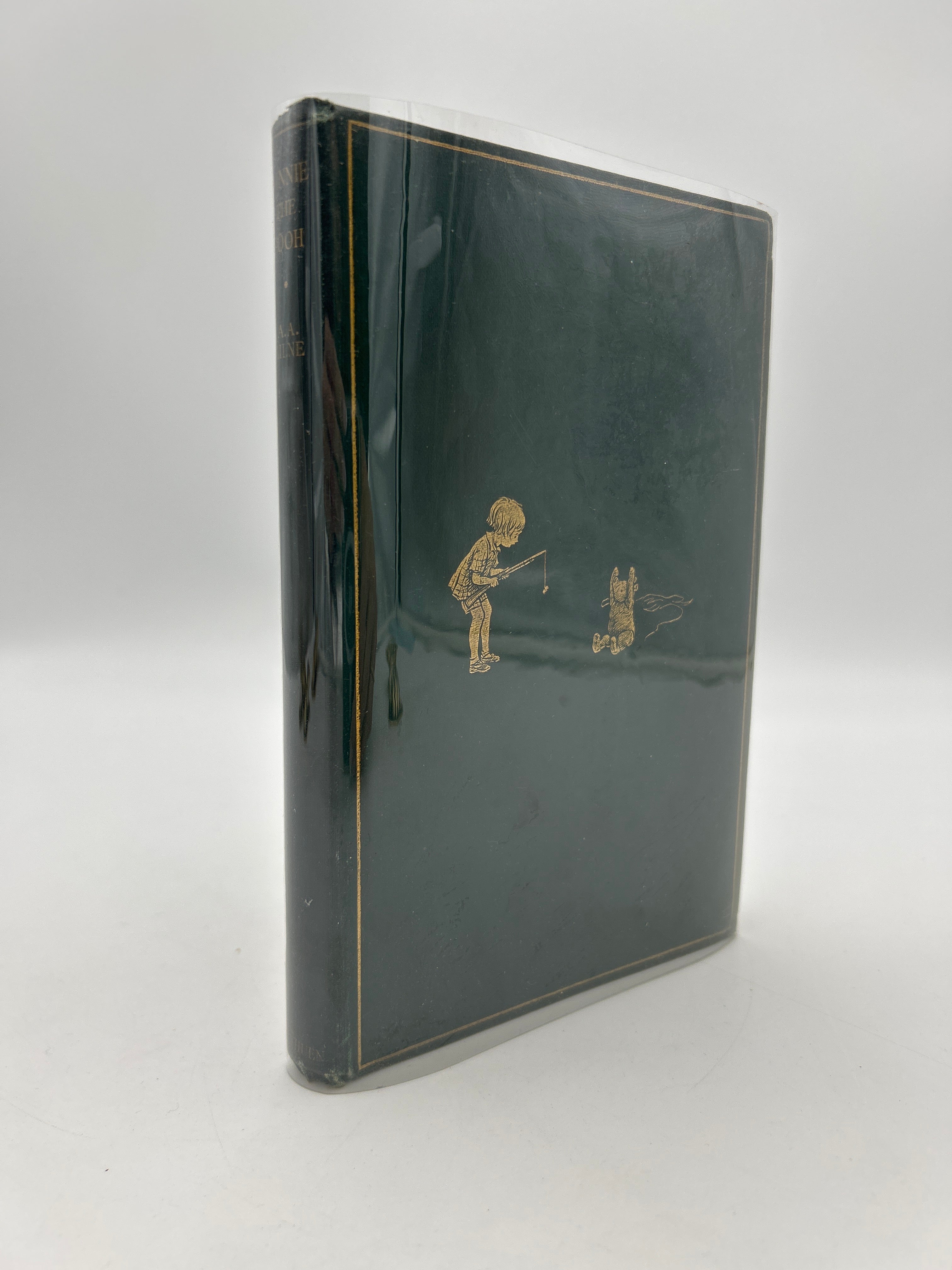Green cloth cover with gold emblem of Christopher Robin and Pooh, gold lettering on spine, some foxing on endpaper. Very fine condition