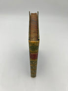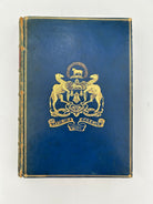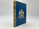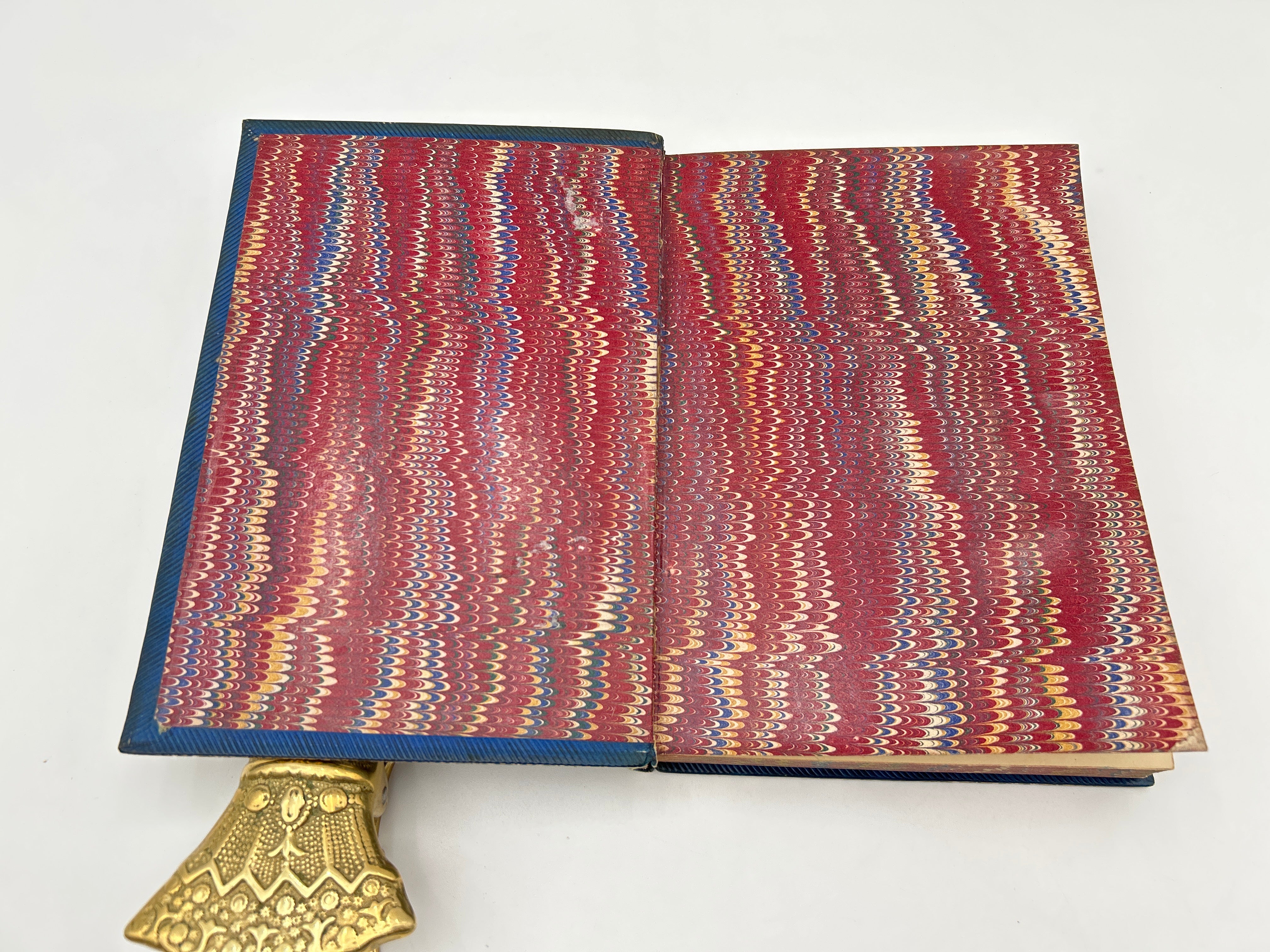 Blue leather cover with gold emblem from University on front board, green binding with gold bands and red label on spine, marbling on three edges on the paper, marbling on the inside and back of book.