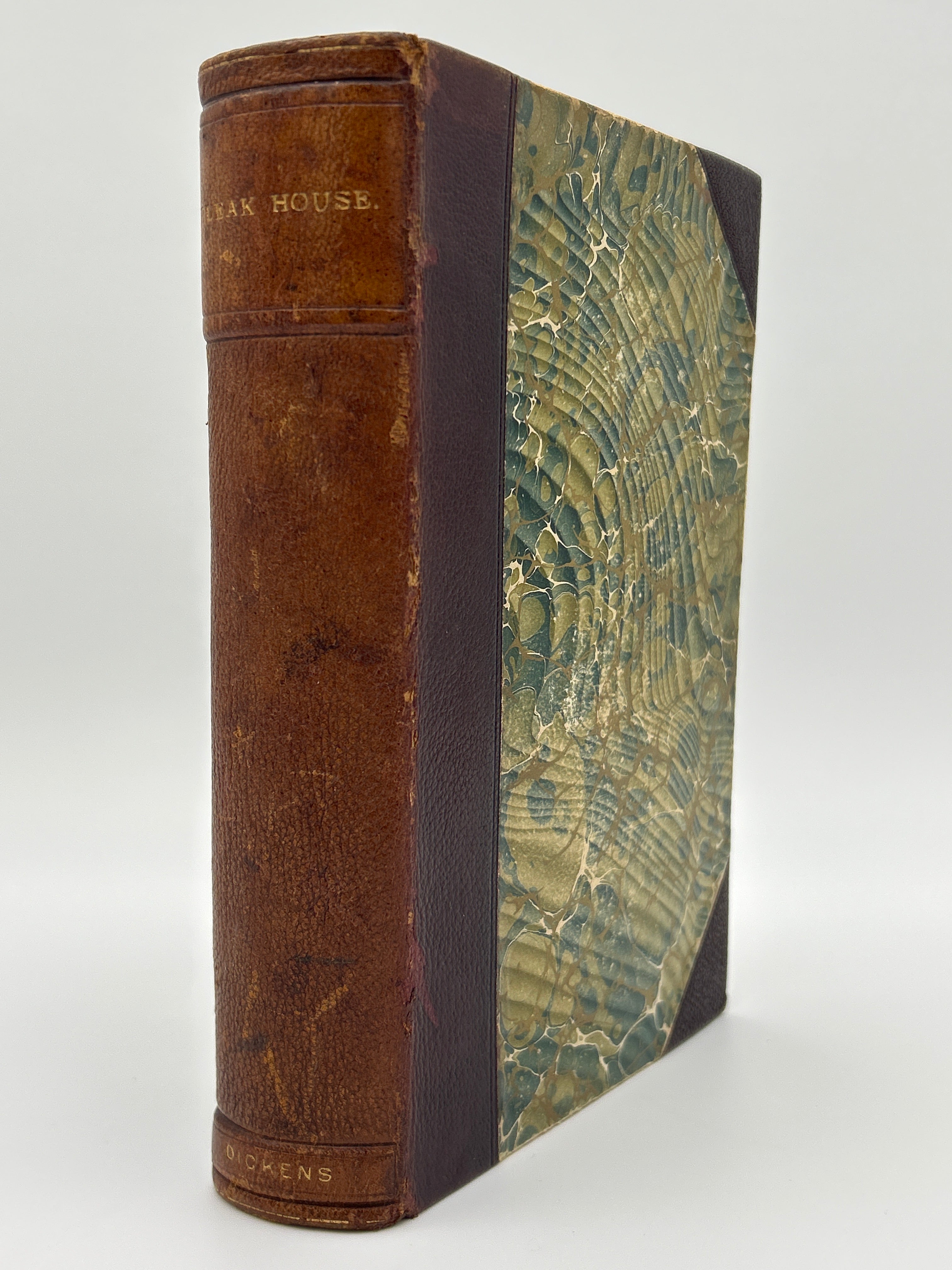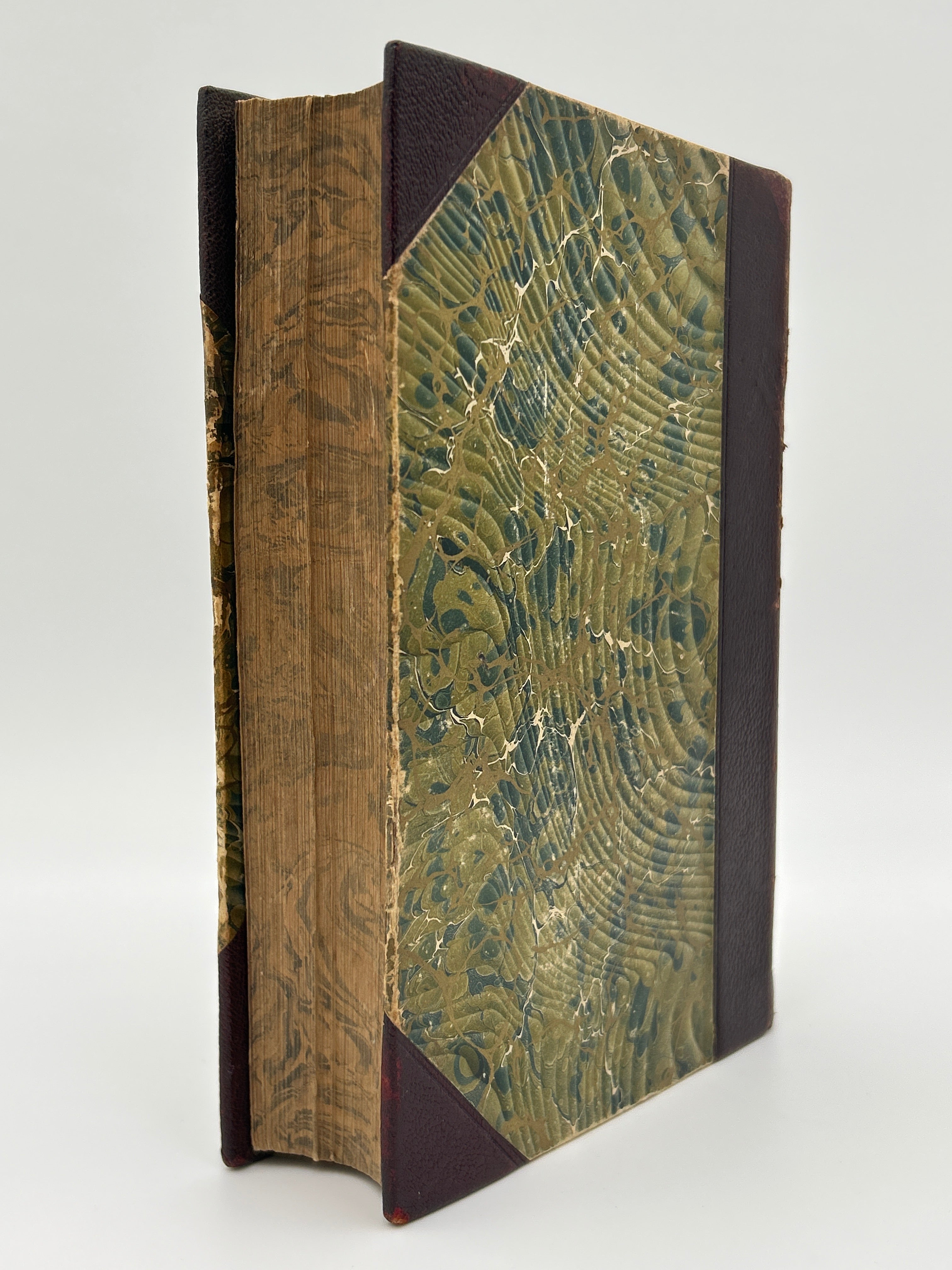 Brown 3/4 leather binding, green & gold marbled front and back, binding with gold embossing, name plate on spine, marble page edges, fine condition.
