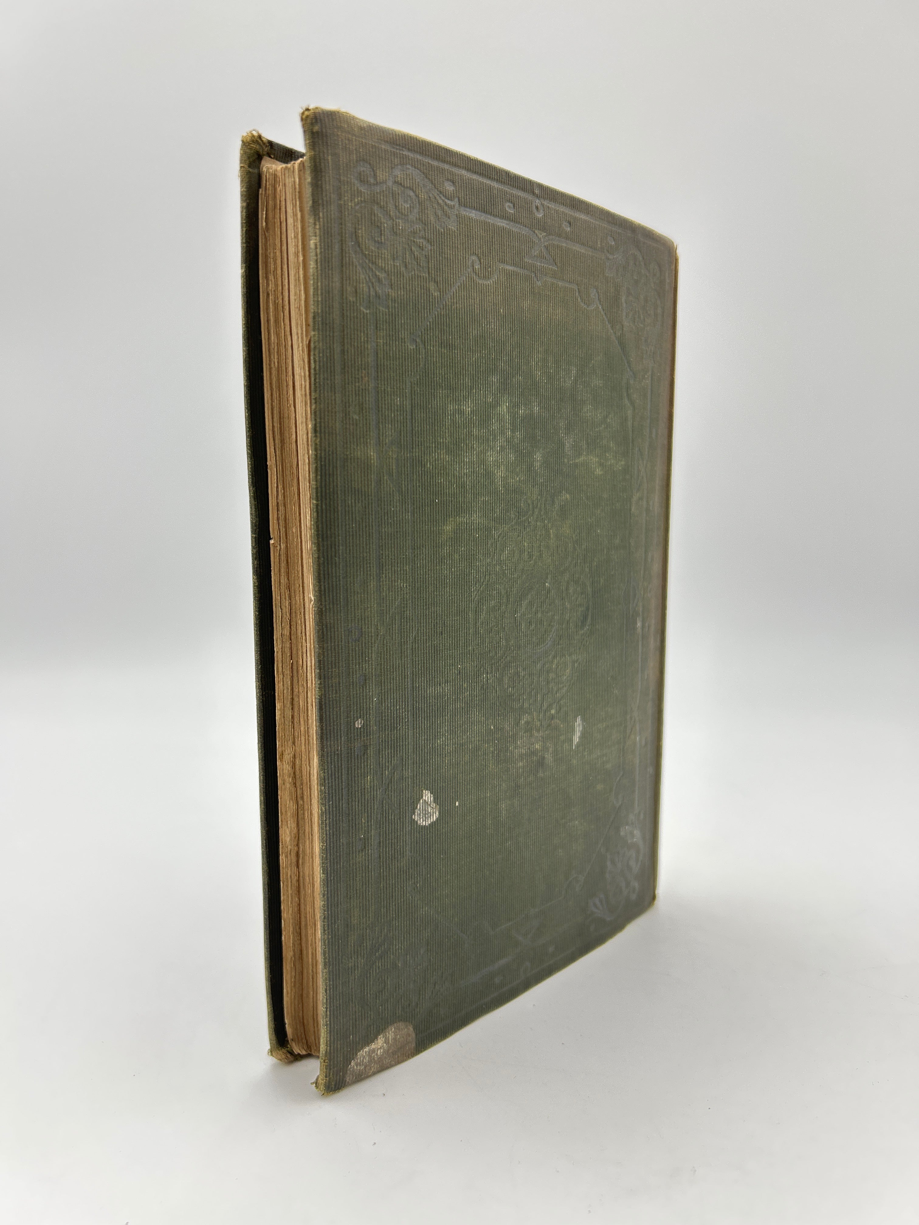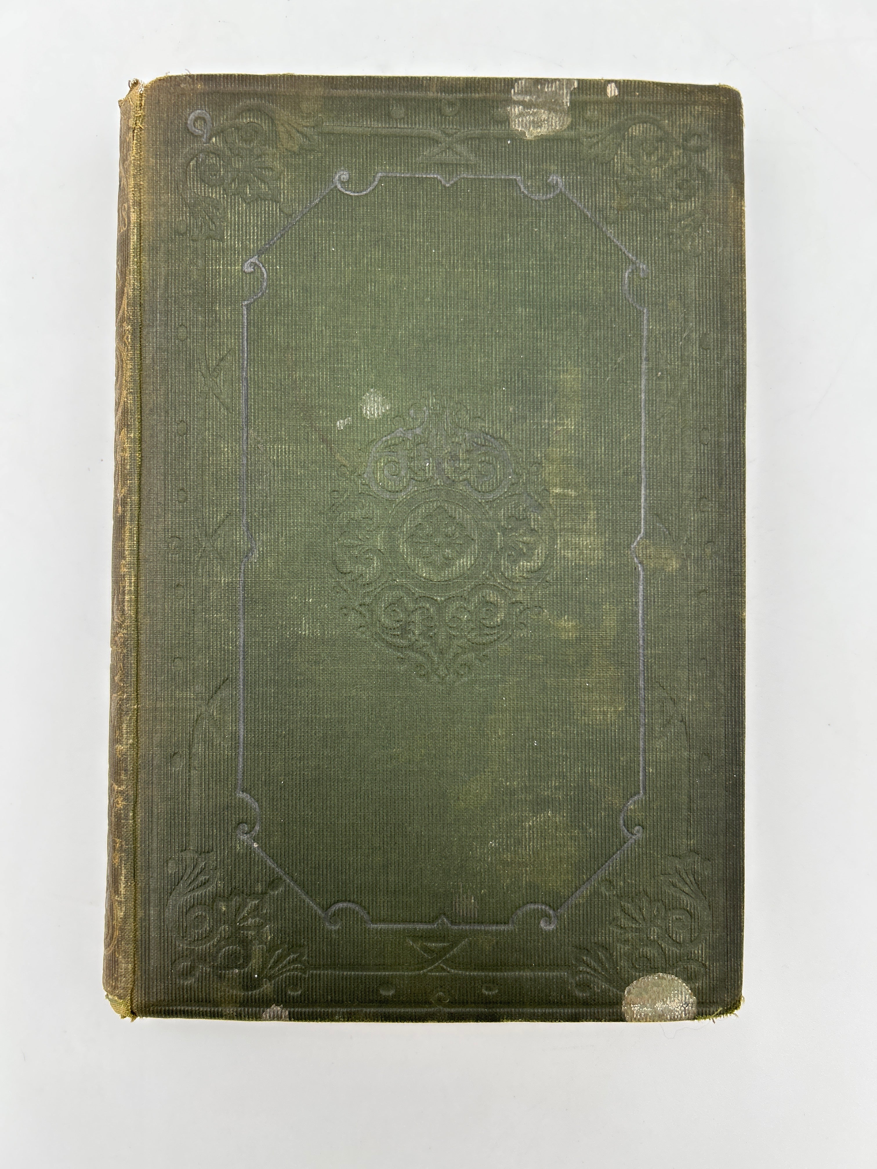 Green cloth embossed cover, gold etching and letters on spine, some stains on front and back, intact, clear dust jacket, fair condition.