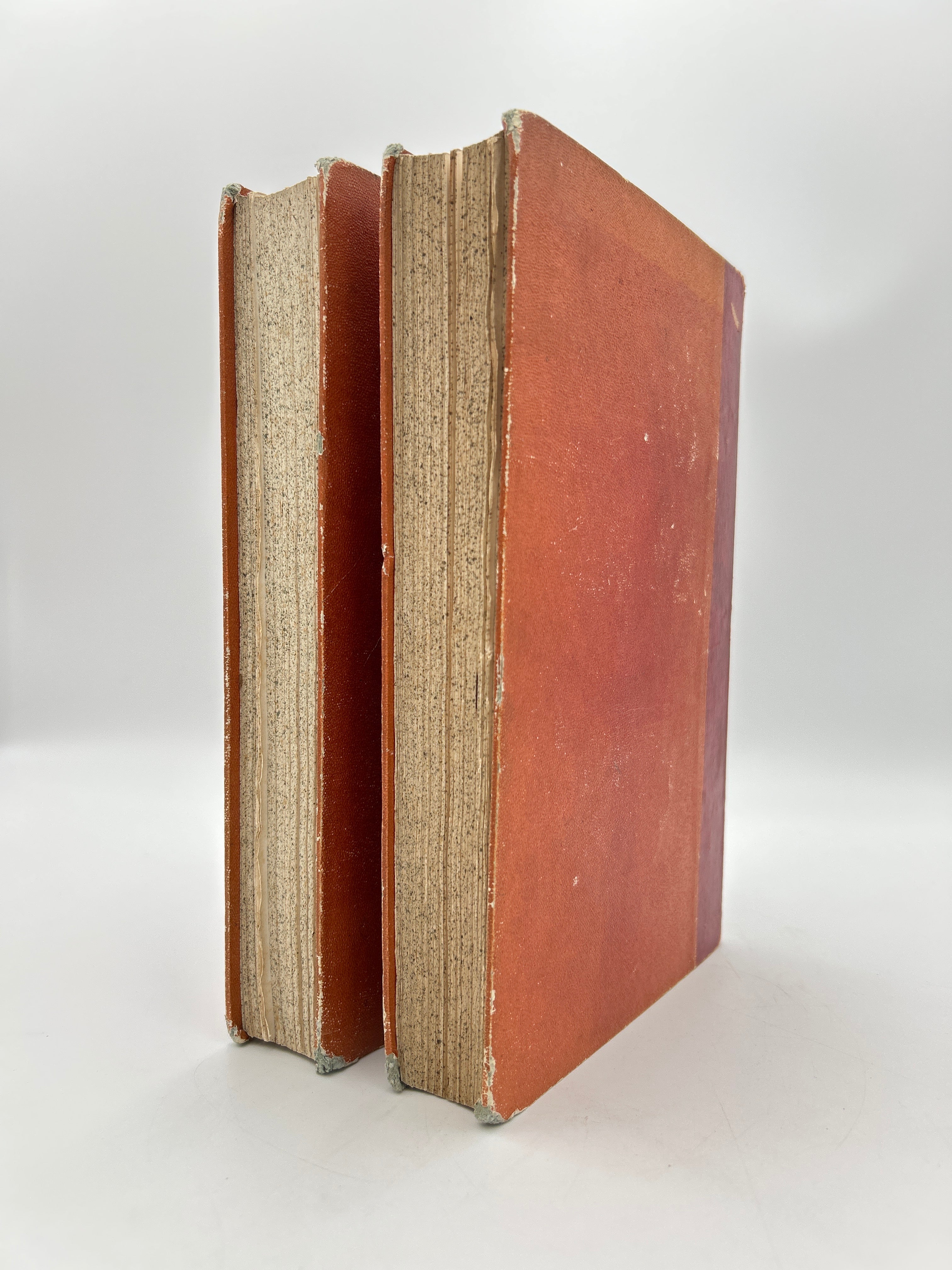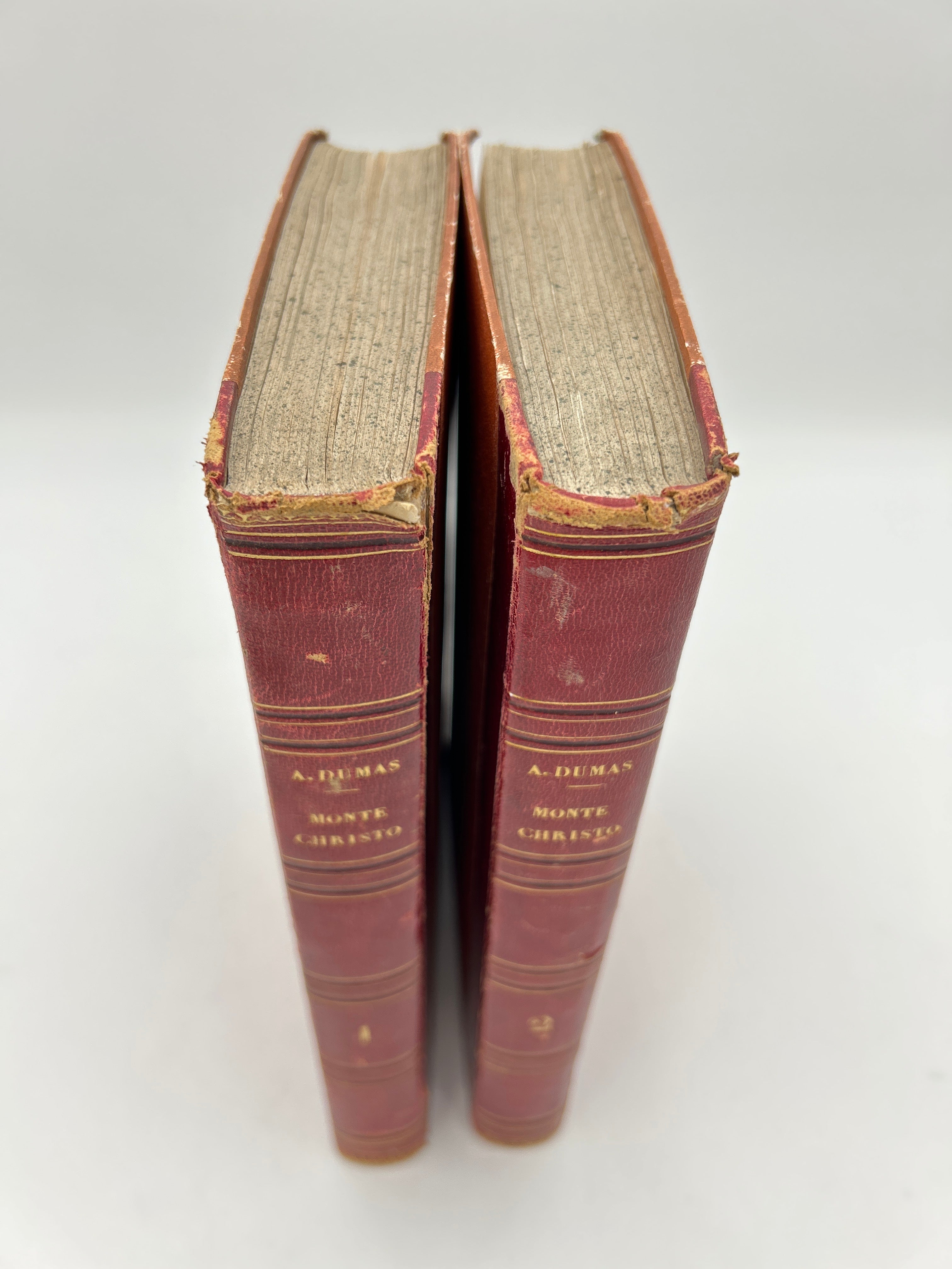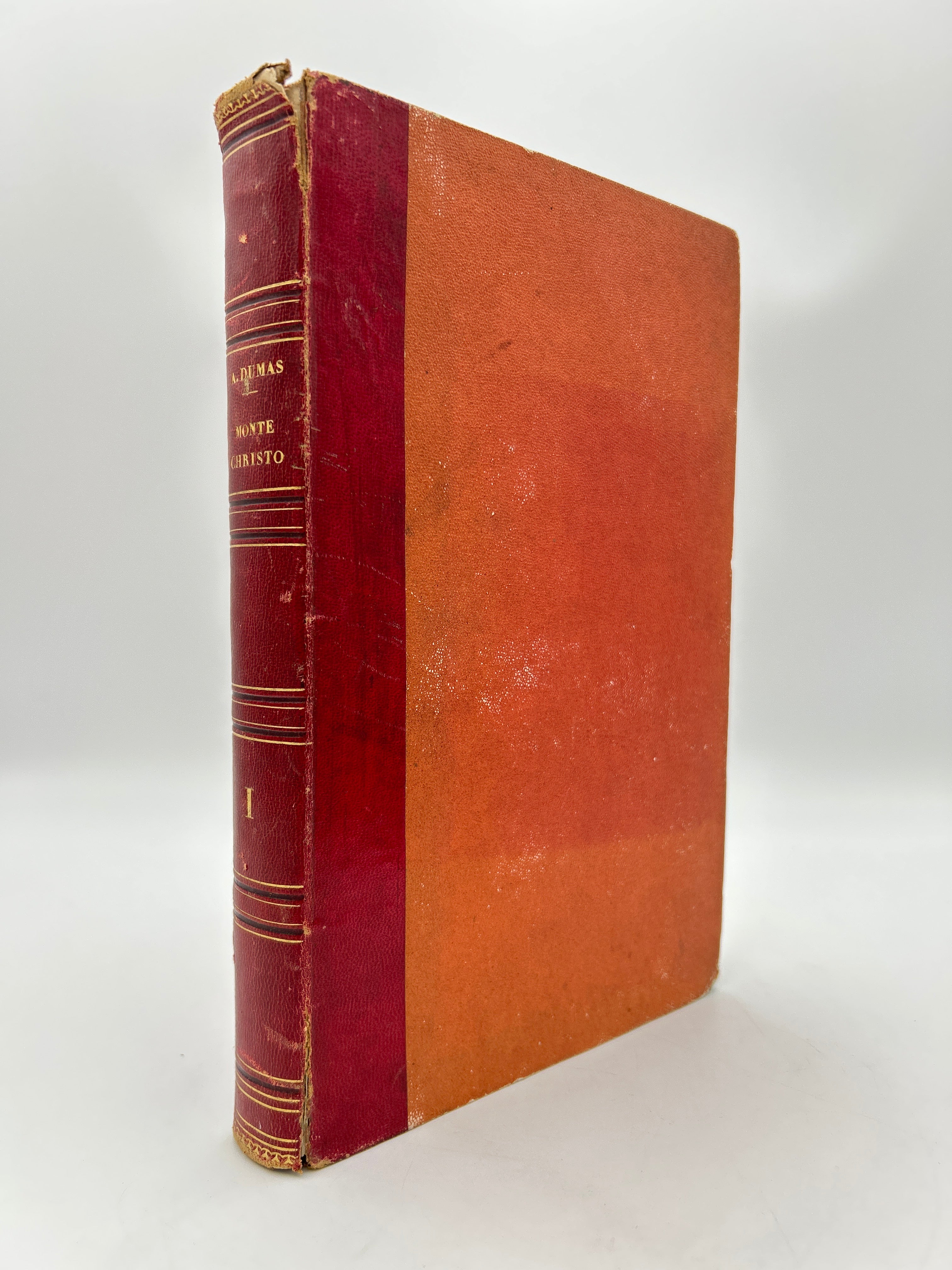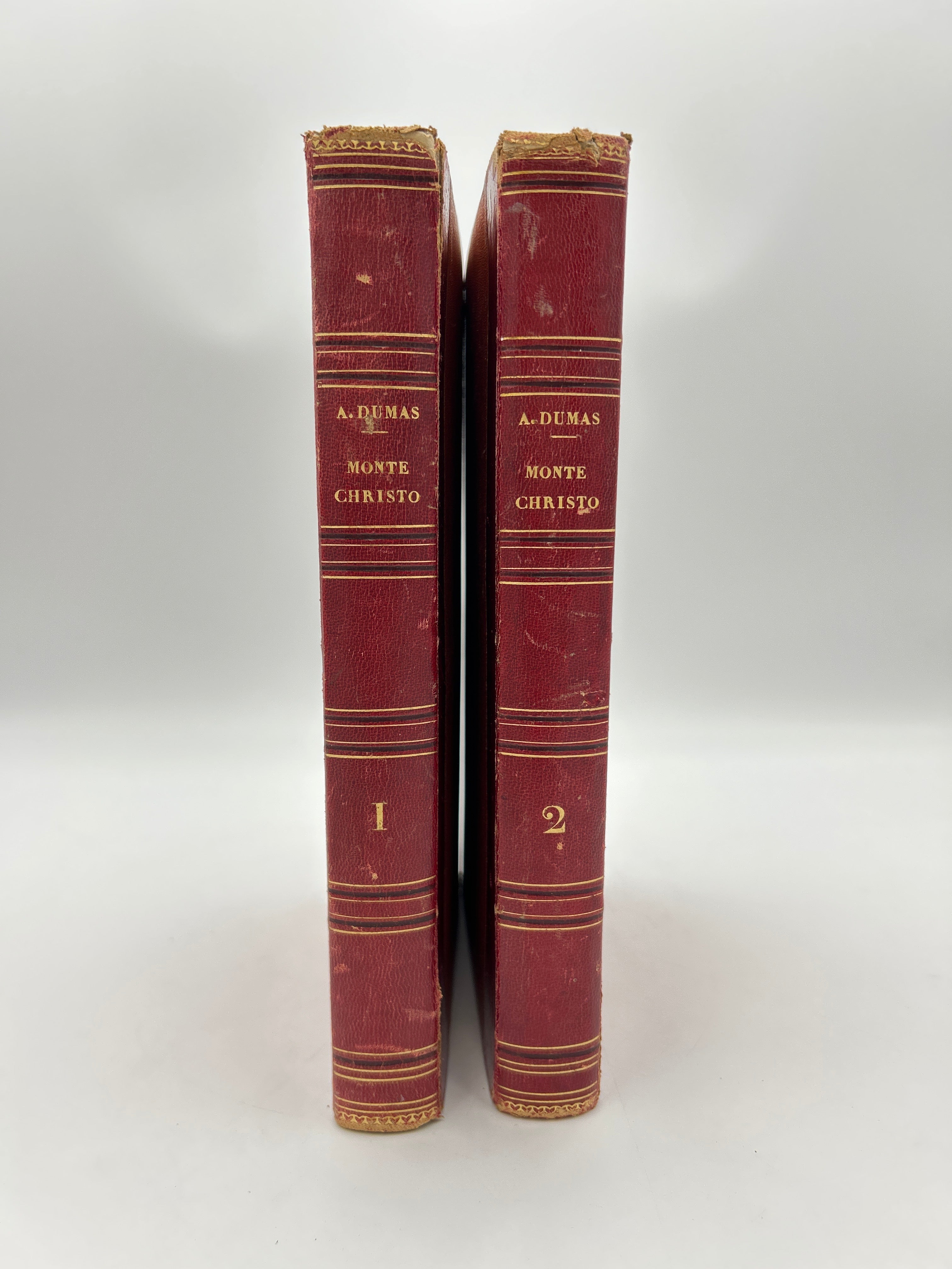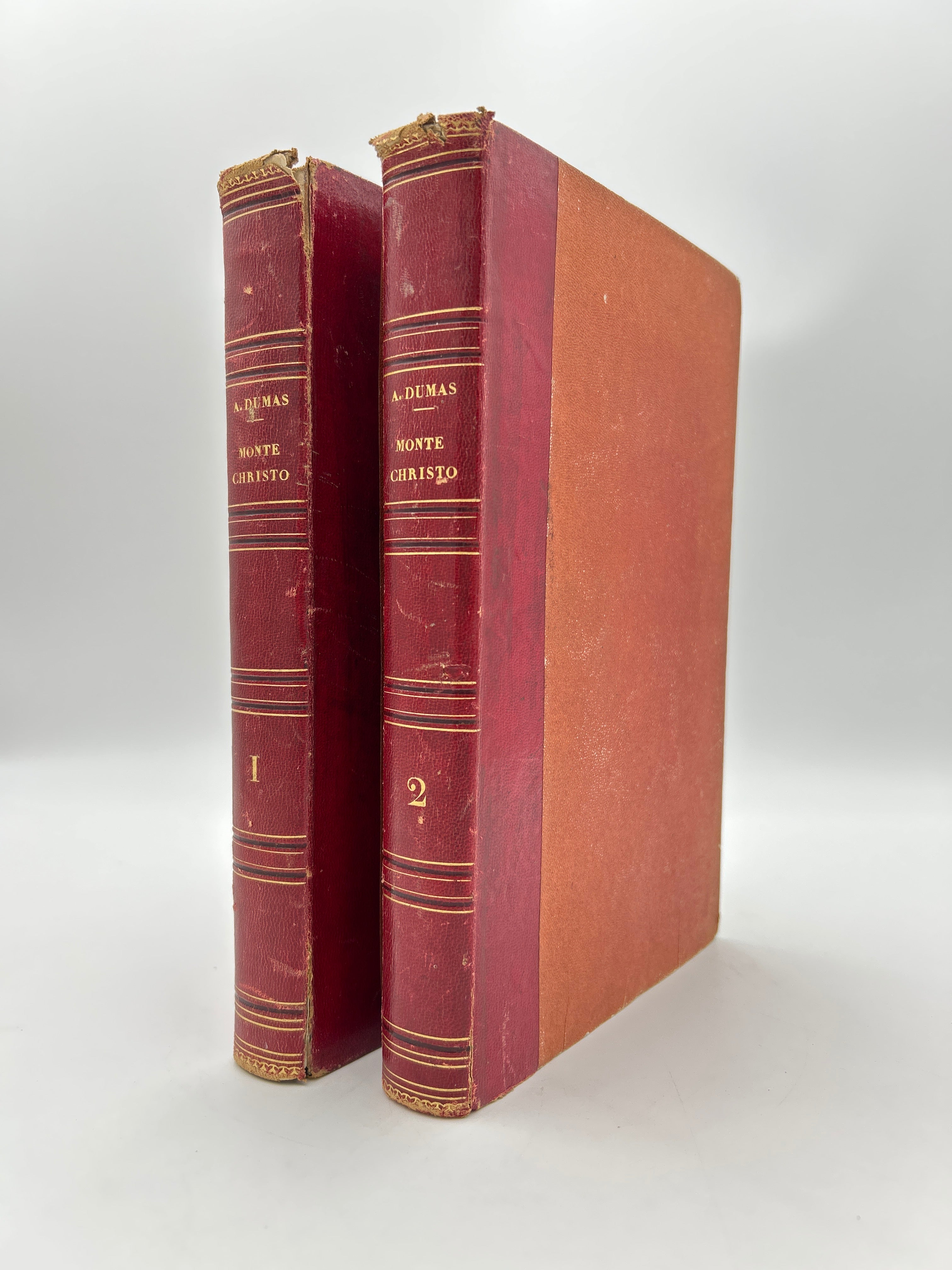 First French illustrated edition of one of Alexandre Dumas' most famous works. Red leather spine with gold embossed title, volume number, and lines. Spine has some wear and tear with one small piece cut out of leather on Volume 2. Slightly faded red/orange cloth binding with some discoloration. Tearing on top and bottom corners of leather spine. Overall fair condition.
