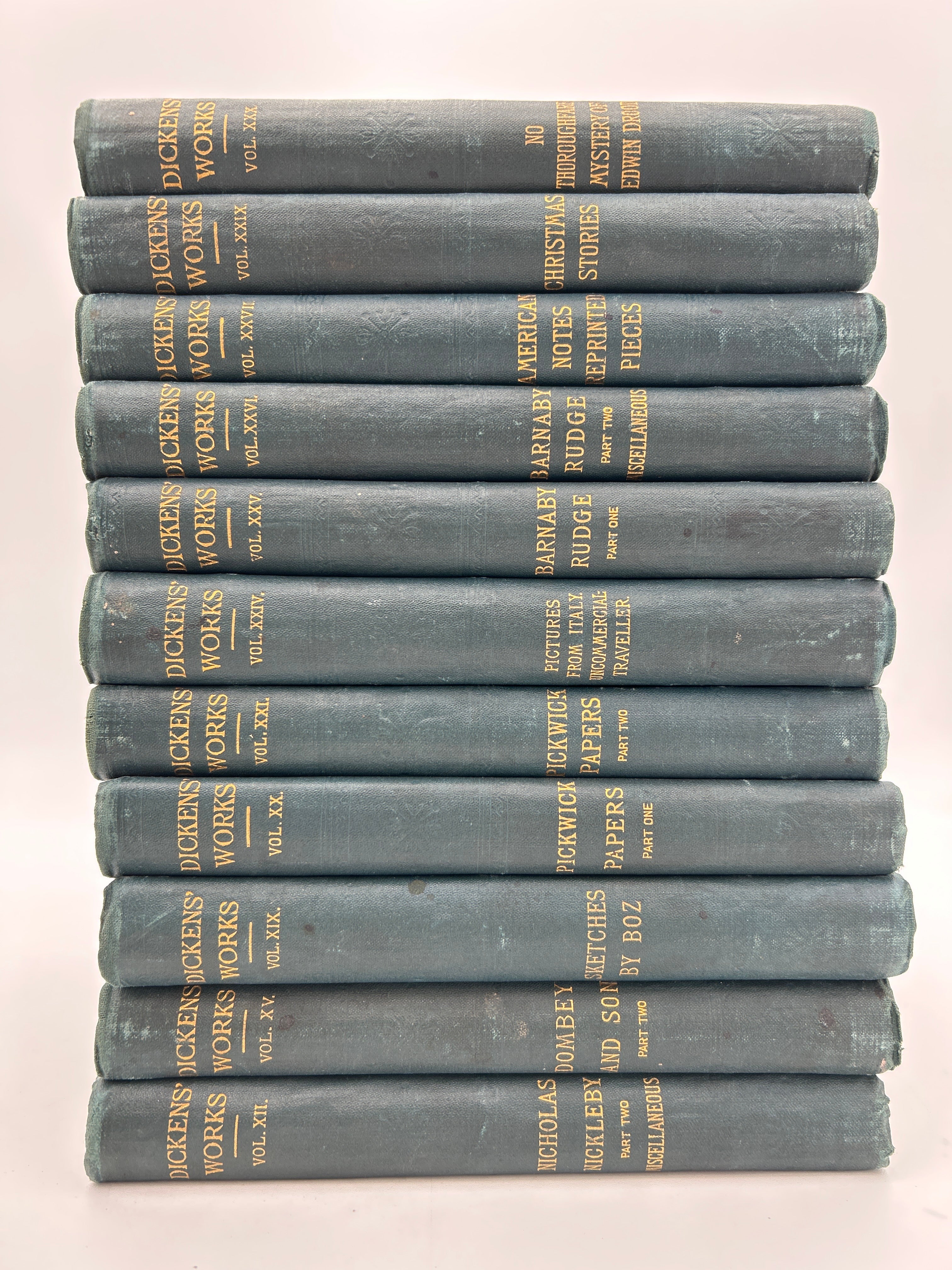 Dark blue cloth, gold lettering on spine"It was the best of times, it was the worst of times, it was the age of wisdom, it was the age of foolishness.", rubbing on spine and covers. Missing eight volumes of the thirty volume set