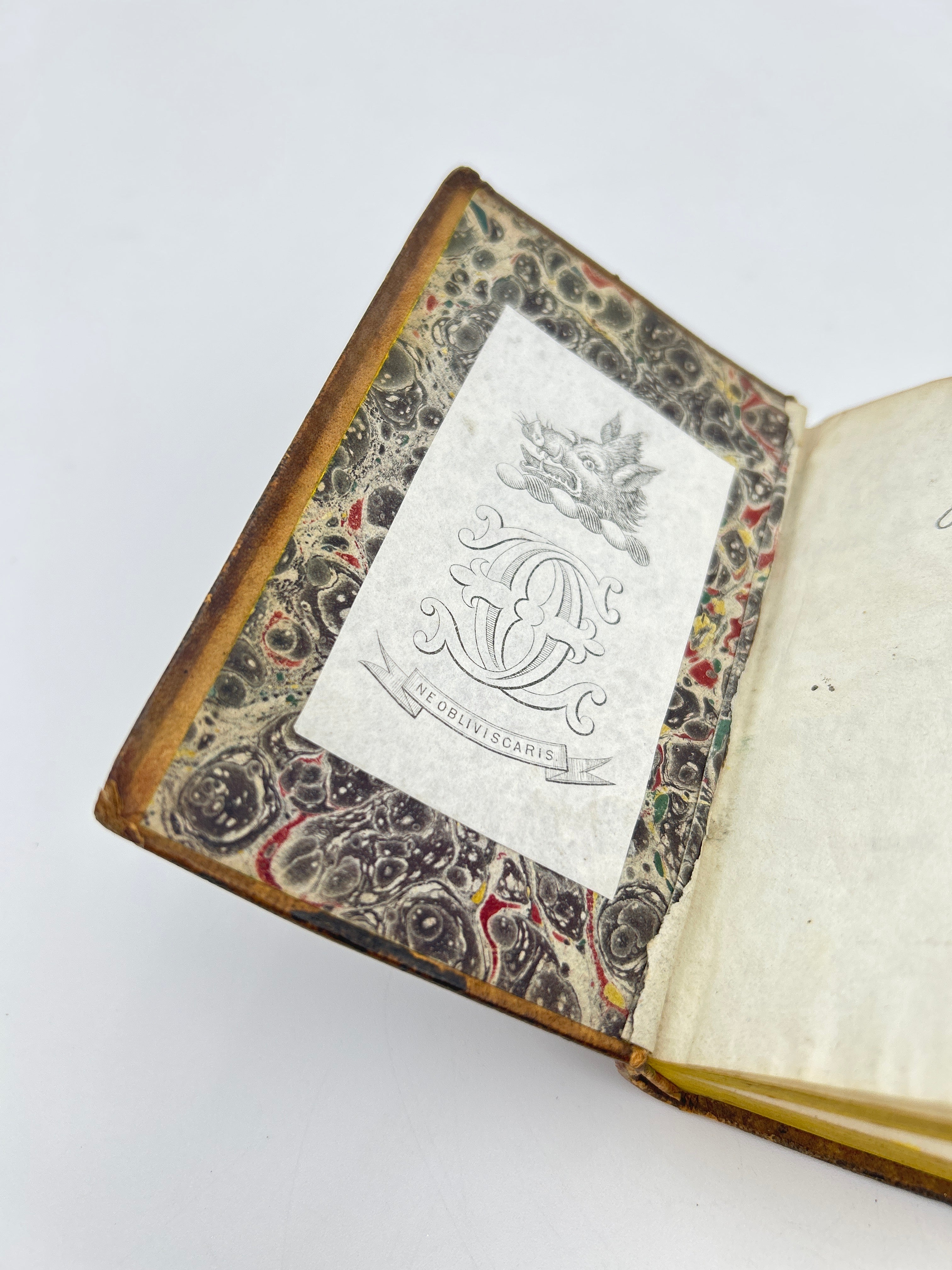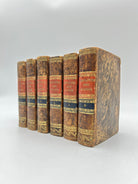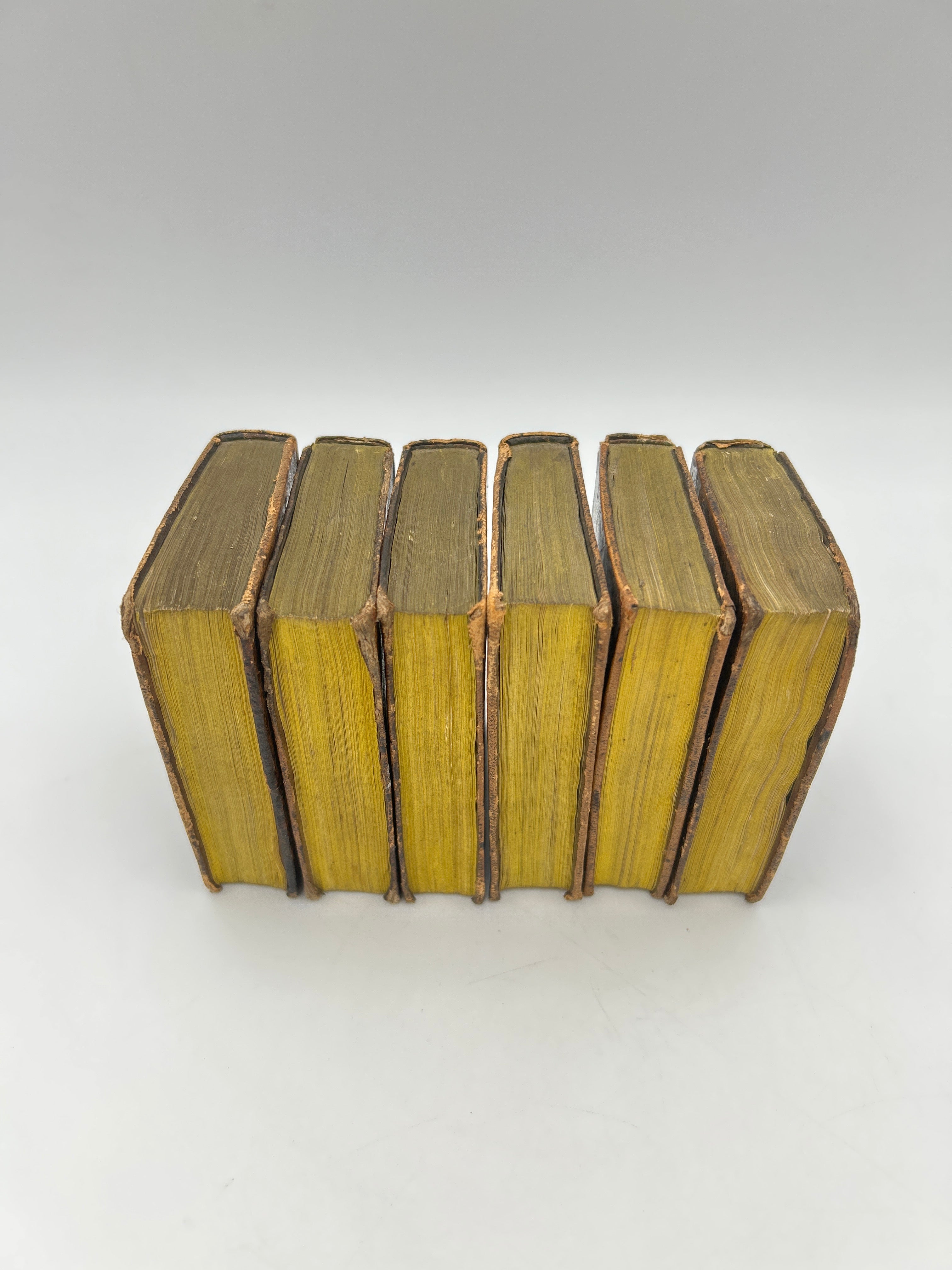 Six volumes pocket size classic, brown marbled binding, gold tooling on spine, rust title label on spine, black label with volume number printed, three bright yellow edge (top edge faded to brown), intact, rubbing on upper top spine, good condition.