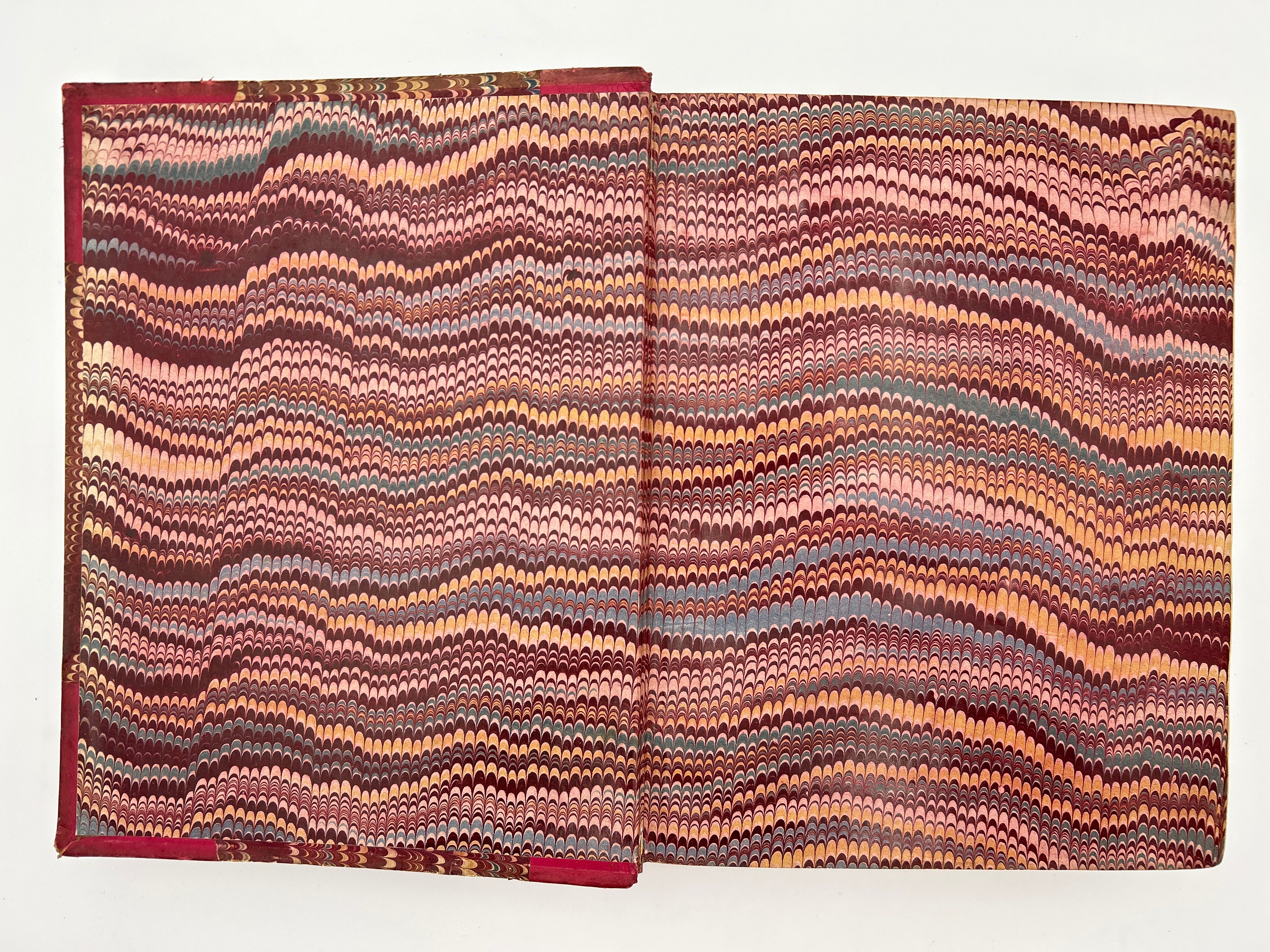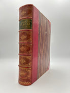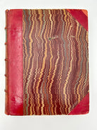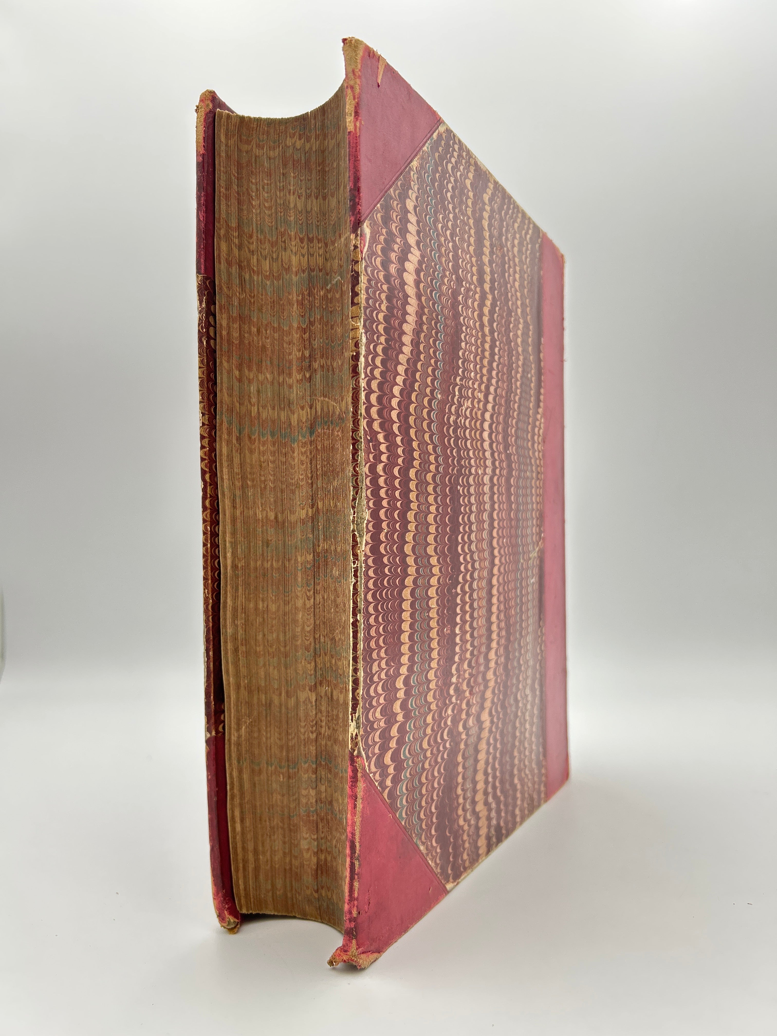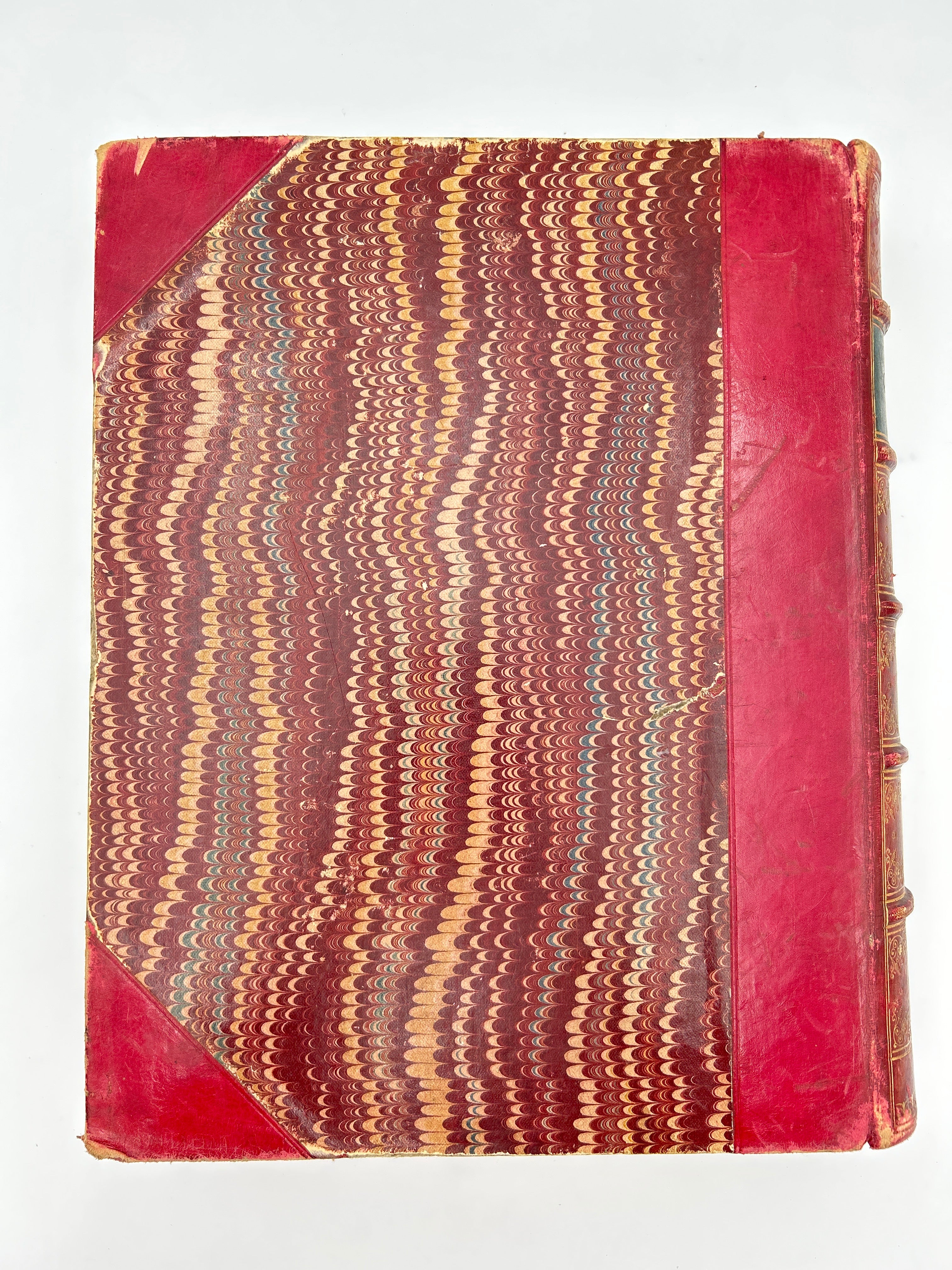 Three quarter red leather with marbled boards. Five raised bands with gilt embossed decorative elements and black leather label in the second compartment with gilt lettering. Marbled endpapers and all edges marbled. Many engravings throughout. One inch tear to the upper center of the upper board. General scuffing to boards. Bumped corners and rubbing to the extremities. Some fading to the spine. Foxing to the flyleaves but almost none throughout the rest of the book. Fully intact. Fine condition overall.