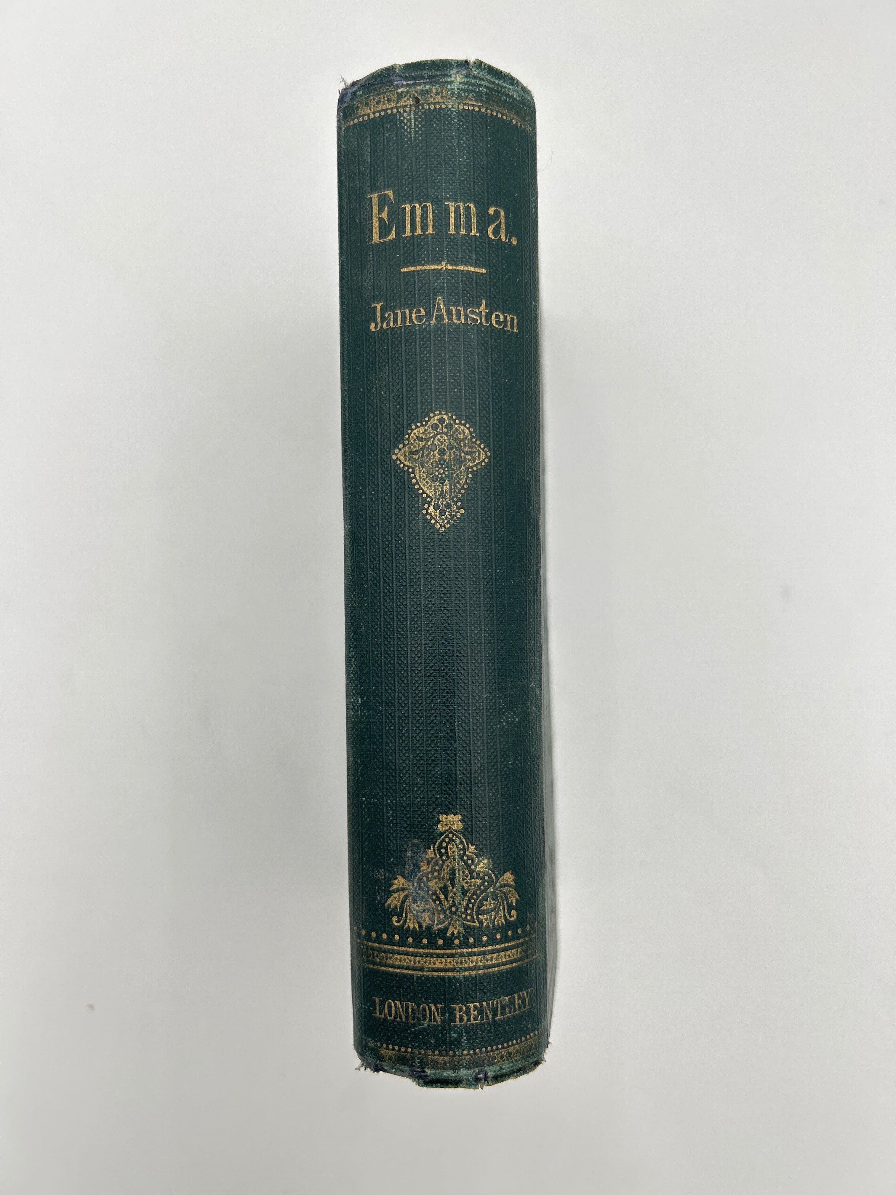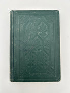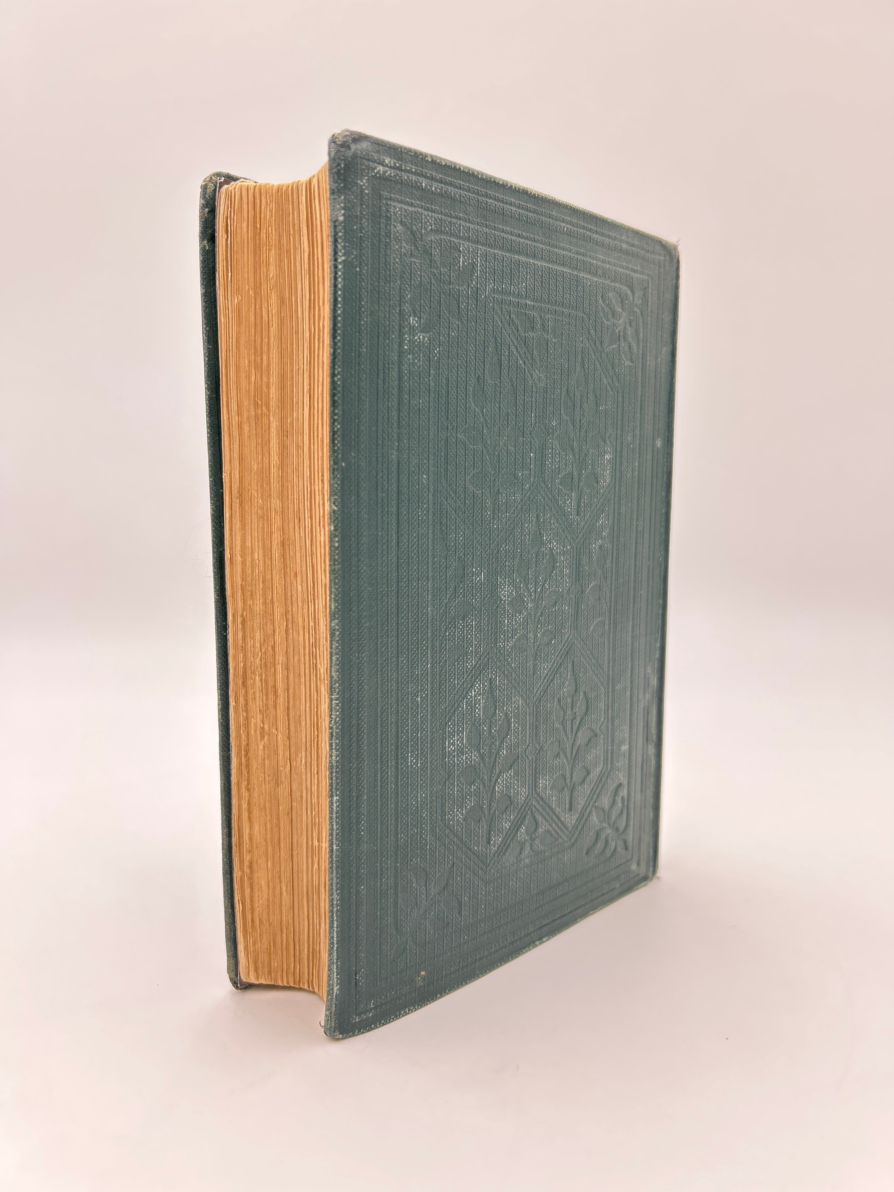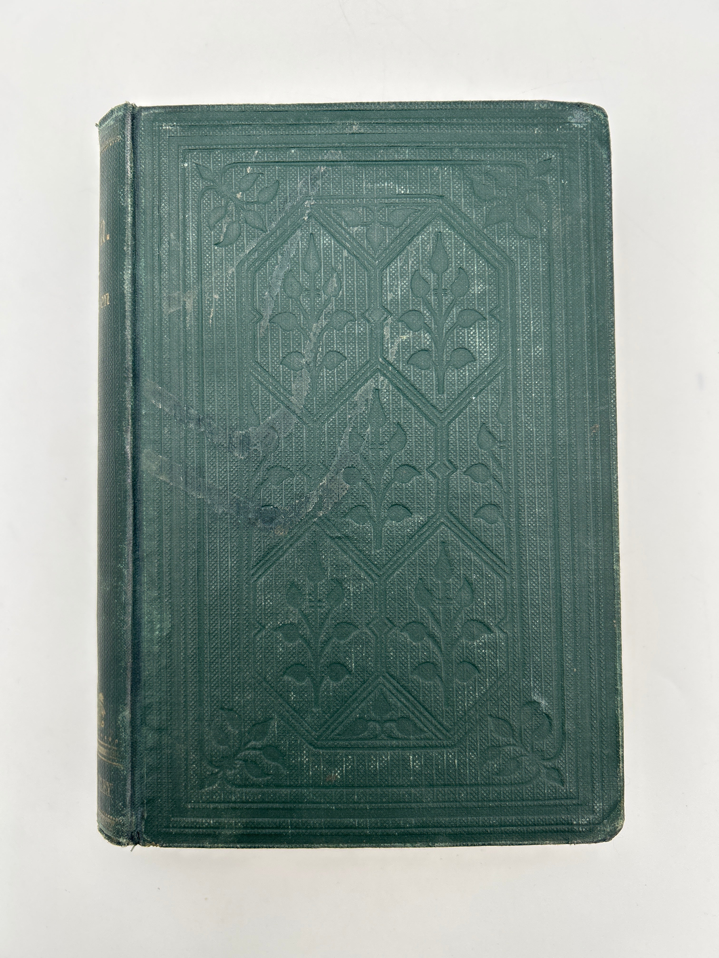 Green cloth cover with embossing on front and spine, gold lettering on spine, good condition.