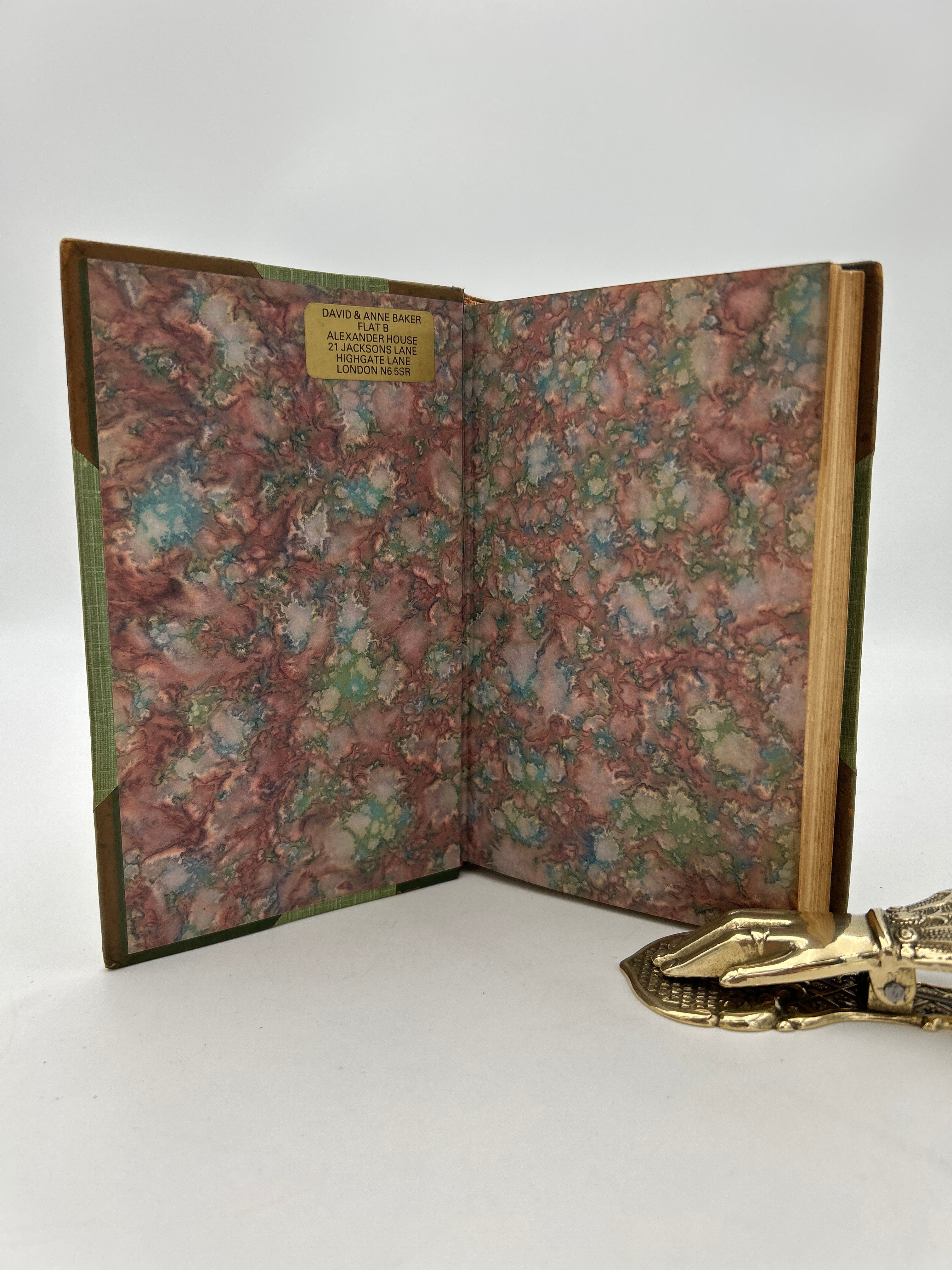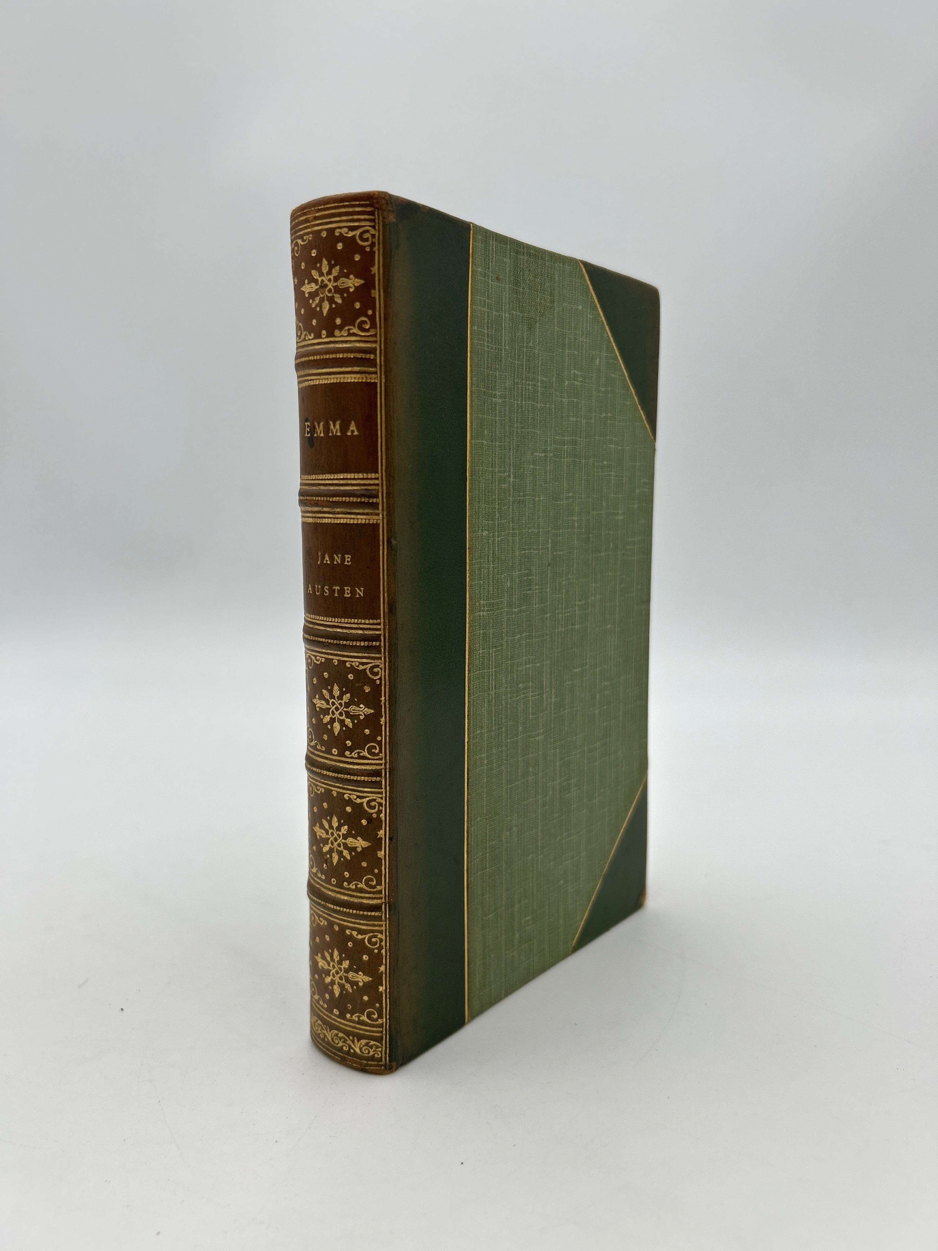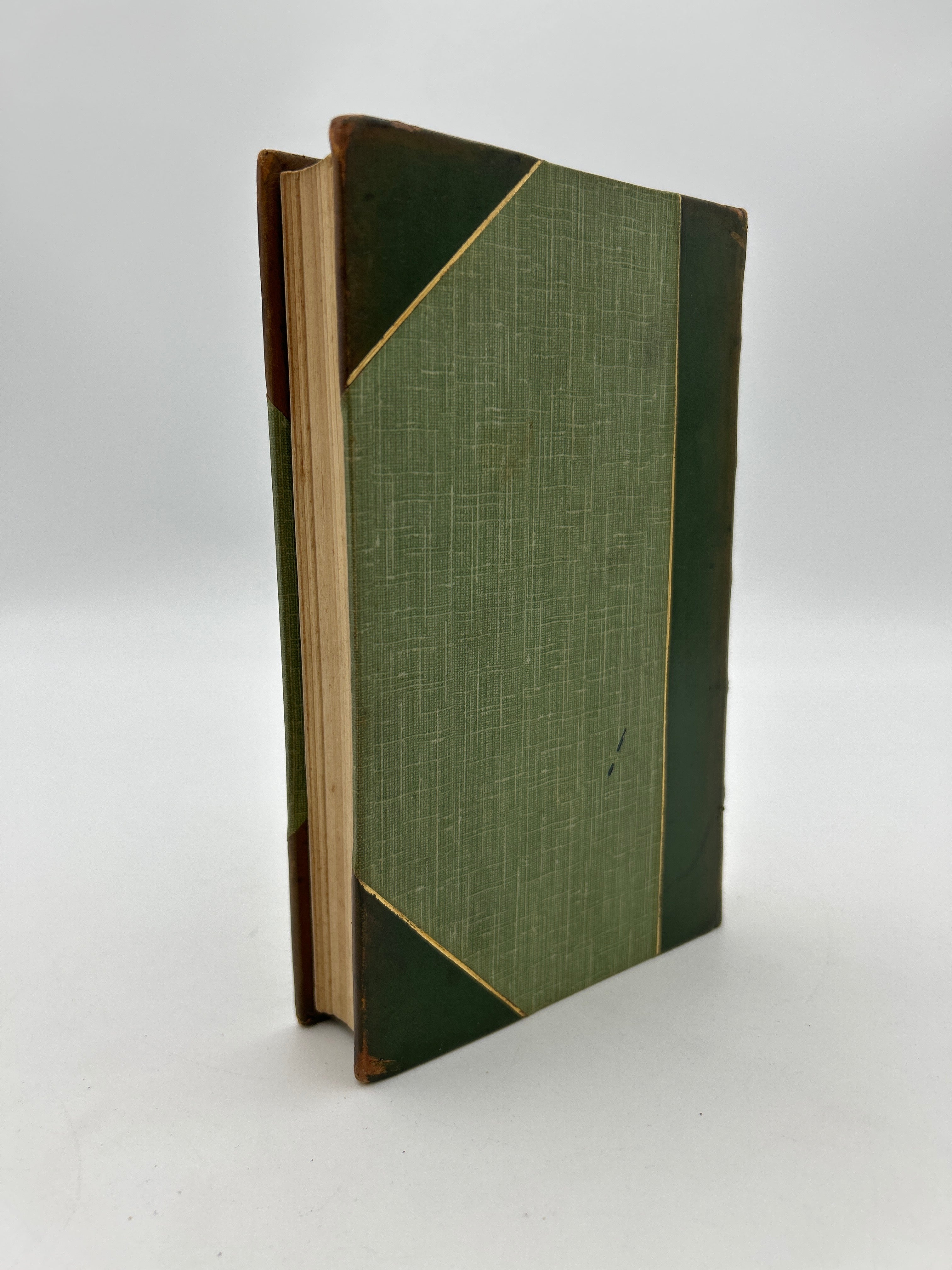 Green canvas boards with green leather three quarter binding. Gilt lines along each section of leather. Five raised bands with gilt ornamentation in each compartment and lettering in the second and third compartment. Gilt top edge. Marbled endpapers. Sun fading making the spine appear a light brown. Rubbing to the edges and bumped points. Fully intact. Fine condition overall.