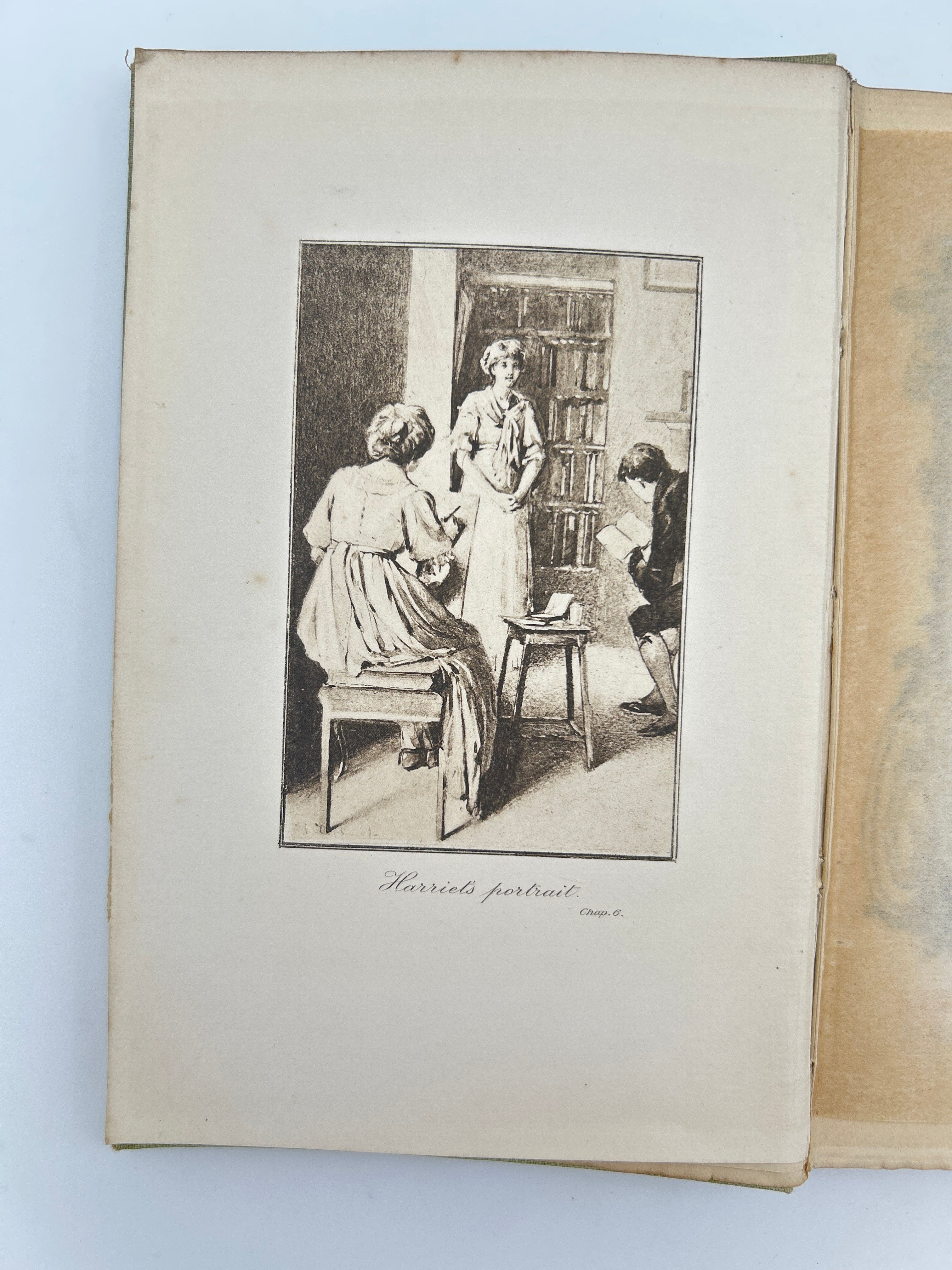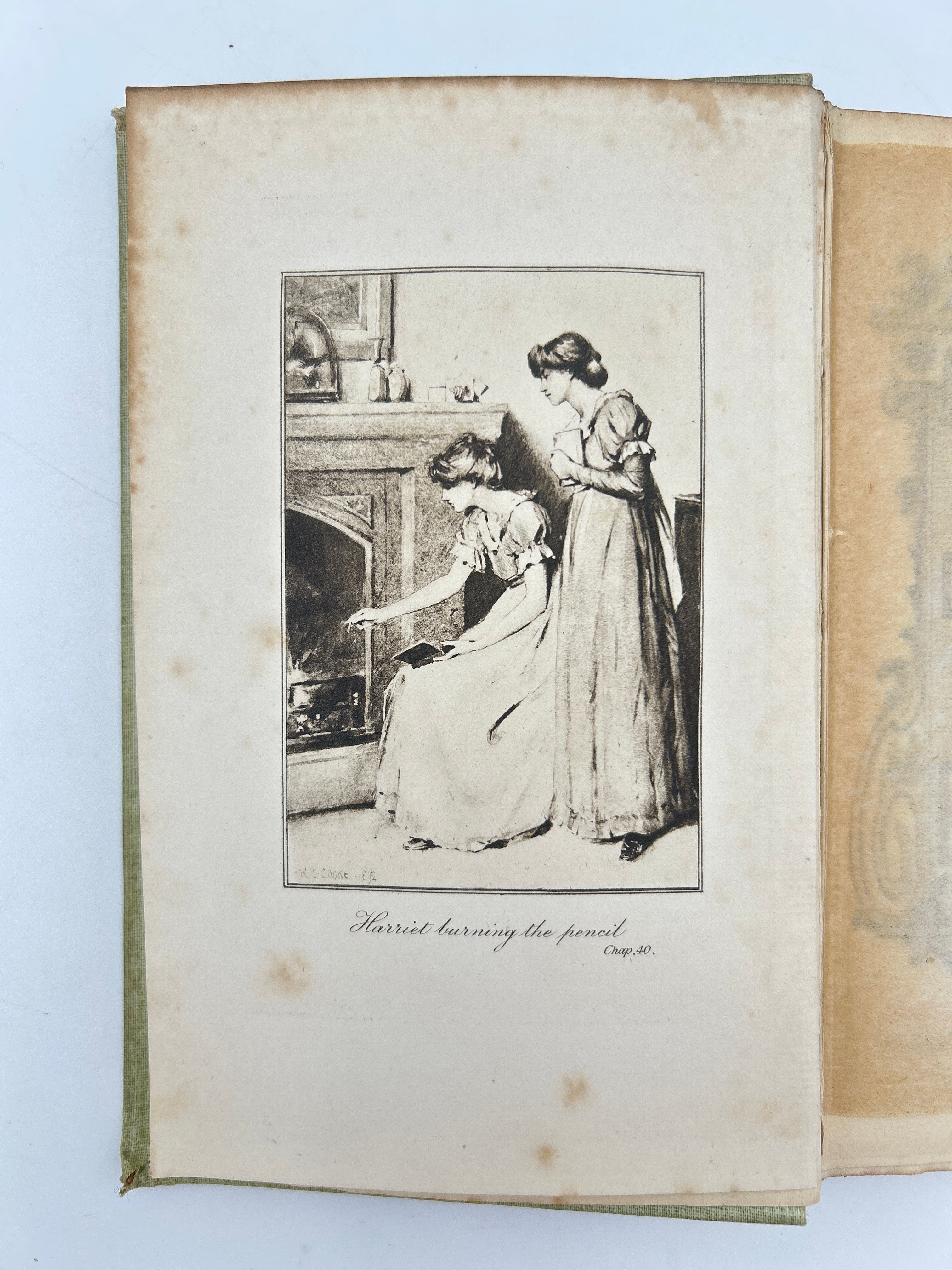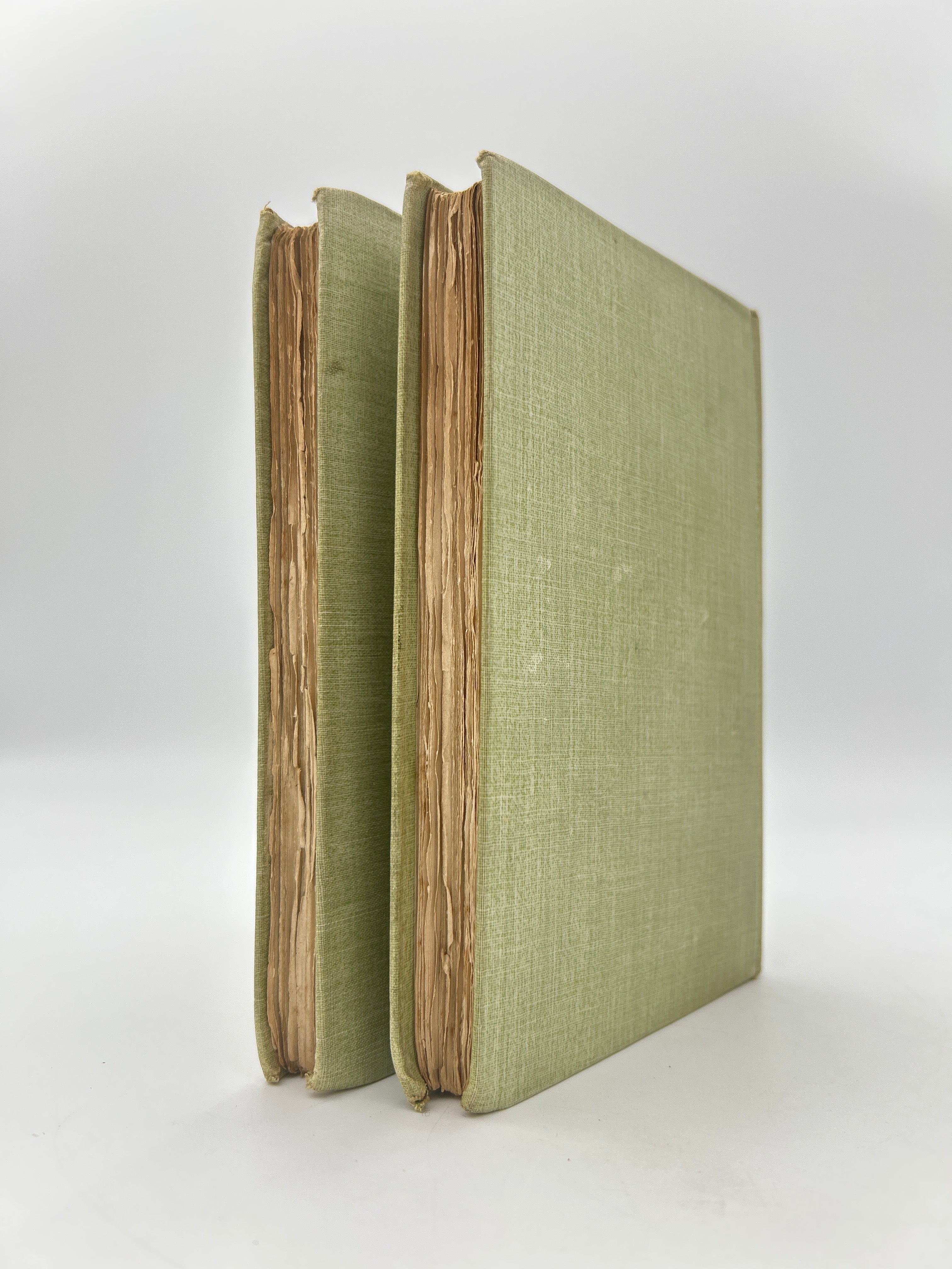 Soft green canvas binding with gilt design on upper board and gilt lettering to upper cover and spine. Image frontispiece with decorative title page. Sun fading to spine. Bumped corners. Damp stained preliminary endpaper.