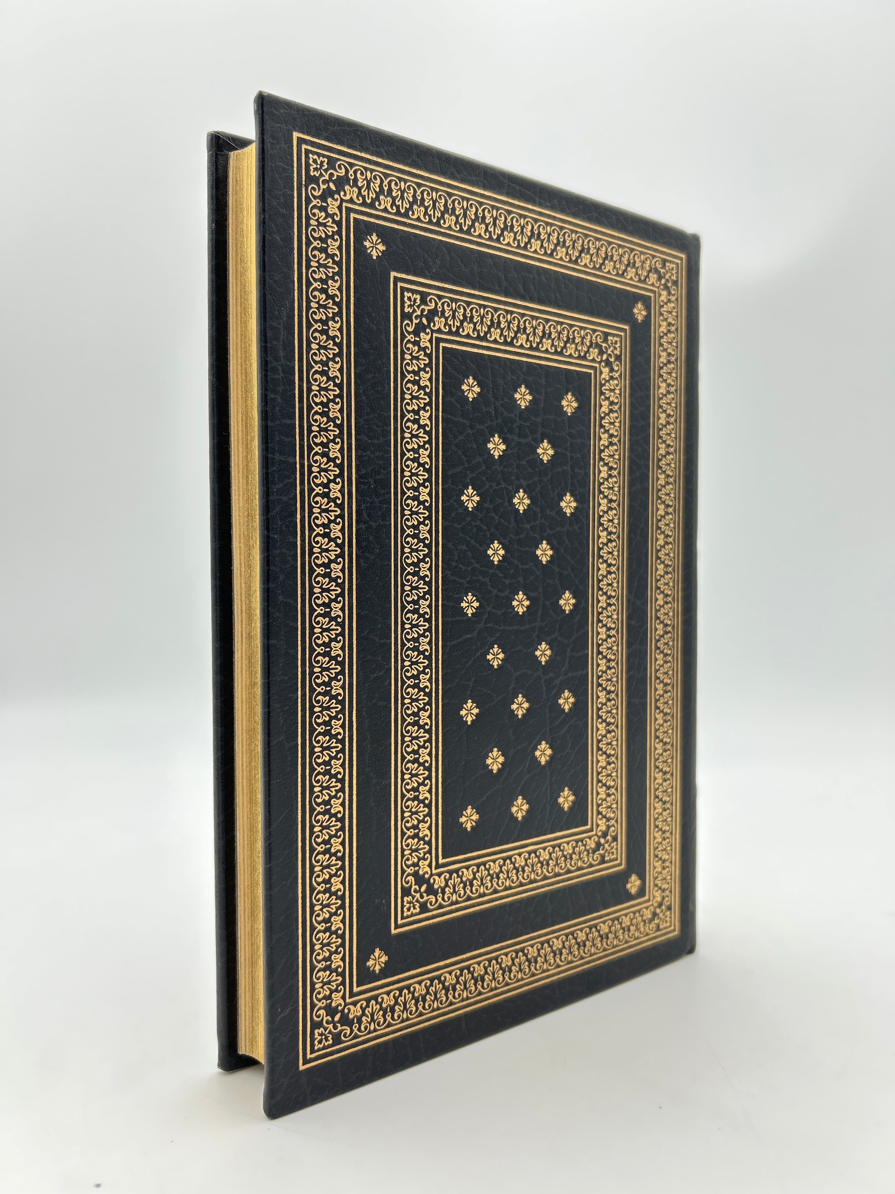 Black leather bound edition with gold embossed detailing on spine, front, and back cover as well as gold embossed lettering on the spine. Gold fore edge with gray silk bookmark and three raised bands. Pristine Franklin Library Edition.