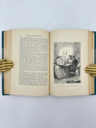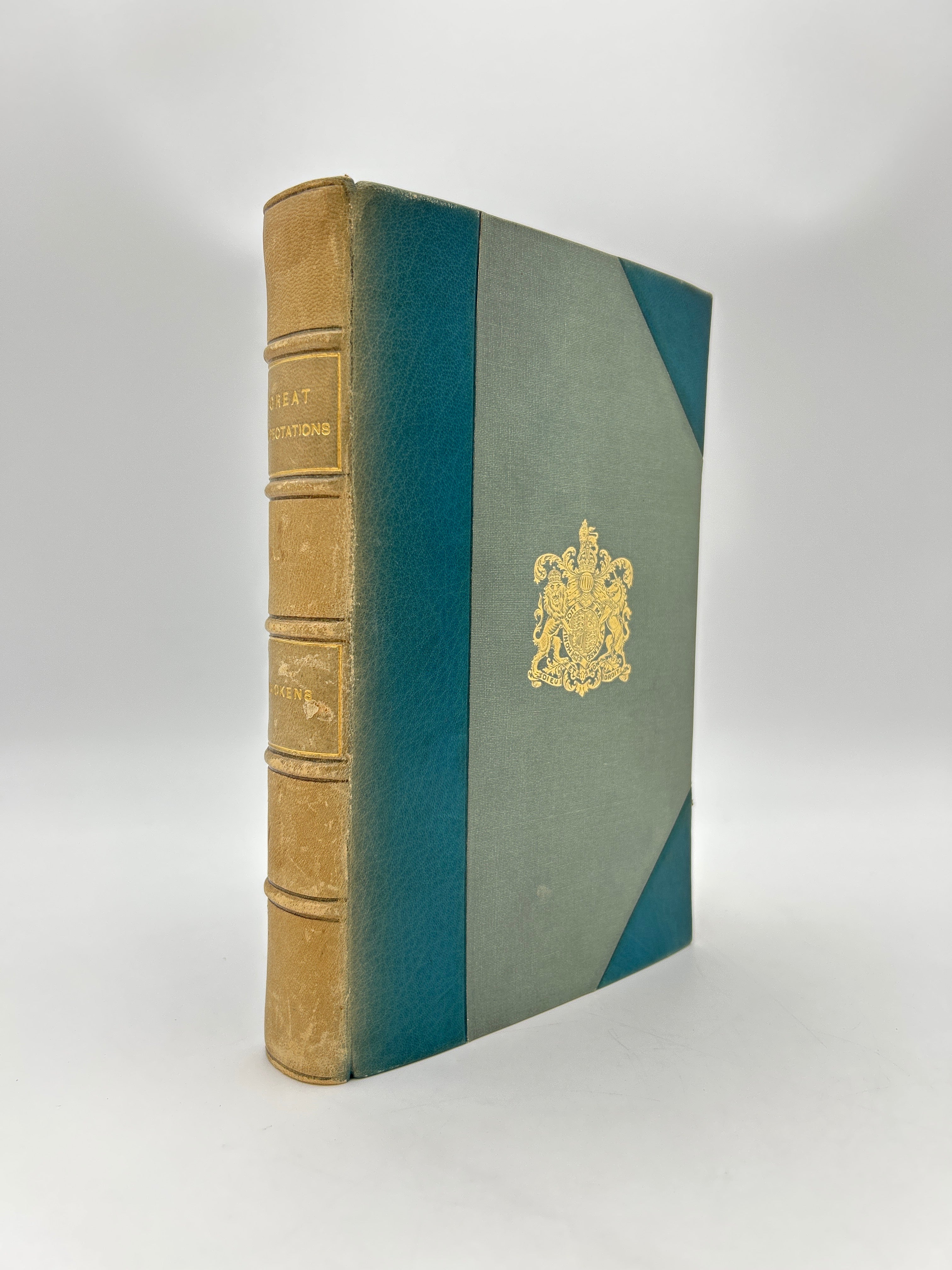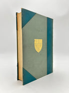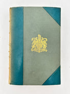 3/4 teal/fabric binding with gold insigna tooled on front cover, five raised bands on spine, spine sun faded to tan with gold tooling between bands, black and white illustrations, intact, good condition.