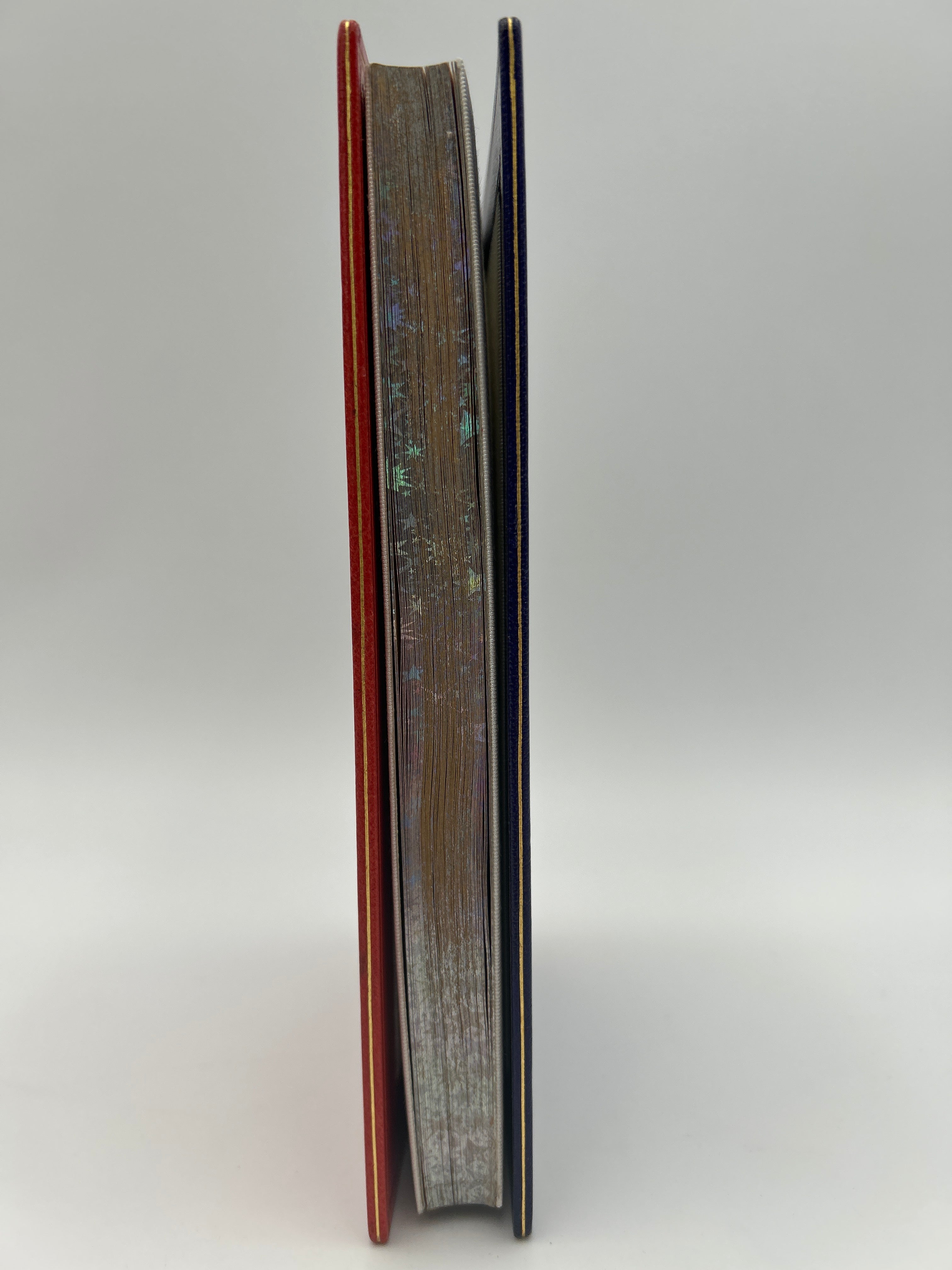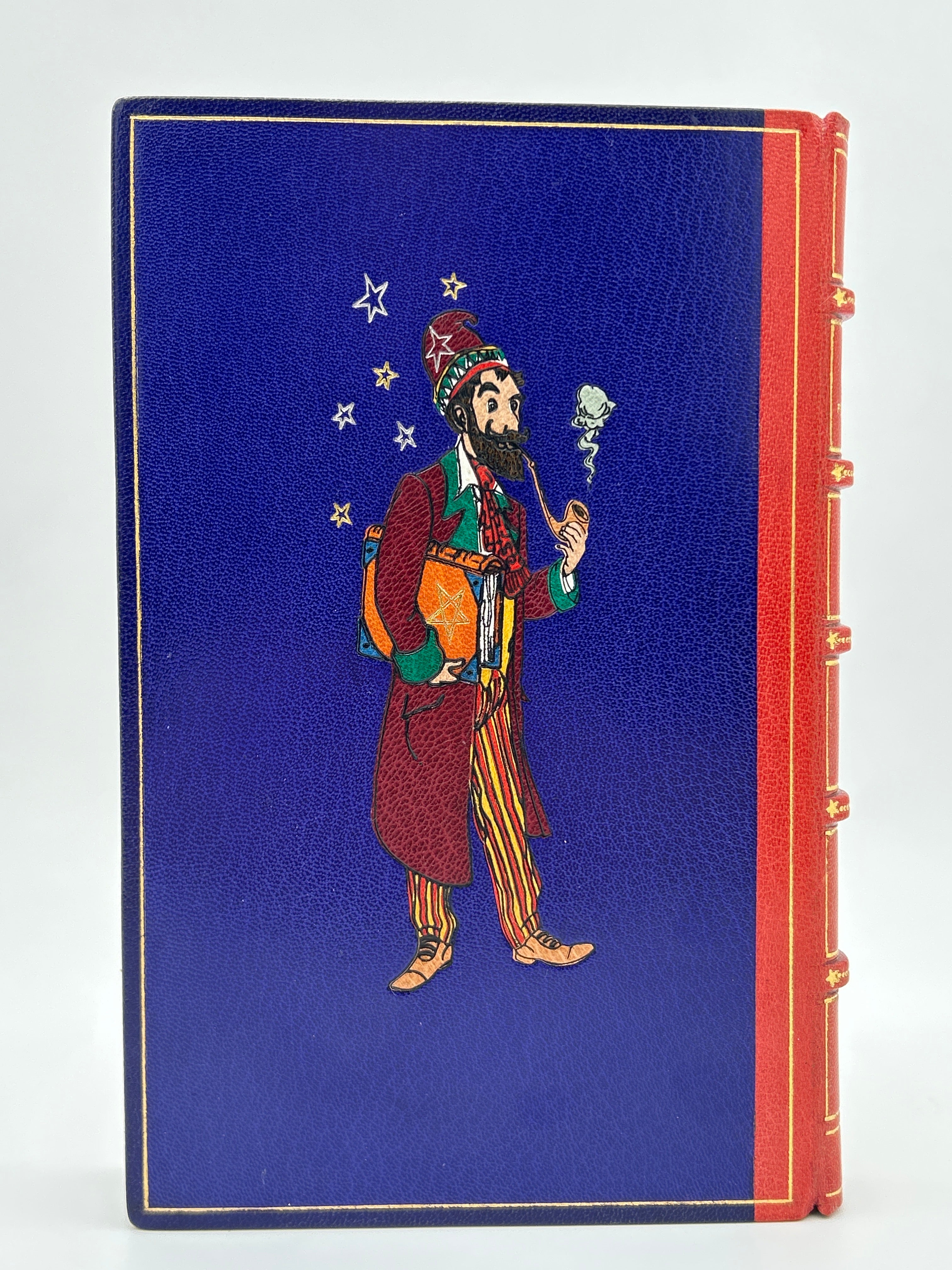 First edition, first impression (Bloomsbury Publishing Plc, 1997). One of 5,150 copies published simultaneously with the first hardback edition, of which there were reportedly 500 copies. All first impression issue points are present. This copy has been rebound in full color leather by The Chelsea Bindery. It features an orange morocco leather, spine lettered gilt with five raised bands, pictorial inlay of the original cover illustration with Harry Potter in front of the Hogwarts Express at the train station; including J.K. Rowling's gilt signature embossed underneath, royal blue morocco back cover featuring pictorial onlay of original illustration of Dumbledore, white pearl fabric endpapers, silver star holographic gilt edges.