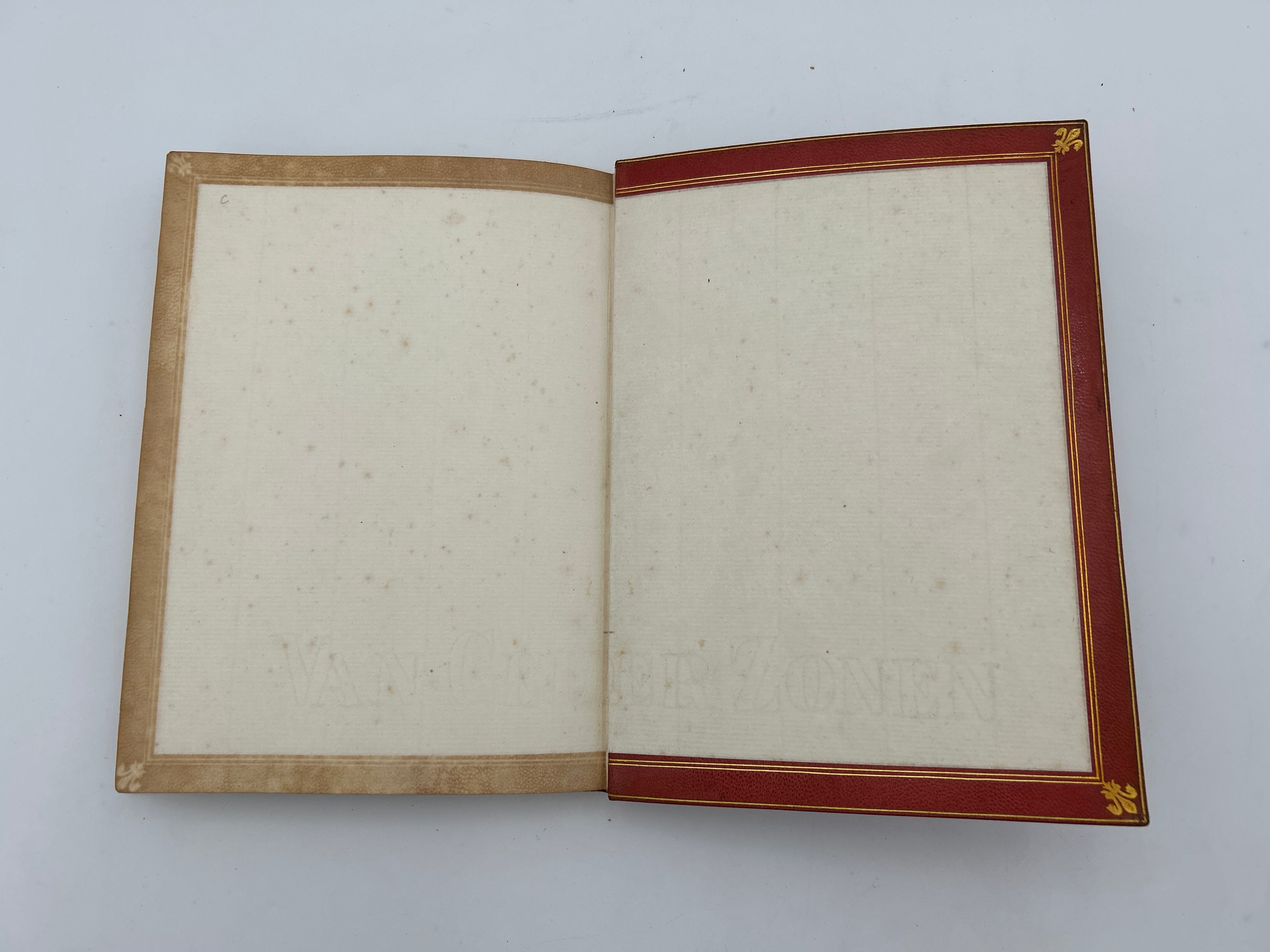 Rust pebbled leather cover, gold florentine fleur de lis embossing and lettering on spine, swelling on the boards, overall good condtion.