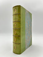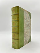 These beautiful 3/4 green leather and marbled paper bound, inside front and back papers marbled, three edge gild, intact, five raised bands on spine with gold tooling title plate, spine is faded brown on first vol spine, overall good condition.