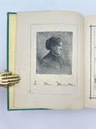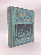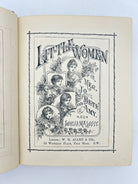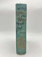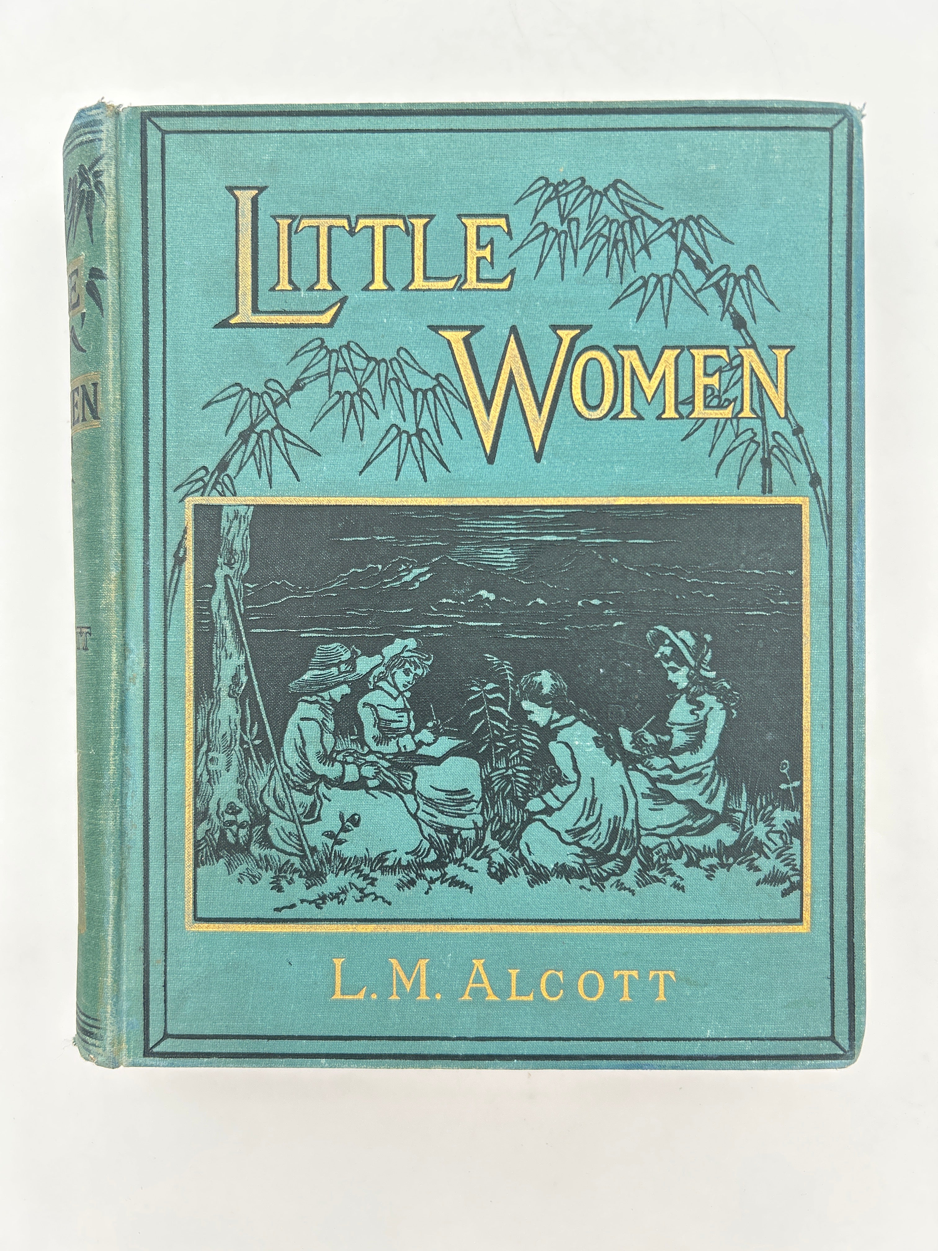 Blue/green cloth cover with beautiful illustration tooled on front of the four Alcott girls, intact, slight detach on front inside, otherwise good condition.