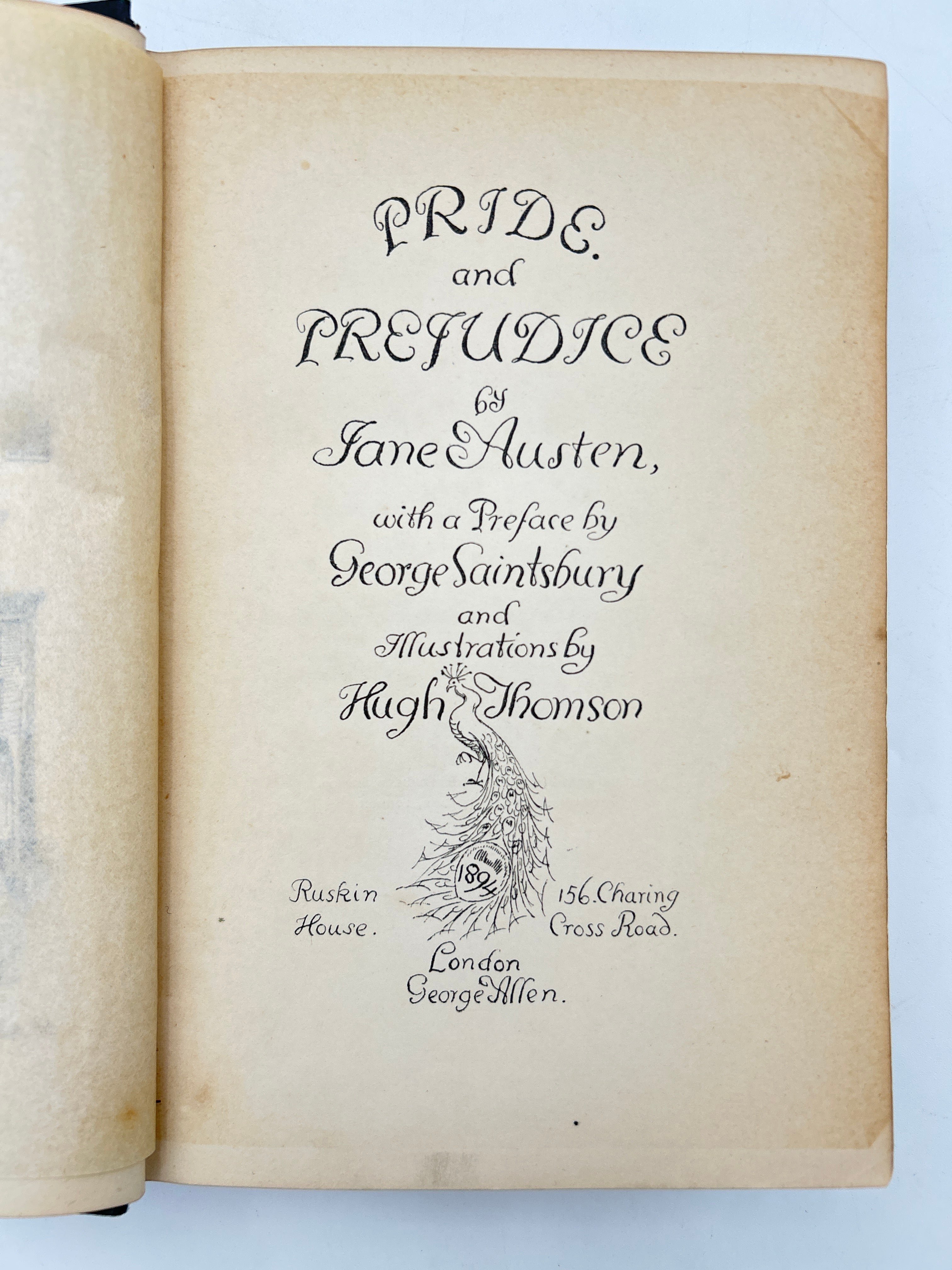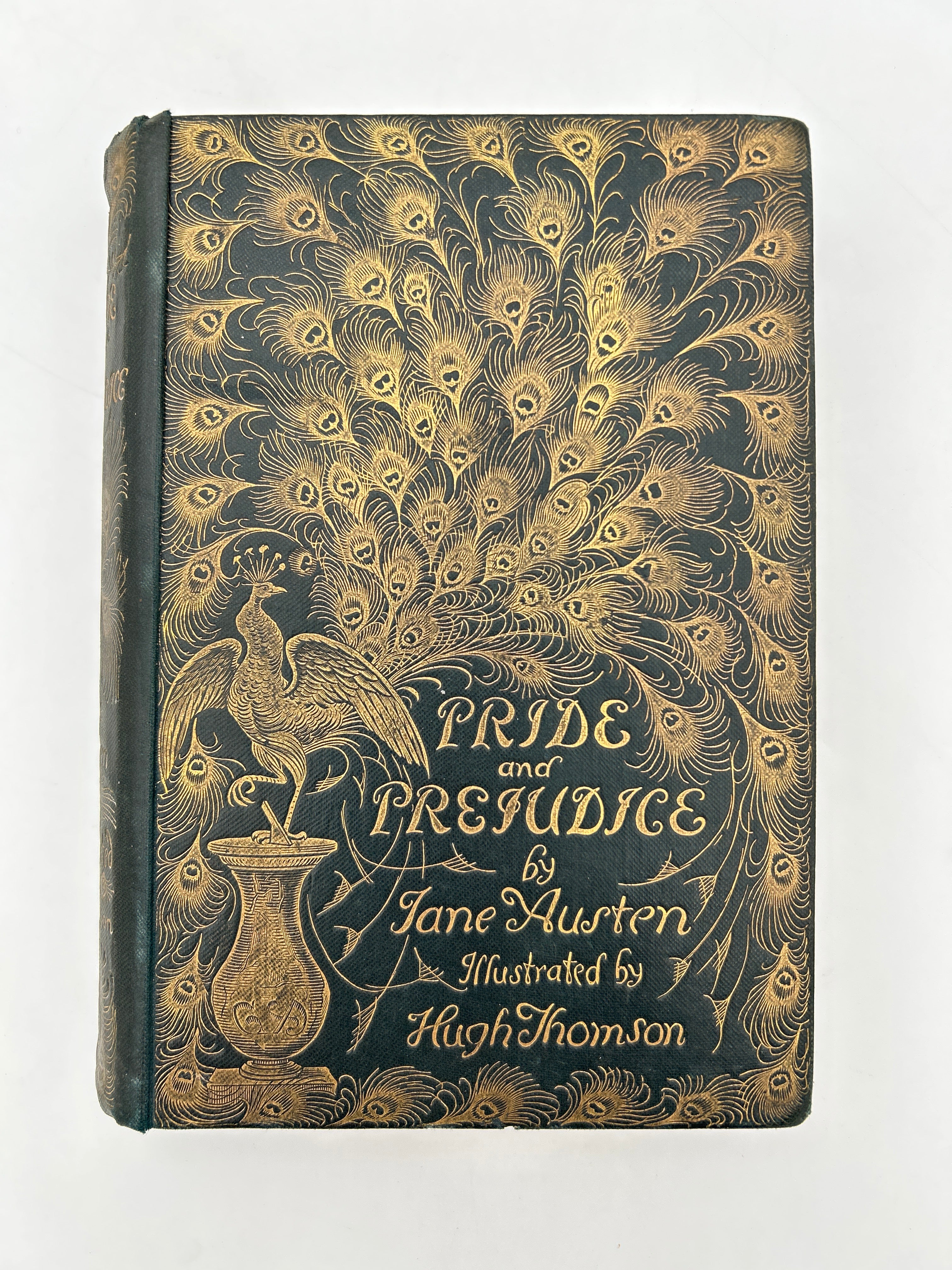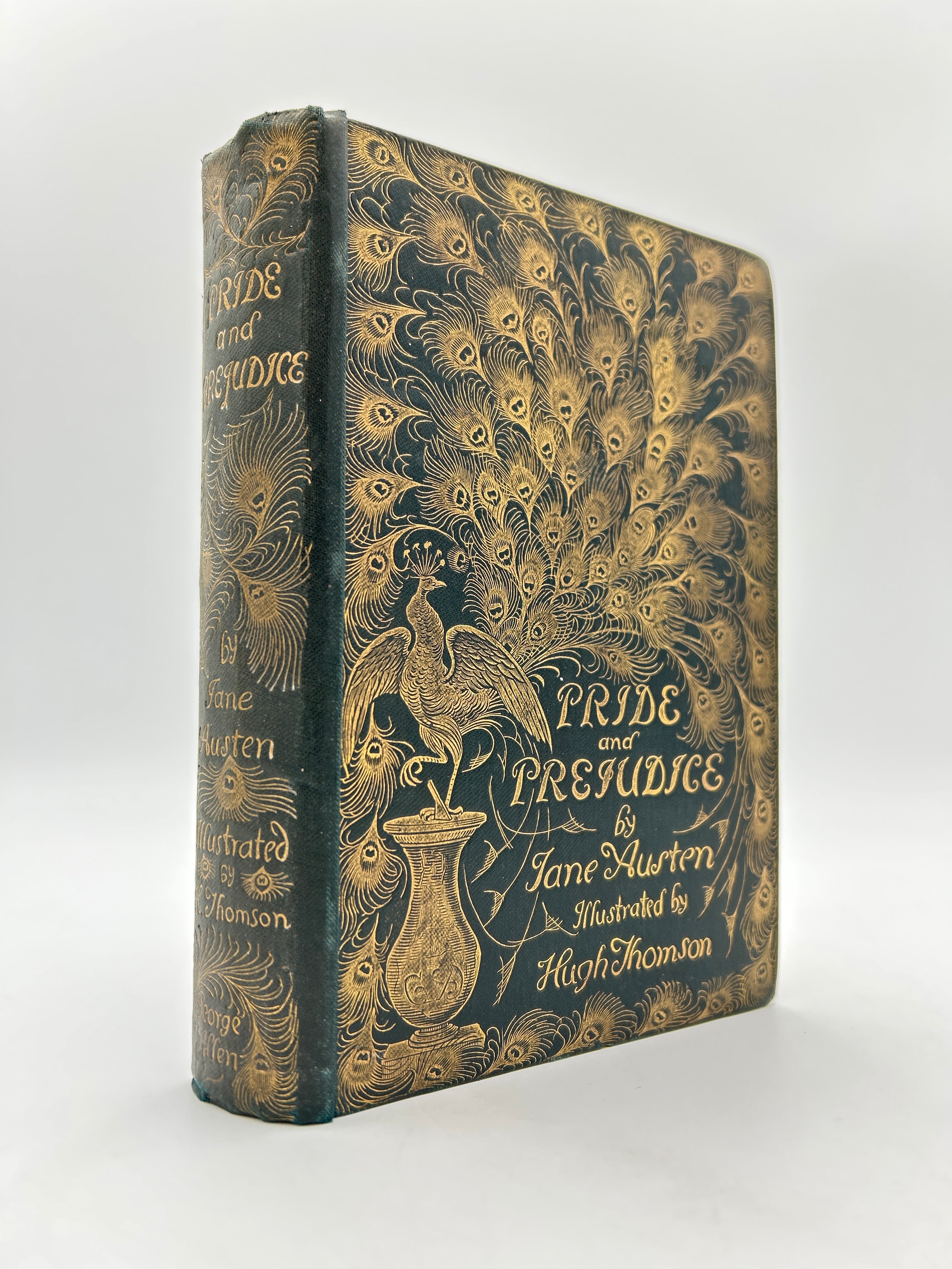 The 1894 Peacock Edition of Pride and Prejudice, written by Jane Austen and published by George Allen, is one of the most celebrated and visually striking printings of the novel. Although the story was originally published in 1813, this special edition became famous for Hugh Thomson’s exquisite illustrations and its lavish cover design: a shimmering gilt peacock perched on an ornate vase, spreading its tail across the deep green cloth binding. Thomson’s detailed drawings capture the wit, charm, and social nuance of Austen’s world, enhancing the experience of Elizabeth Bennet and Mr. Darcy’s timeless romance. Today, the Peacock Edition is regarded as a masterpiece of Victorian book design and is highly sought after by collectors for its artistic craftsmanship and enduring literary significance.