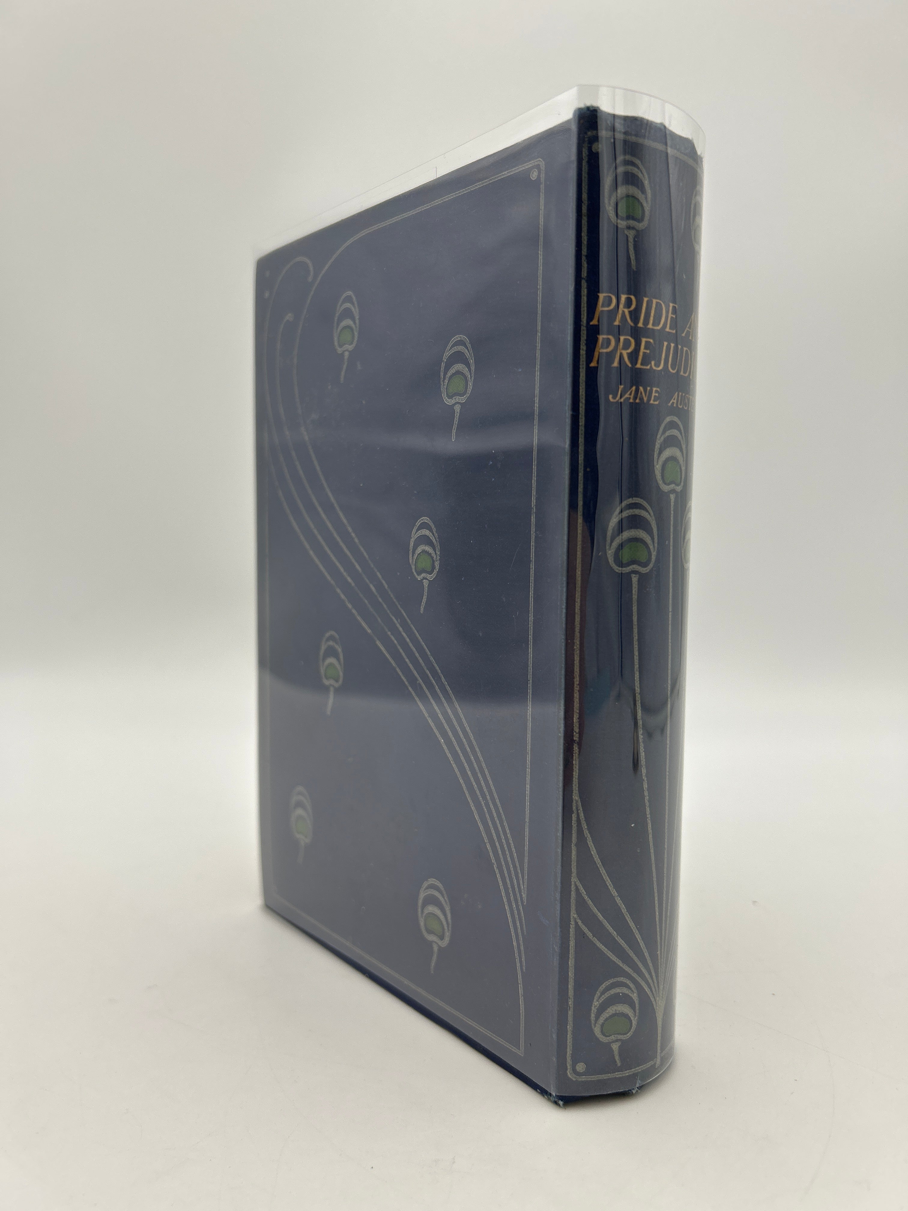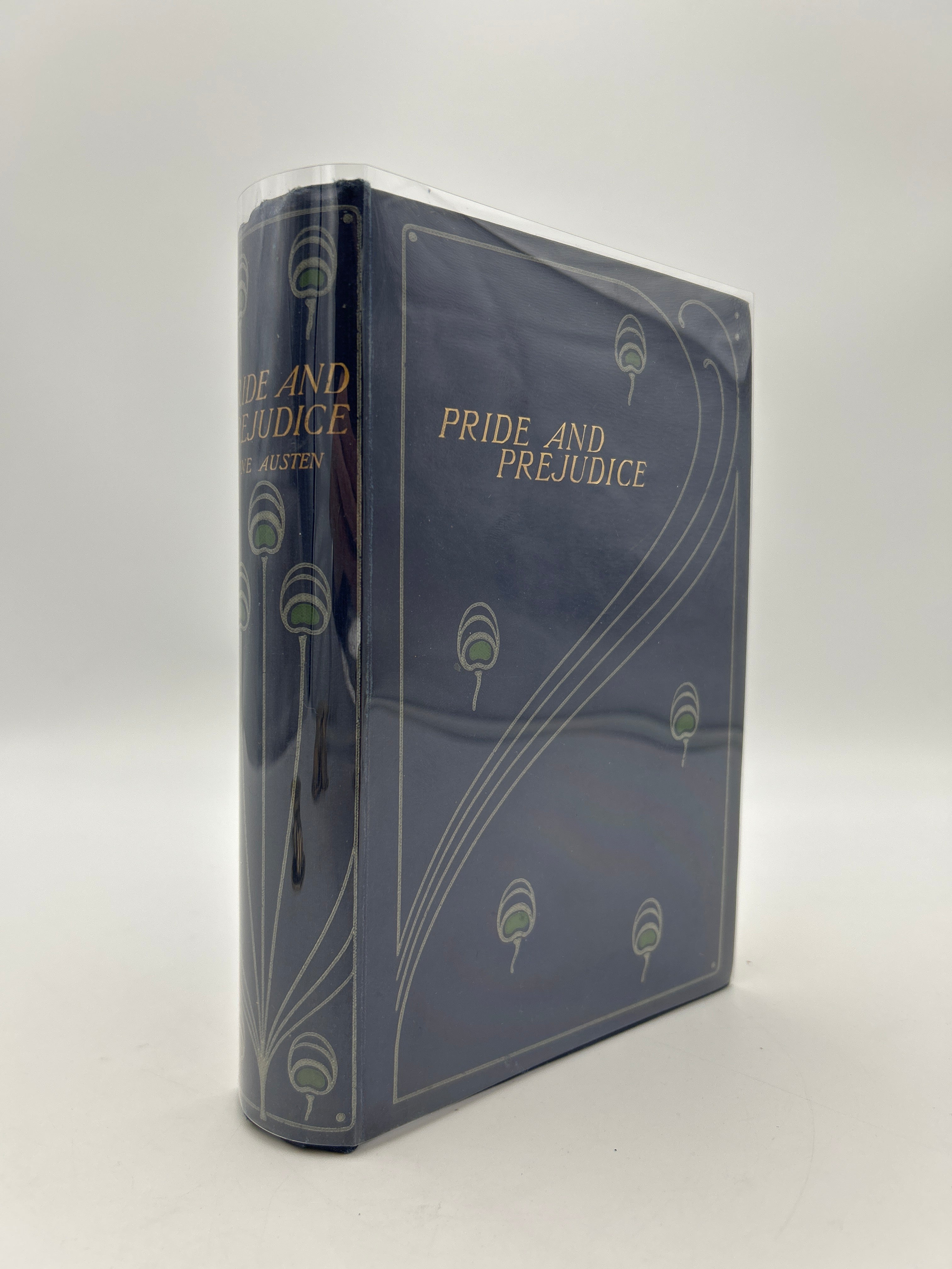 Blue cloth Talwin Morris binding reminiscent of the peacock edition with the green and white feather-like design. Gilt lettering on upper board and spine. Grey endpapers. Six full page black and white illustrations by Chris Hammond the first identified female illustrator of Austen’s works. Minimal scuffing to lower board. Bumping to the points. Softening to upper and lower spine. Some wear to the binding but fully intact. Fine condition overall.