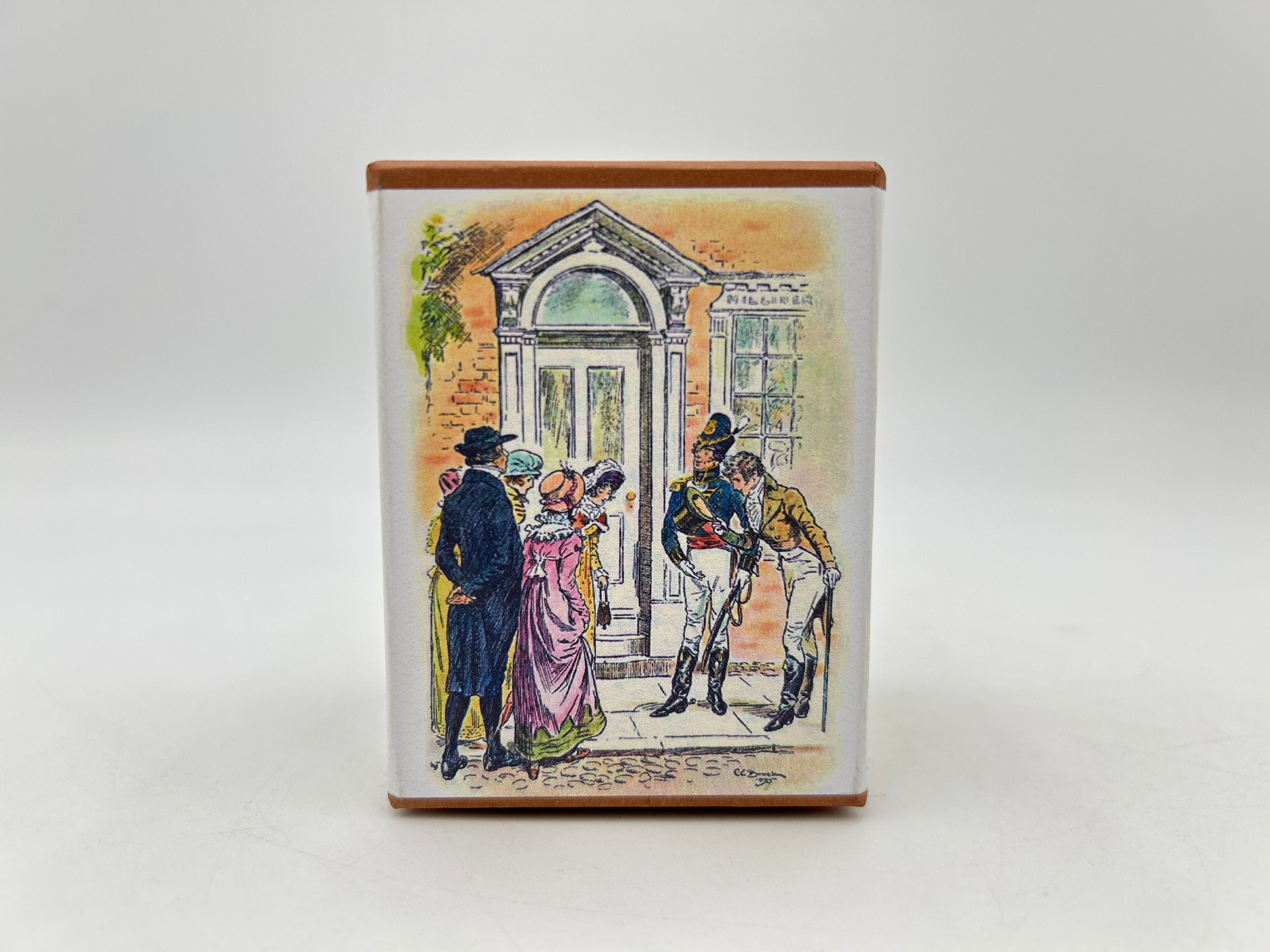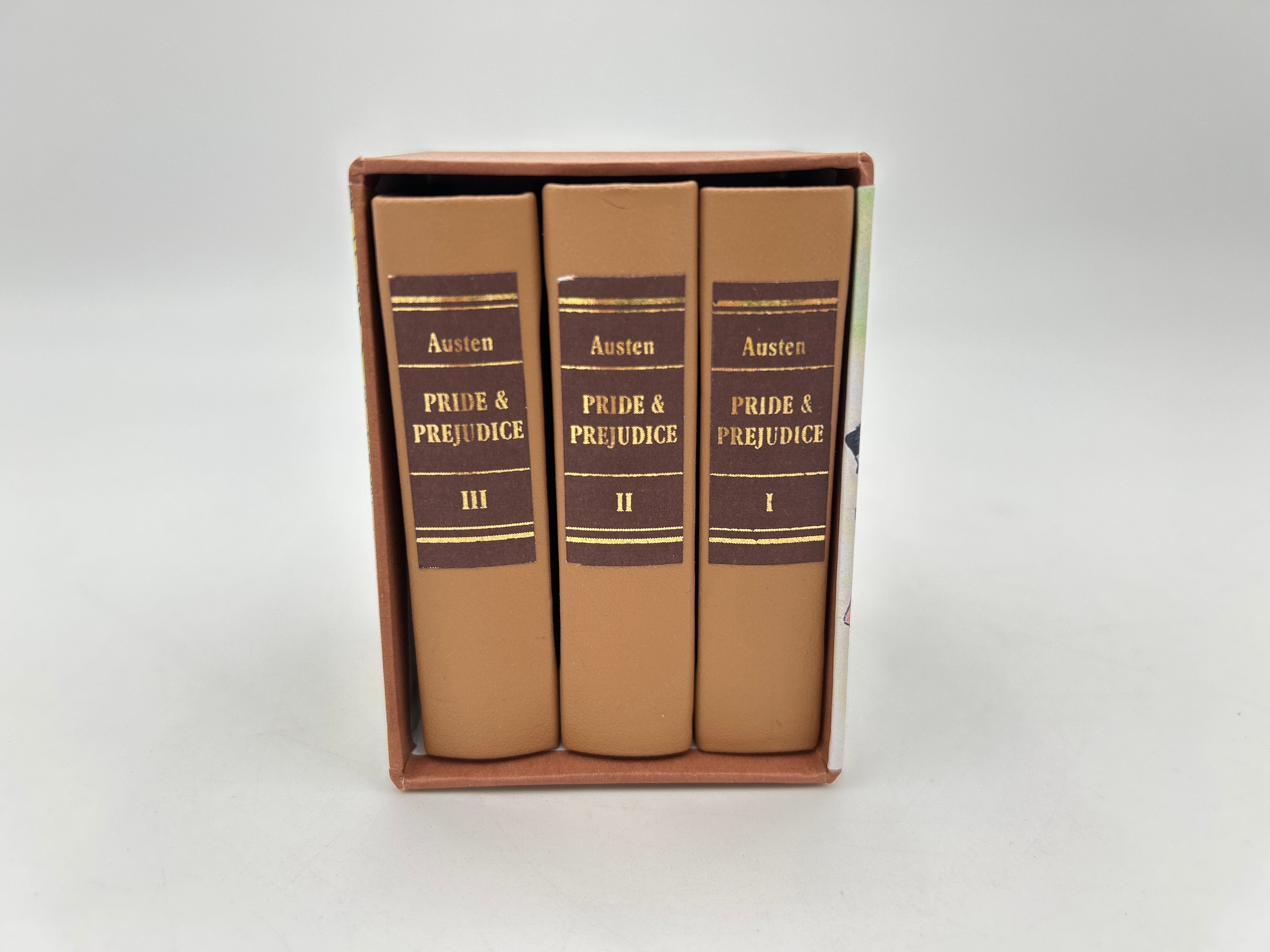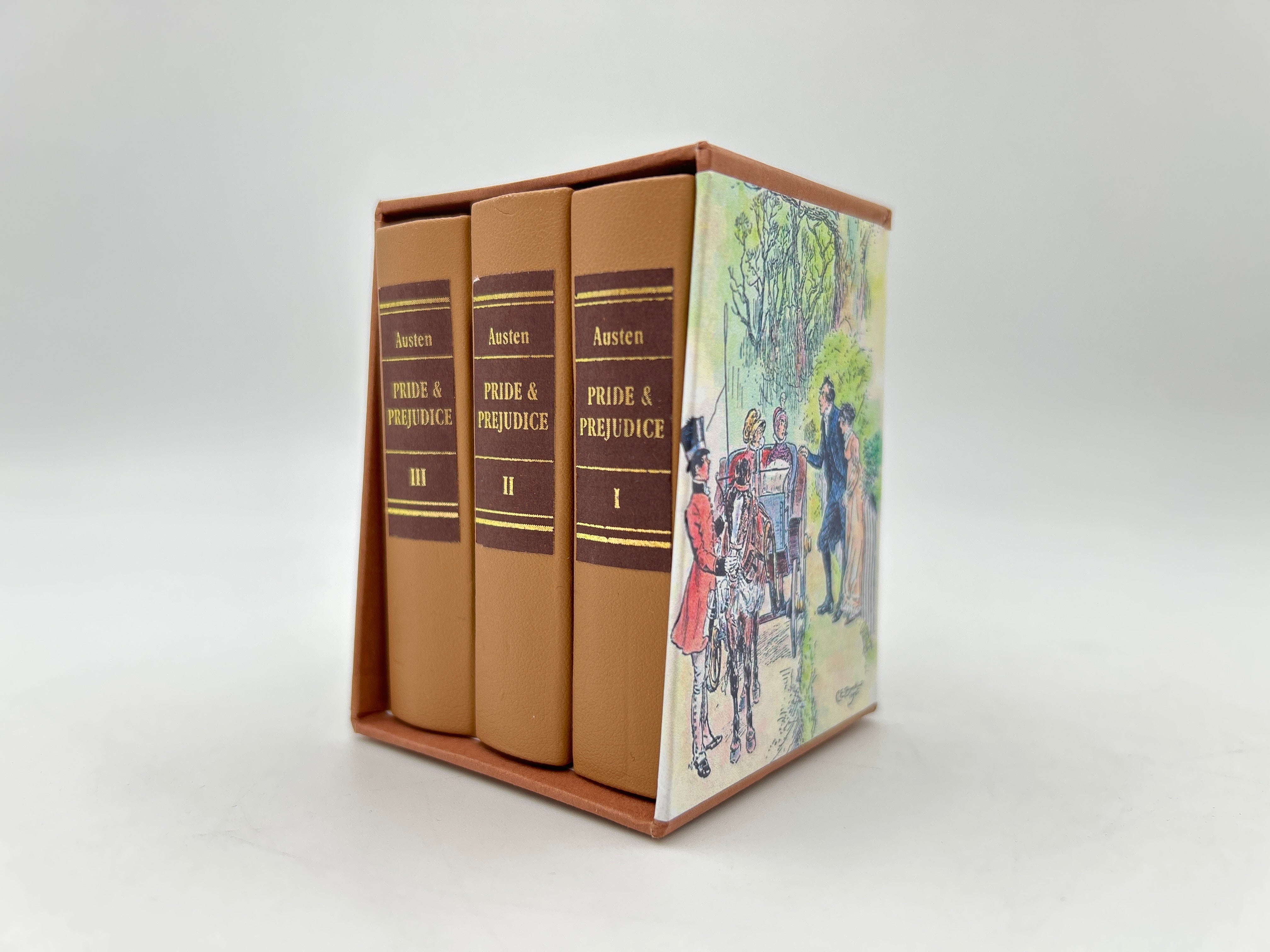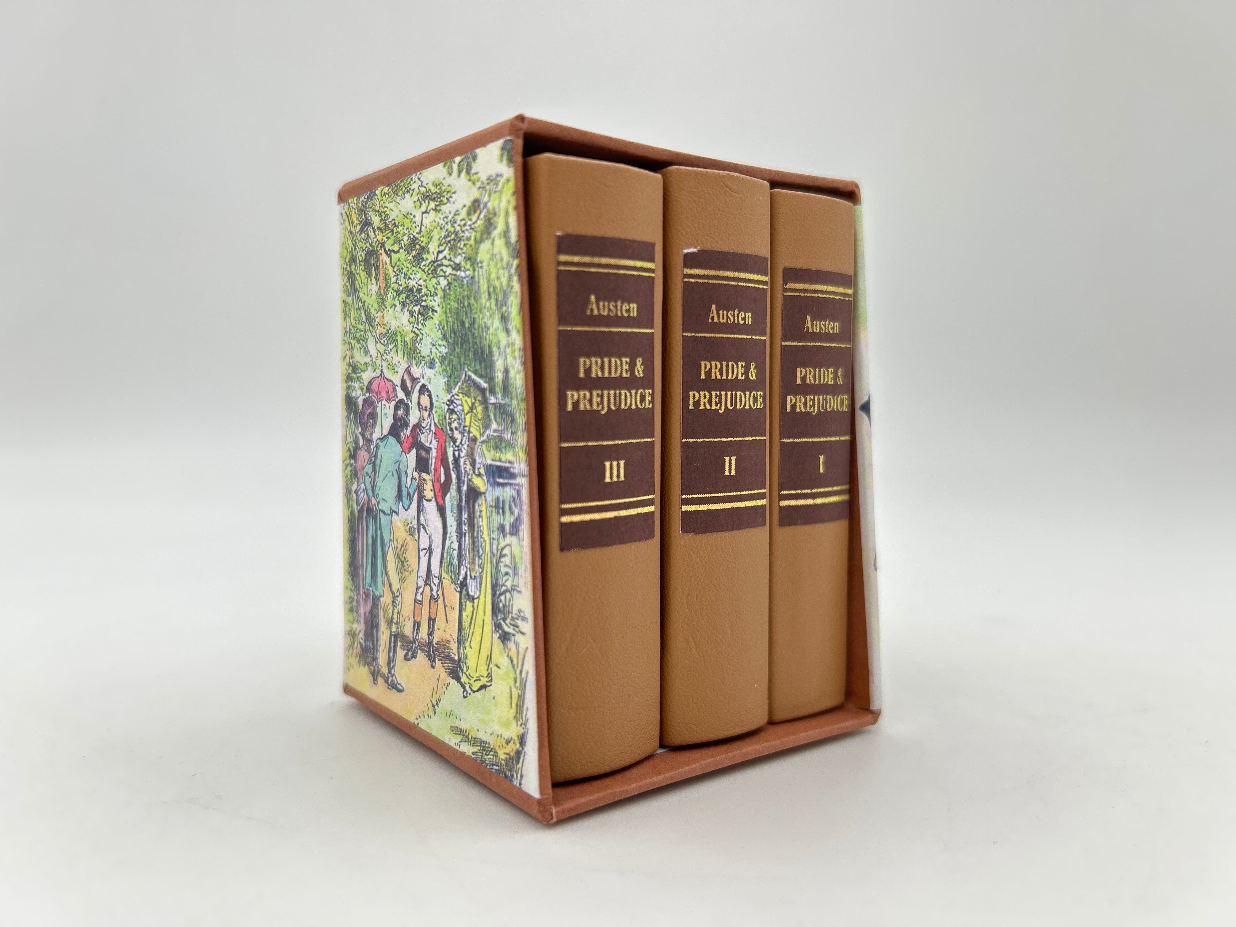 Three volume set ofJane Austen's 1813 Pride and Prejudice. Like new condition neatly encased in a miniature box with illustrations surrounding the encasing.