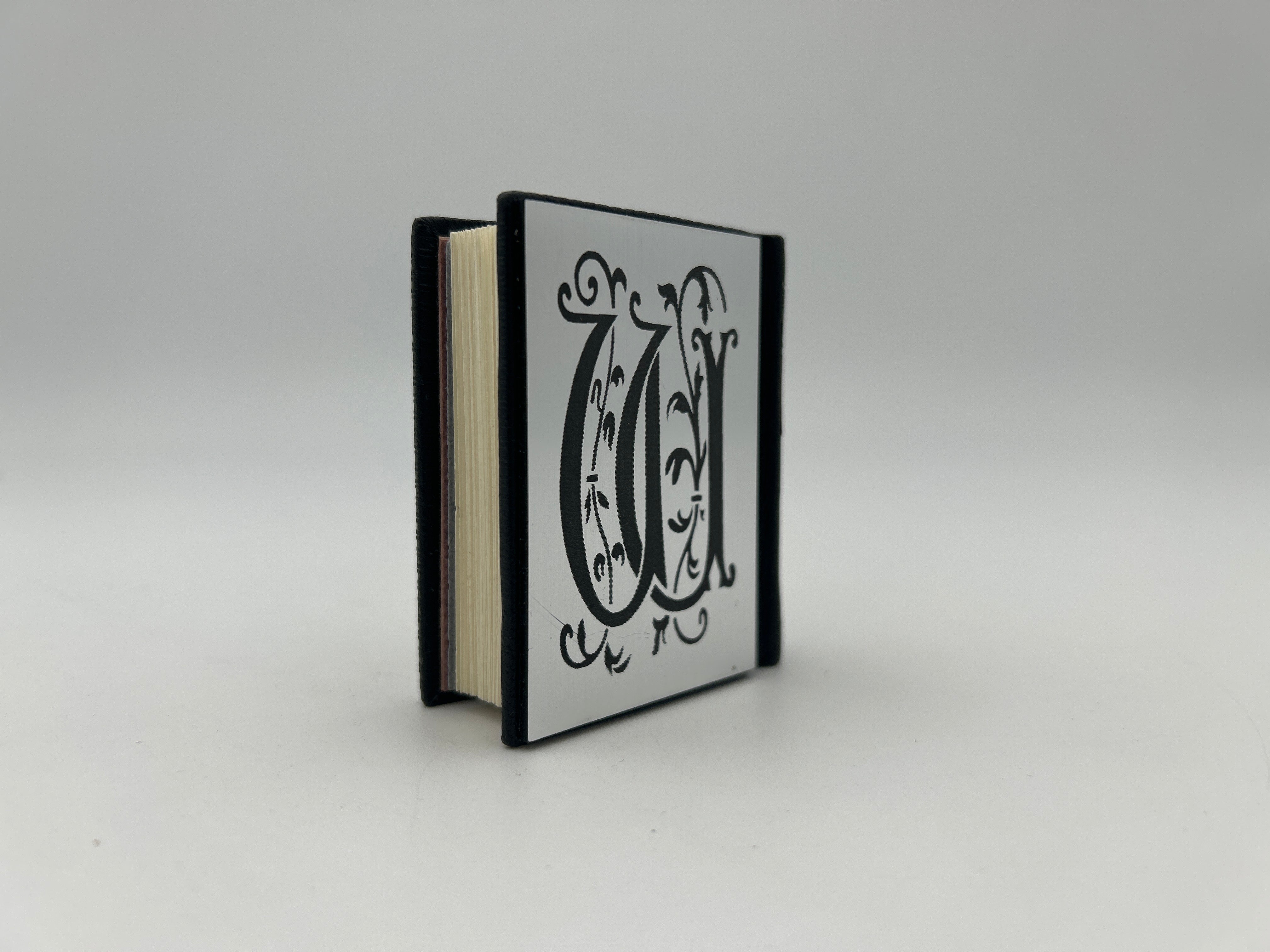 Beautiful miniature handcrafted with silver plate on the front and back, title in burgundy with sliver lettering, black leather binding, NEW