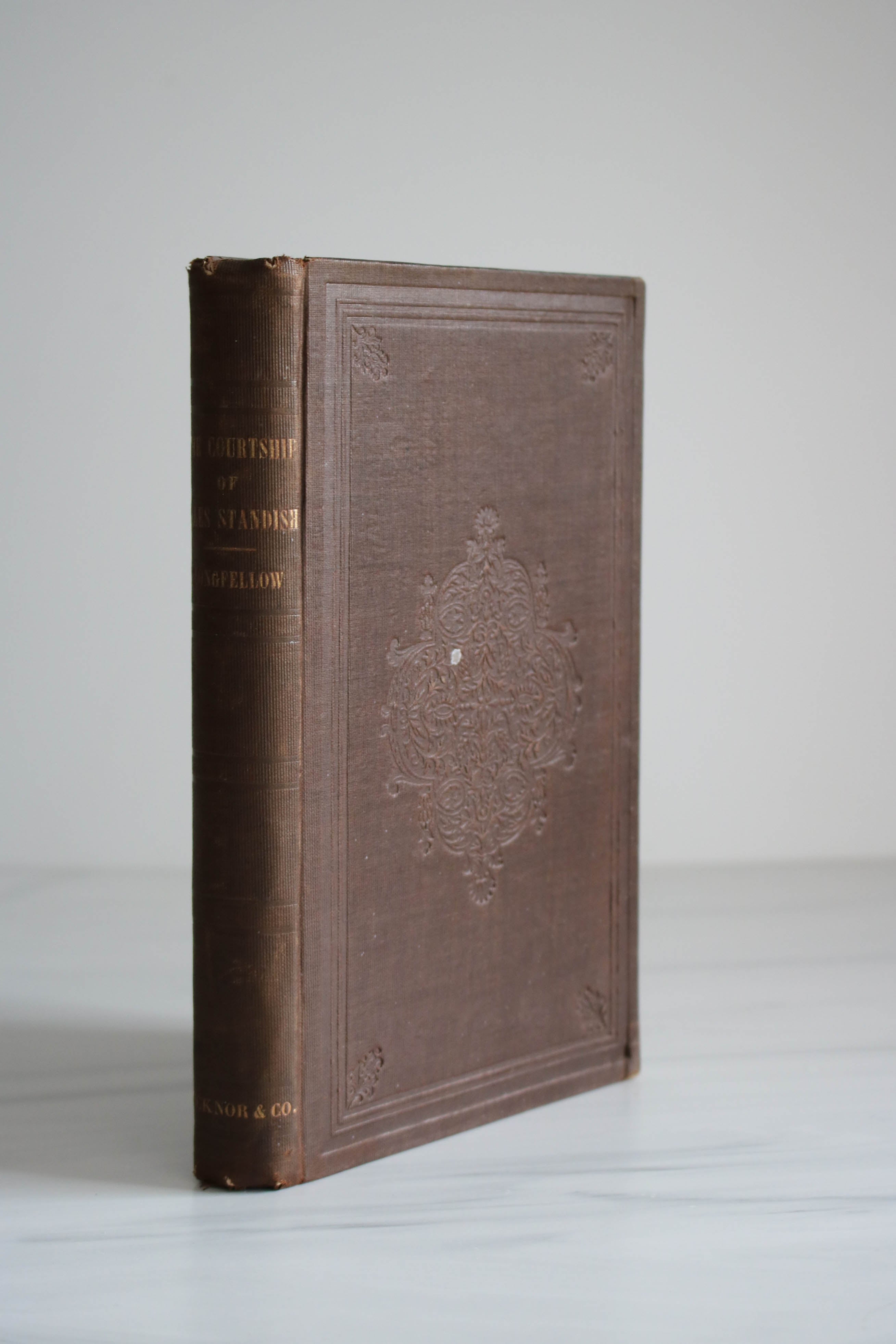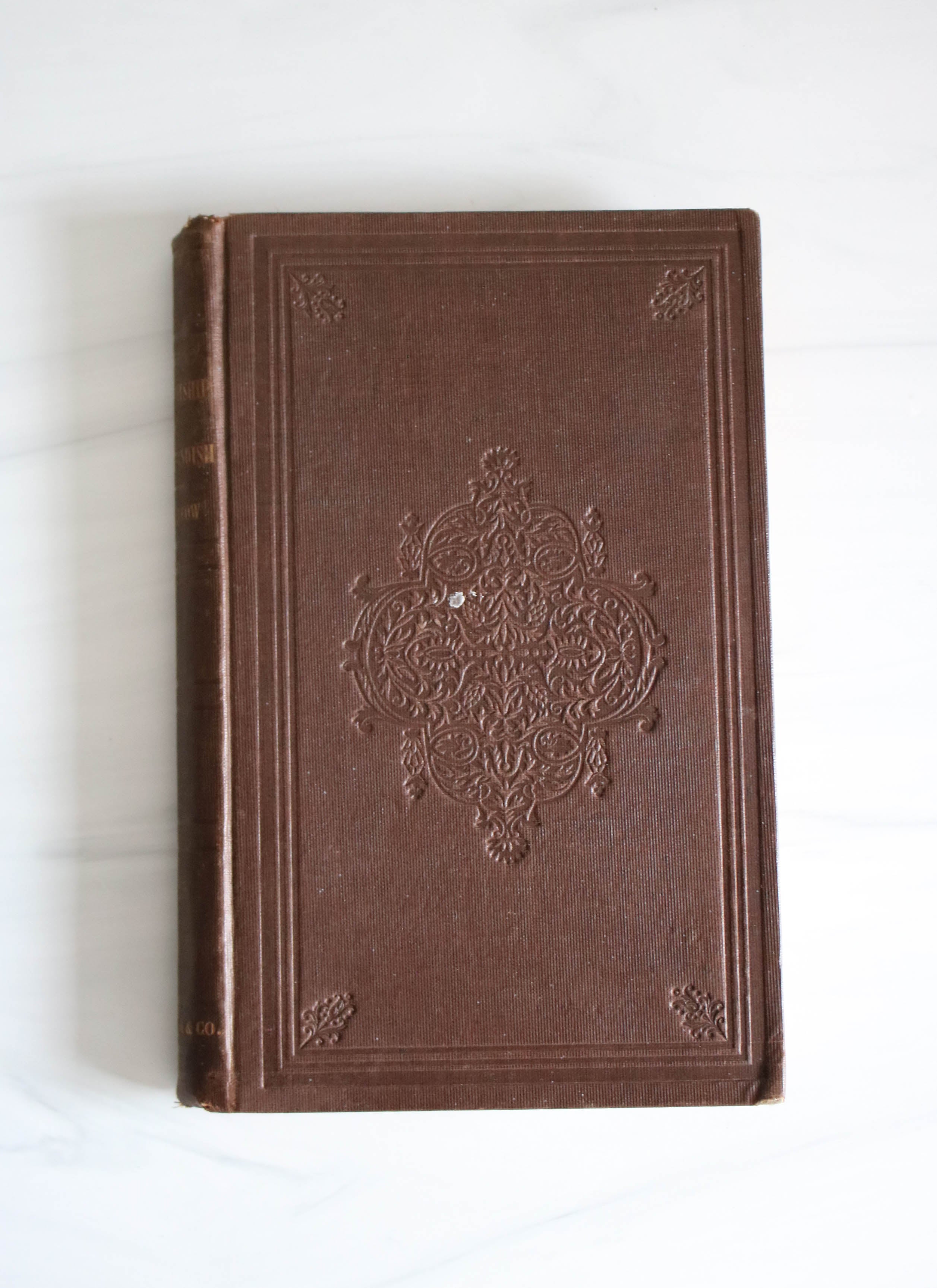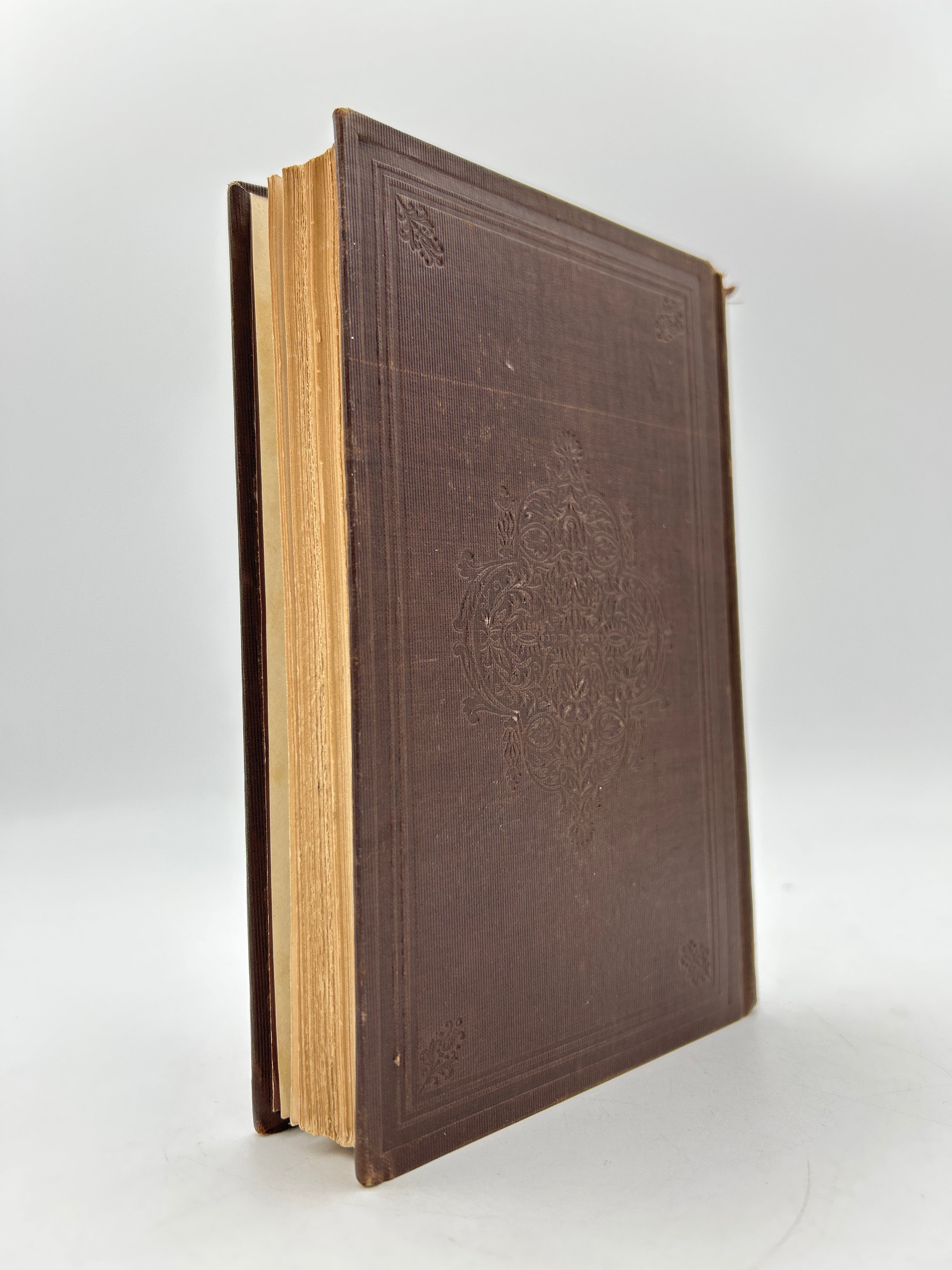 Brown cloth cover with embossing and tooling, intact, good condition.