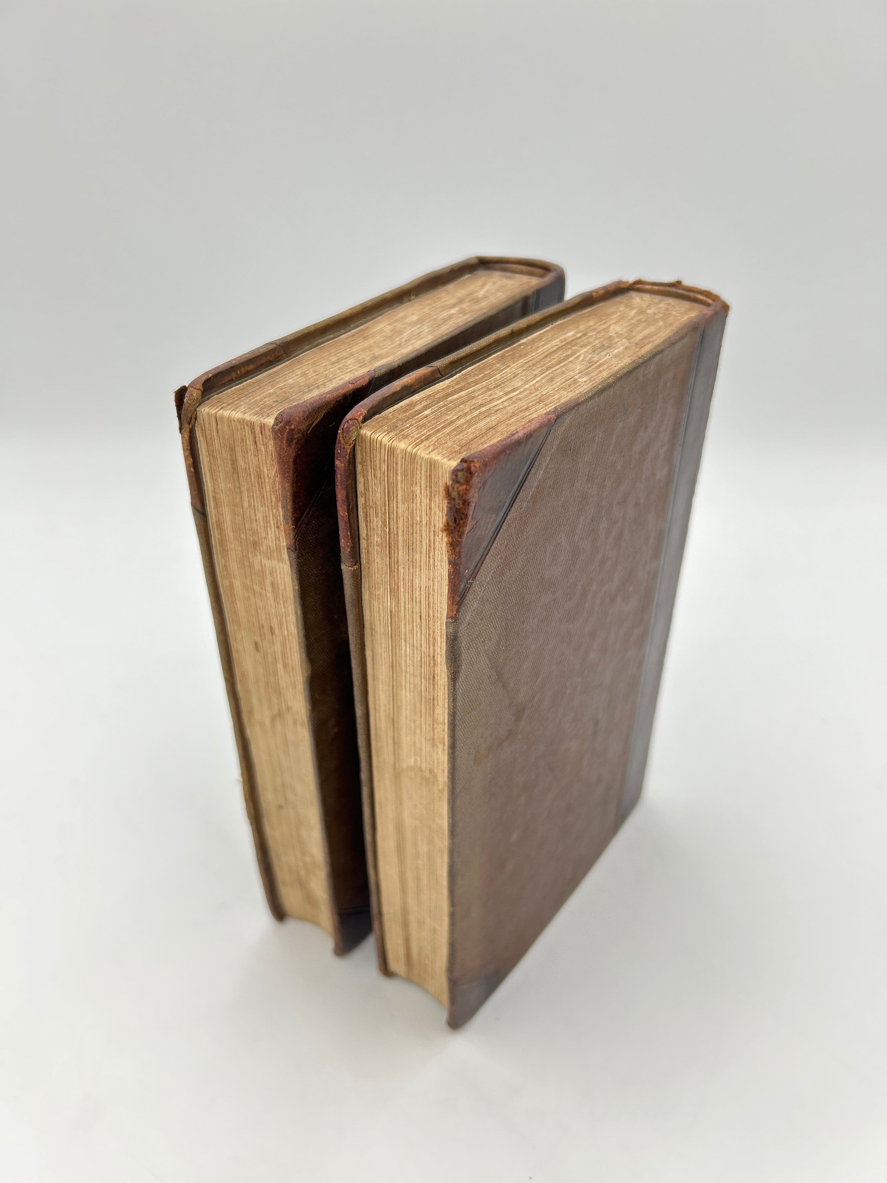 Brown 3/4 leather with cloth front and back, burgundy label with gold lettering on spine, five raised bands on spine, intact, good condition.