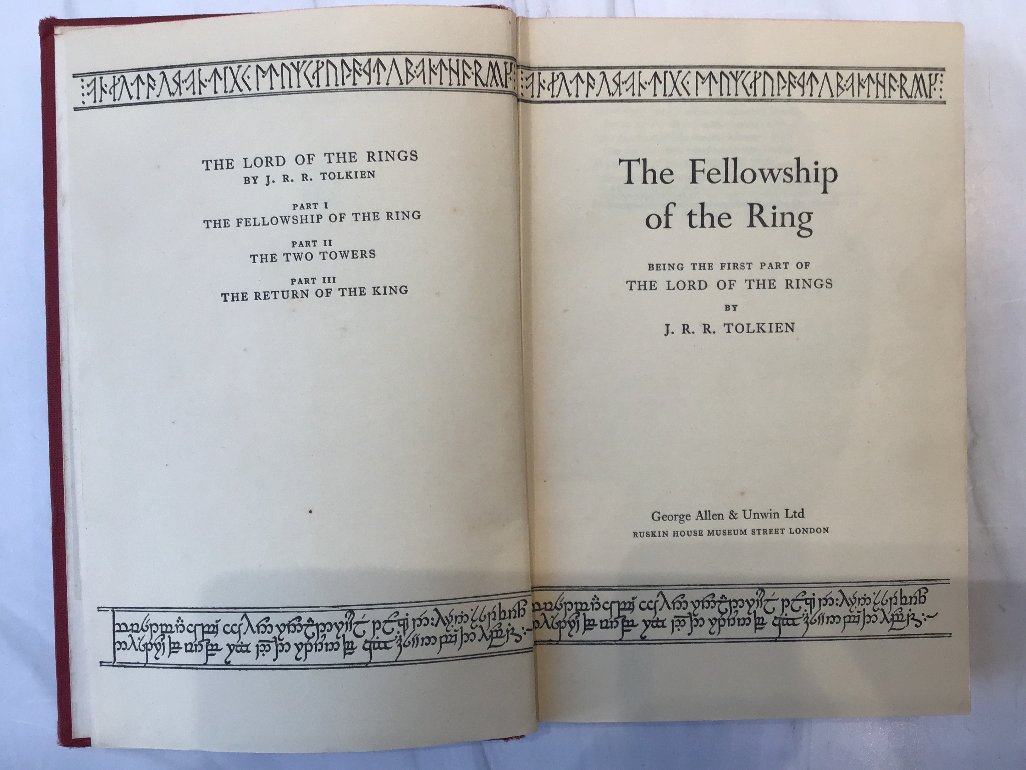 Fellowship: Strong wear and rubbing along the bottom edges of the binding. Gold embossed title and author on the spine.Half inch tear on spine in top right corner; cloth on left side of the spine is torn along the length of the spine. Binding beginning to break away from spine. Glue from the Tolkien letter has begun to fail from the left top corner. Letter is still attached to cover. Easily repairable breakage. Discolored water spot on the top corner of front cover.