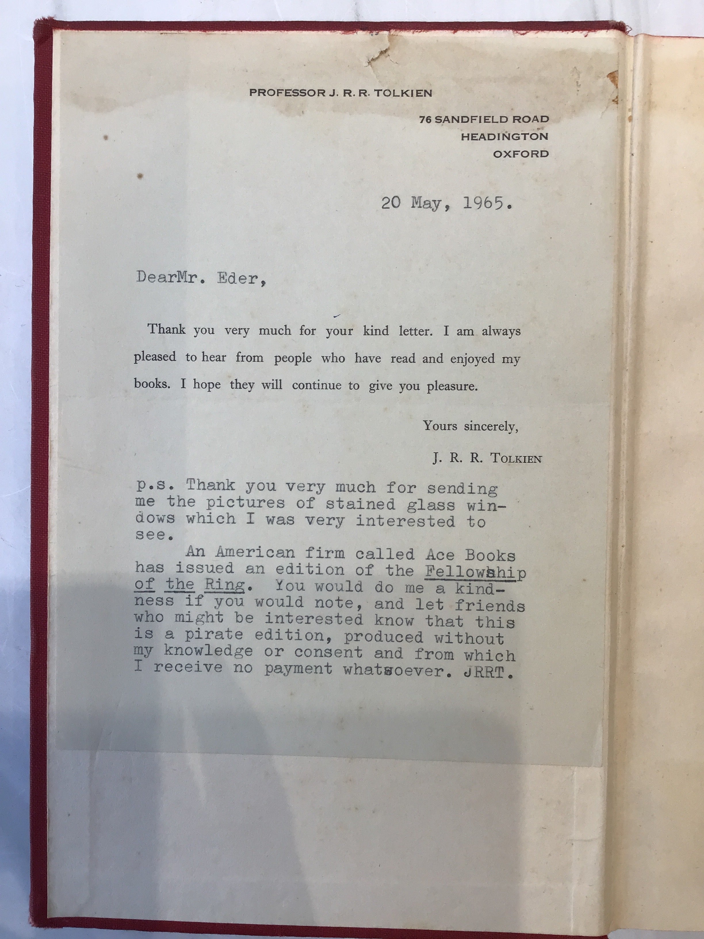 "Dear Mr. Eder,/ Thank you very much for your kind letter. I am always pleased to hear from people who have read and enjoyed my books. I hope they will continue to give you pleasure./ Yours sincerely, J. R. R. Tolkien/ p.s. Thank you very much for sending me the pictures of stained glass win-dows which I was very interested to see./ An American firm called Ace Books has issued an edition of the Fellowship of the Ring. You would do me a kind-ness if you would note, and let friends who might be interested know that this is a pirate edition, produced without my knowledge or consent and from which I receive no payment whatsoever. JRRT."