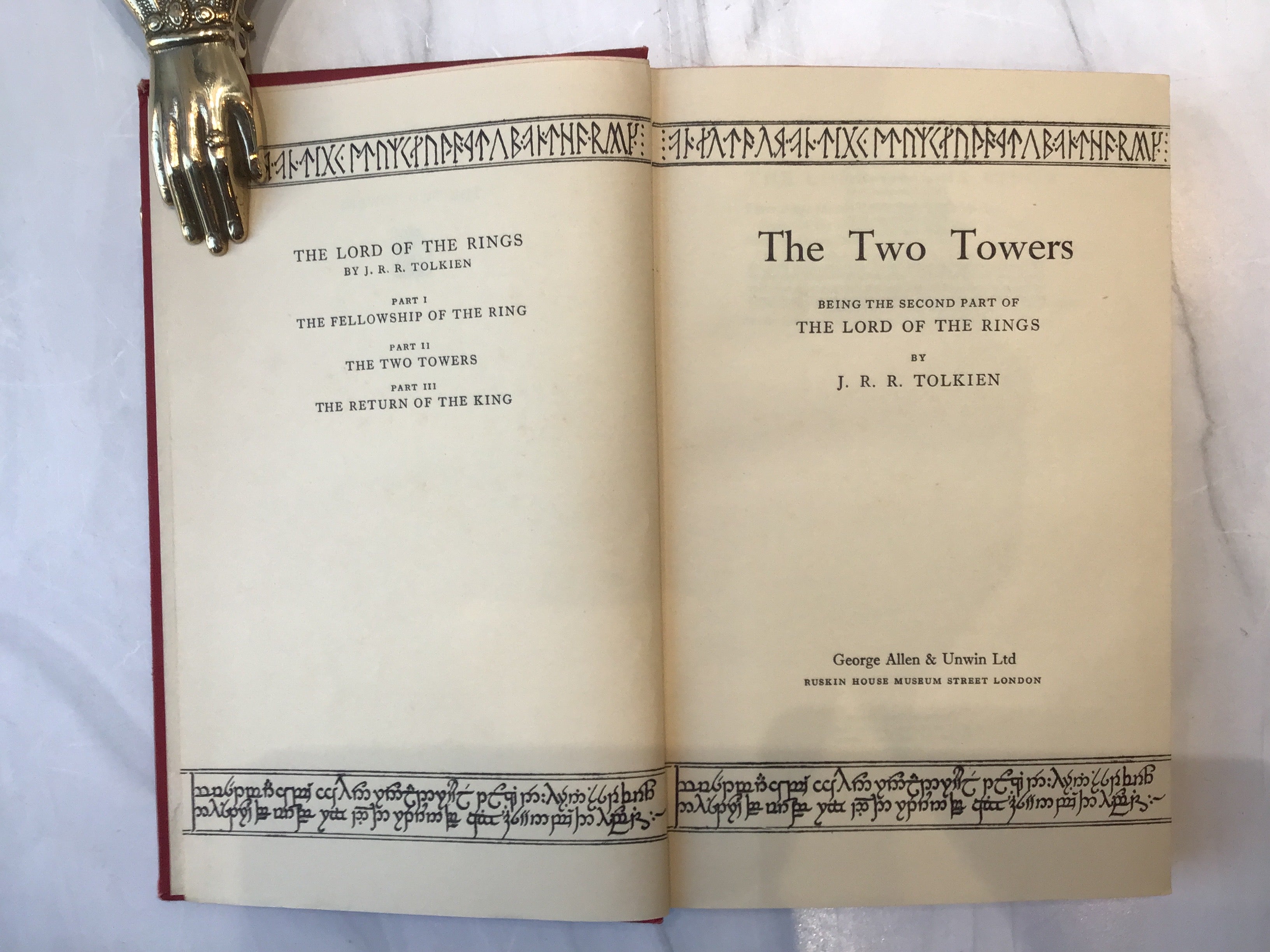 Two Towers: Some wear and rubbing on the red cloth corners and tops and bottoms of spines. Silver embossed title and author on the spine. Some slightly faded/discolored water spots on front and back covers.