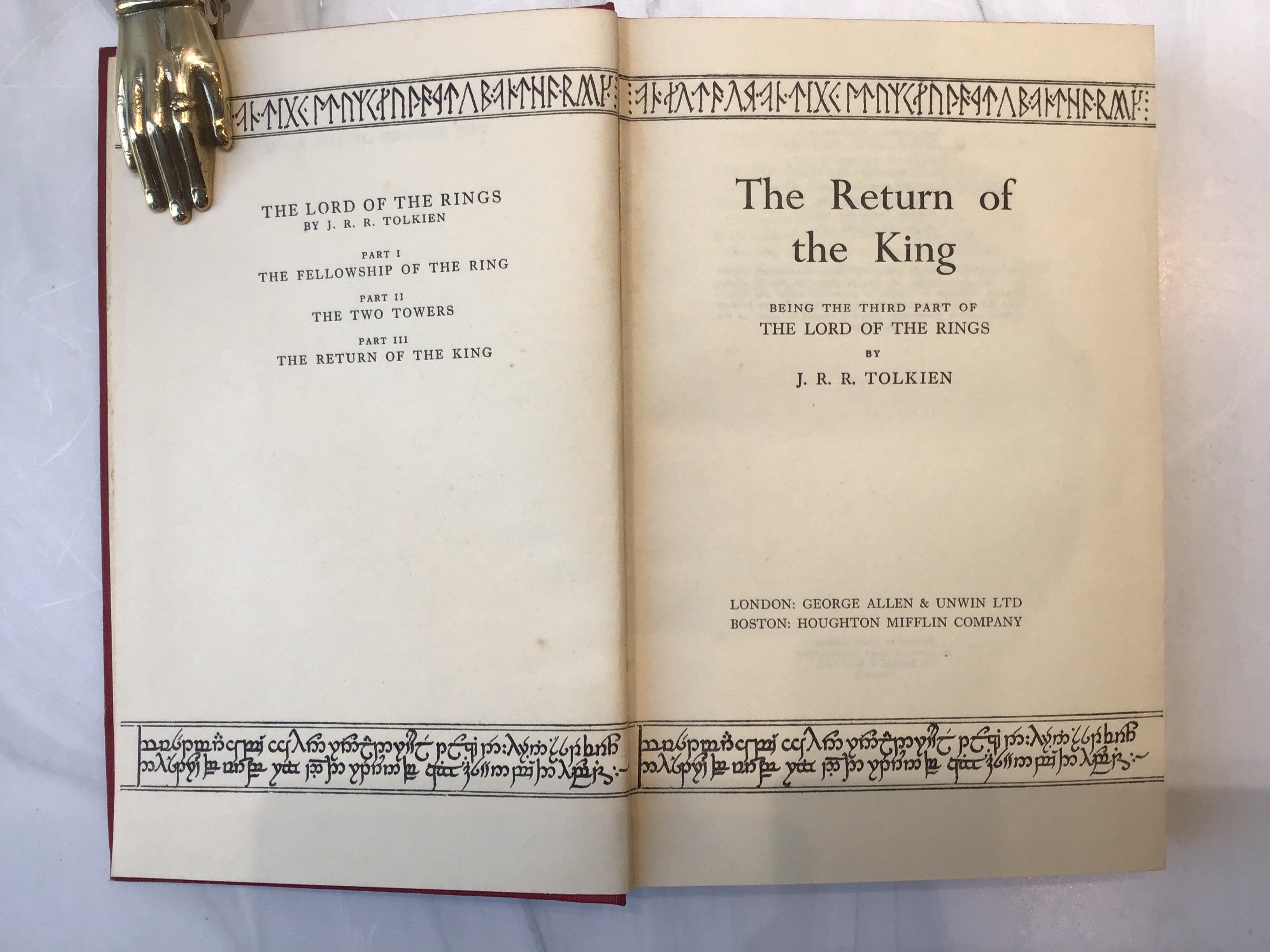 Return of the King: Some wear and rubbing on the red cloth corners and tops and bottoms of spines. Gold embossed title and author on the spine. Some slightly faded/discolored water spots on front and back covers.